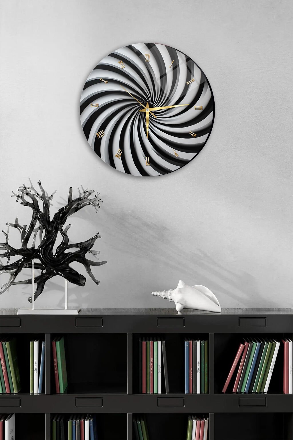 KIRILMAZ CAM DUVAR SAATİ, HEM TABLO HEM SAAT SİYAH BEYAZ SPİRAL OPTİK DESEN EV OFİS HEDİYESİ