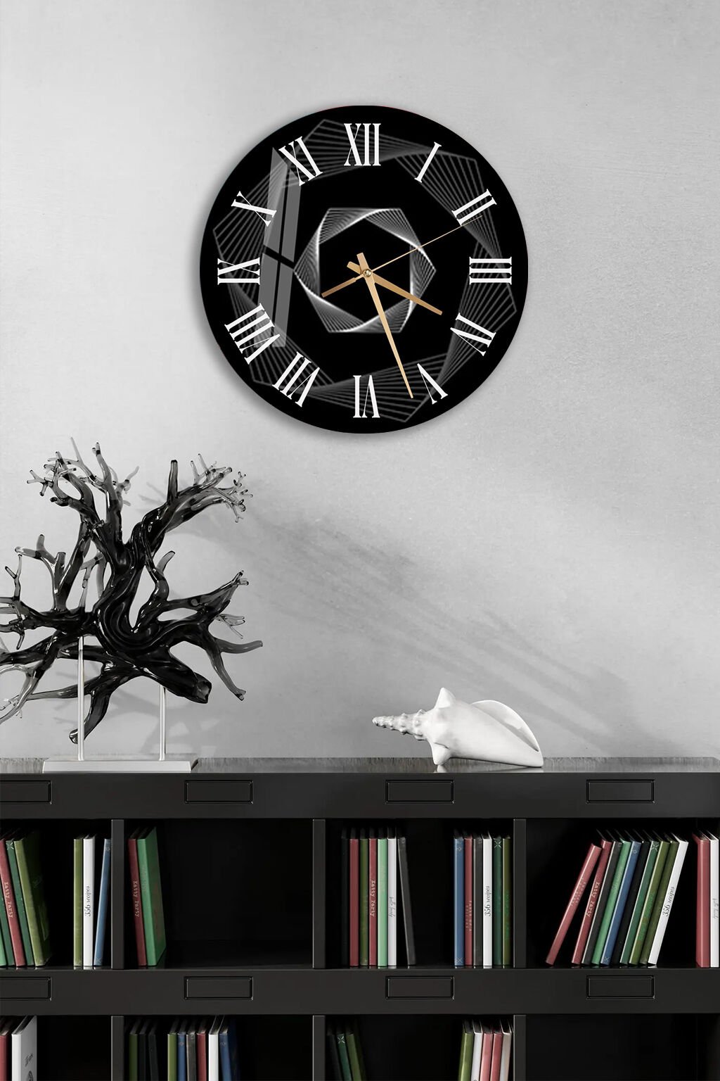 KIRILMAZ CAM DUVAR SAATİ, HEM TABLO HEM SAAT SİYAH GEOMETRİK SPİRAL MODERN EV OFİS HEDİYESİ
