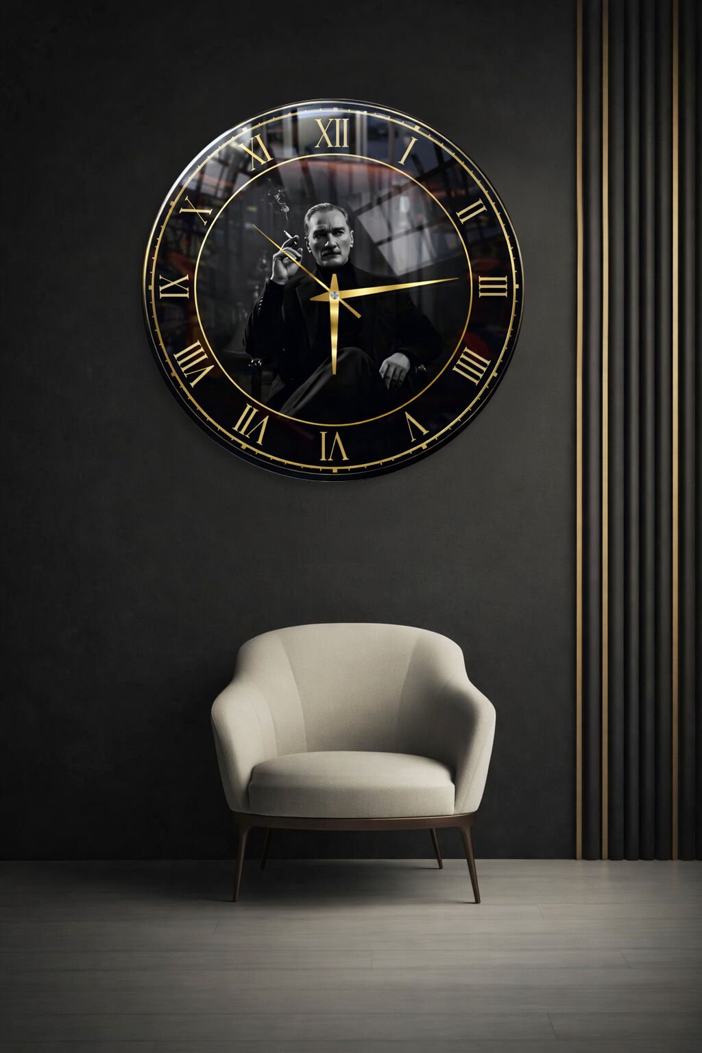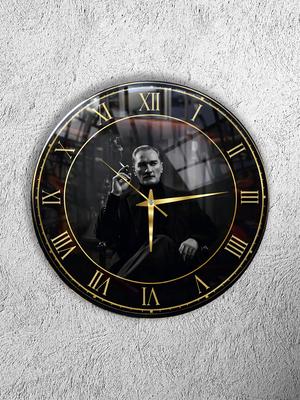 KIRILMAZ CAM DUVAR SAATİ, HEM TABLO HEM SAAT SİYAH GOLD ATATÜRK PORTRE TASARIMI EV OFİS HEDİYESİ