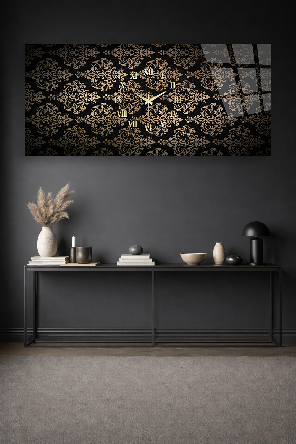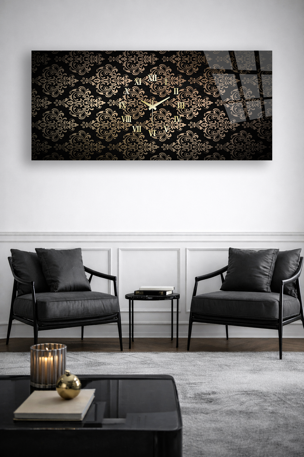 KIRILMAZ CAM DUVAR SAATİ , HEM TABLO HEM SAAT SİYAH GOLD DESEN KLASİK EV OFİS HEDİYESİ