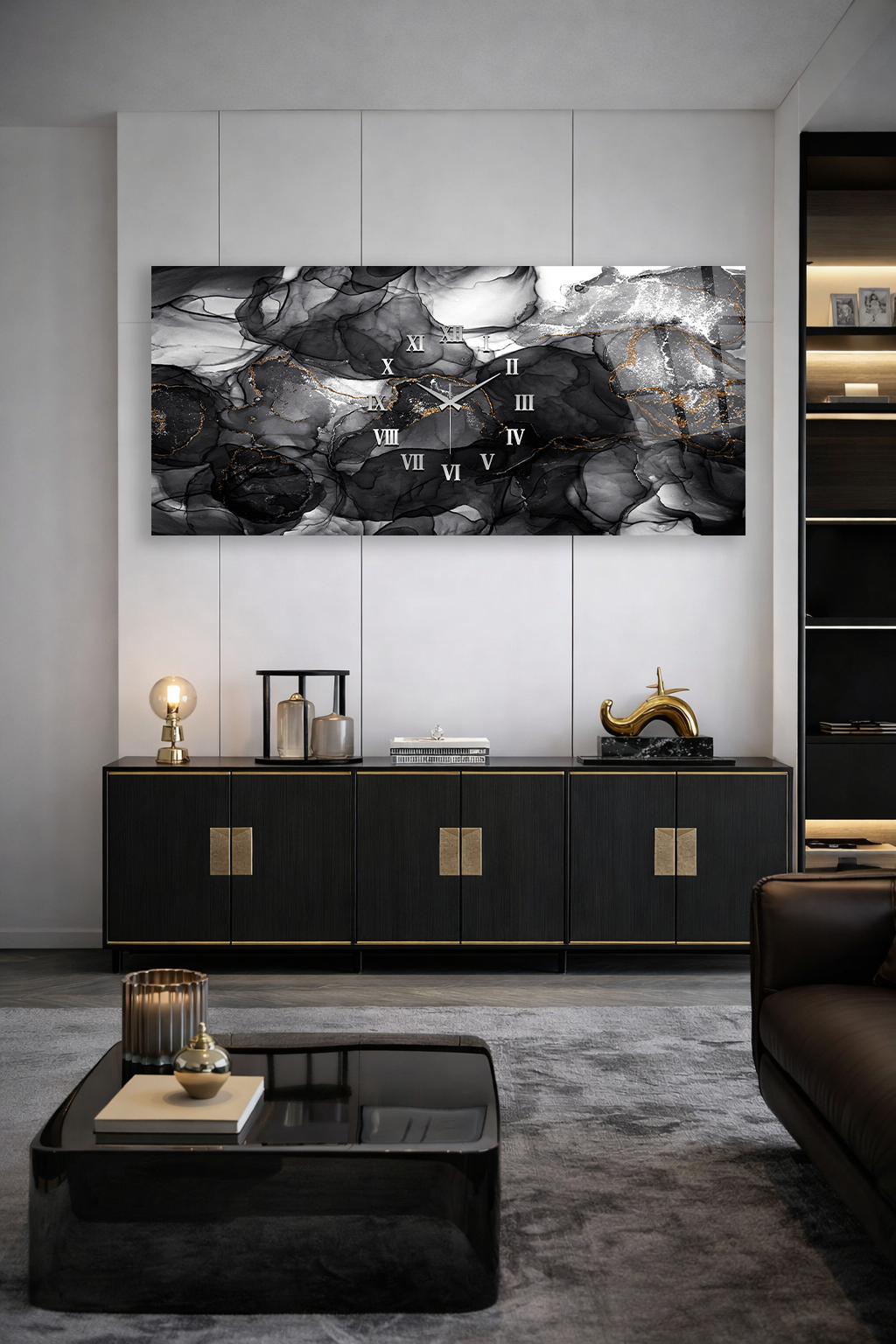 KIRILMAZ CAM DUVAR SAATİ , HEM TABLO HEM SAAT SİYAH MERMER ALTIN DAMAR TASARIM EV OFİS HEDİYESİ