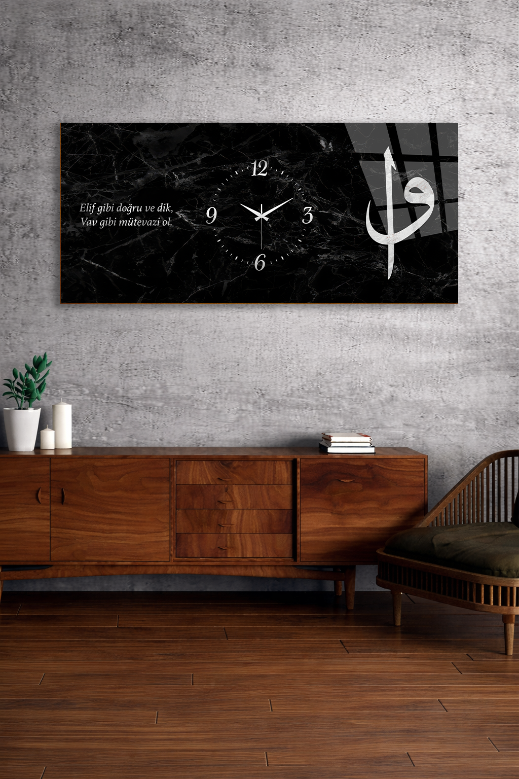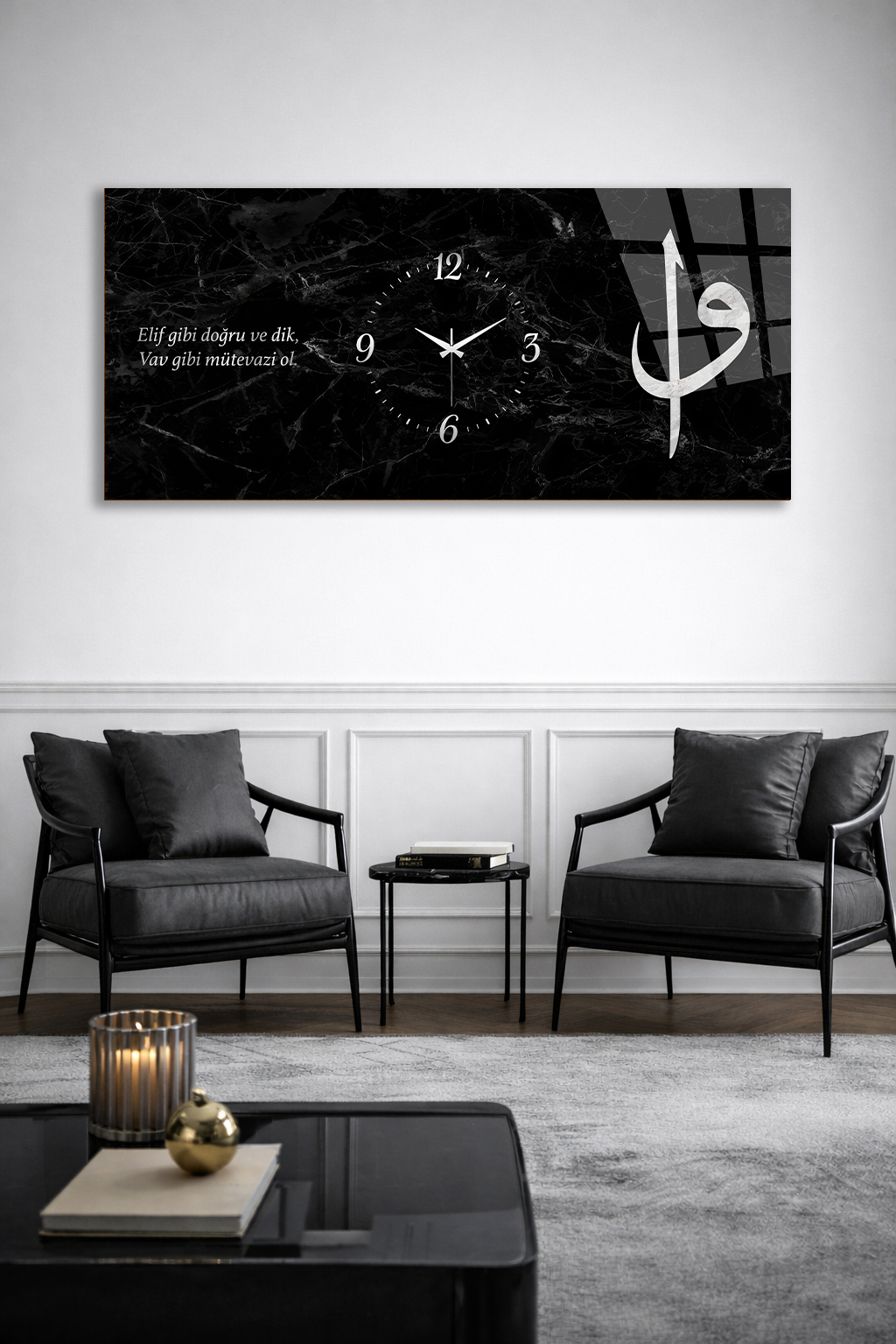 KIRILMAZ CAM DUVAR SAATİ , HEM TABLO HEM SAAT SİYAH MERMER HAT SANATI EV OFİS HEDİYESİ