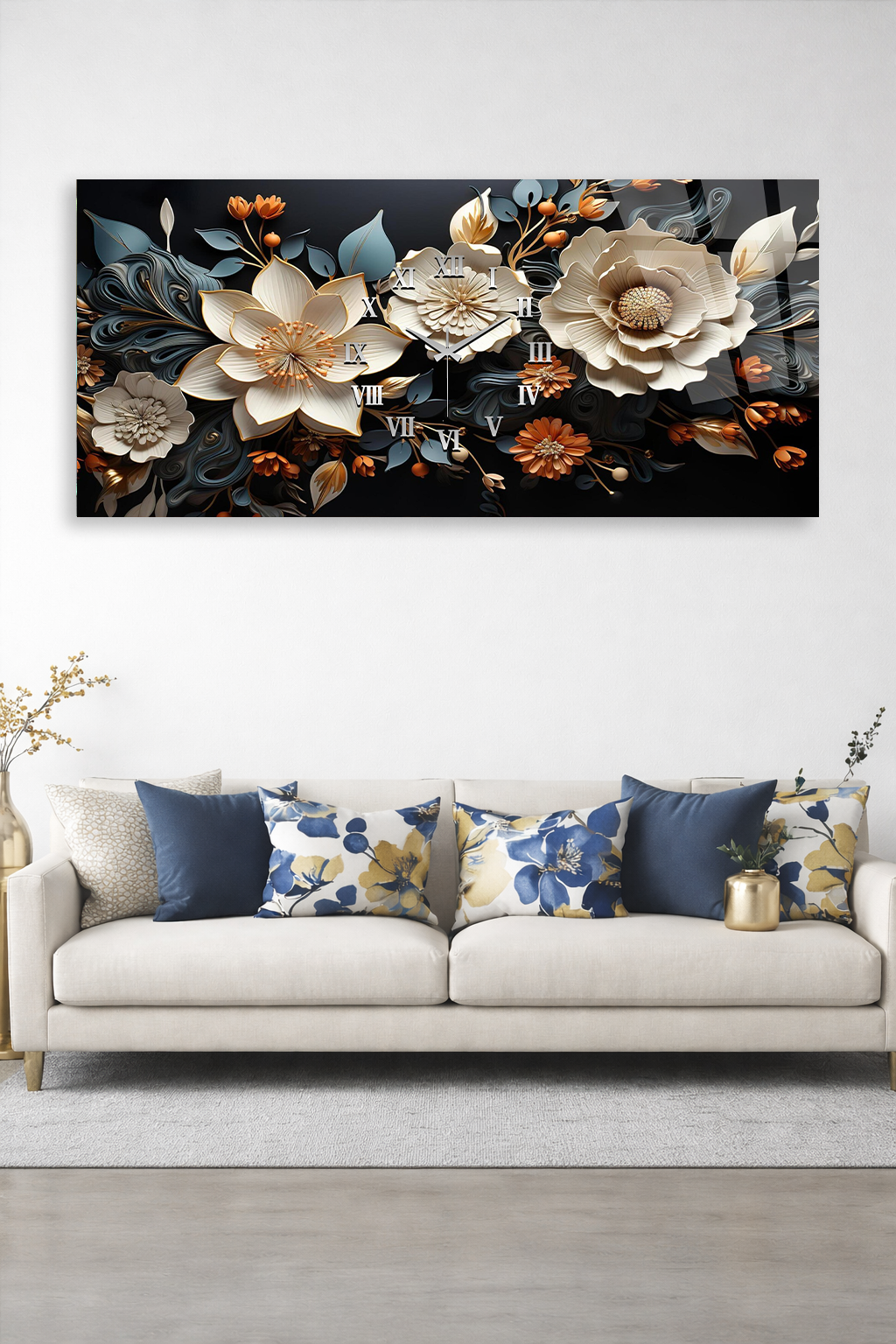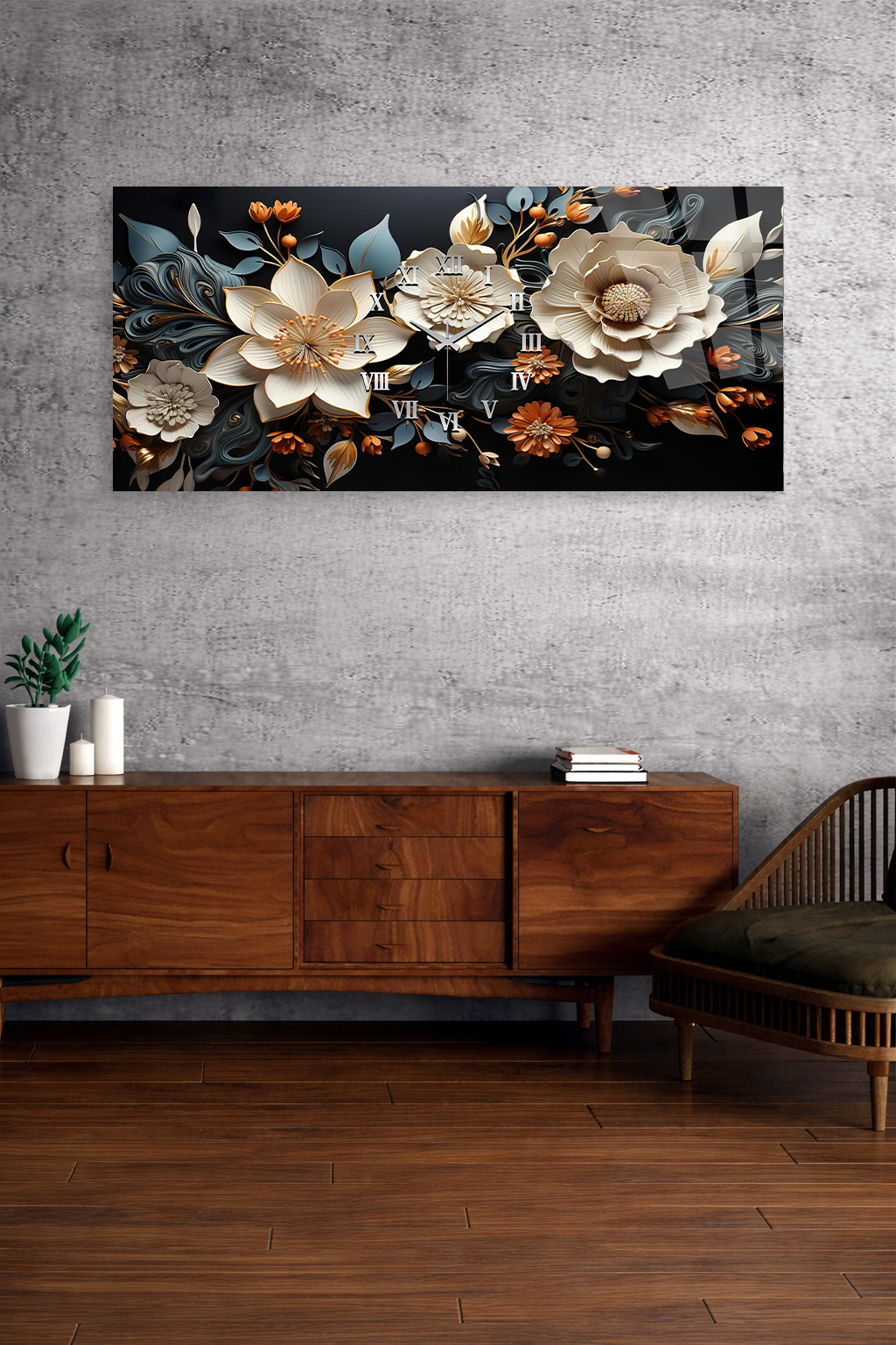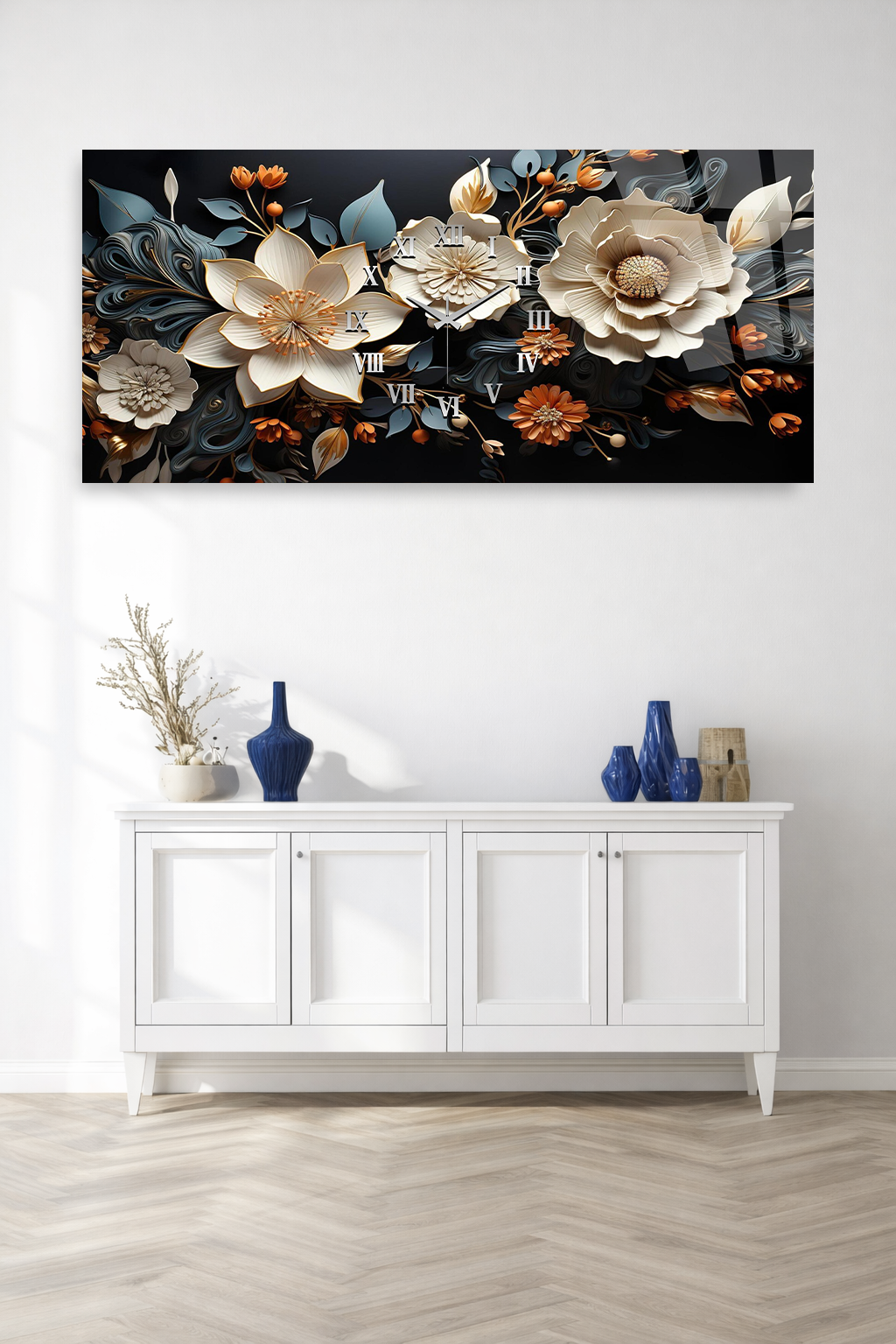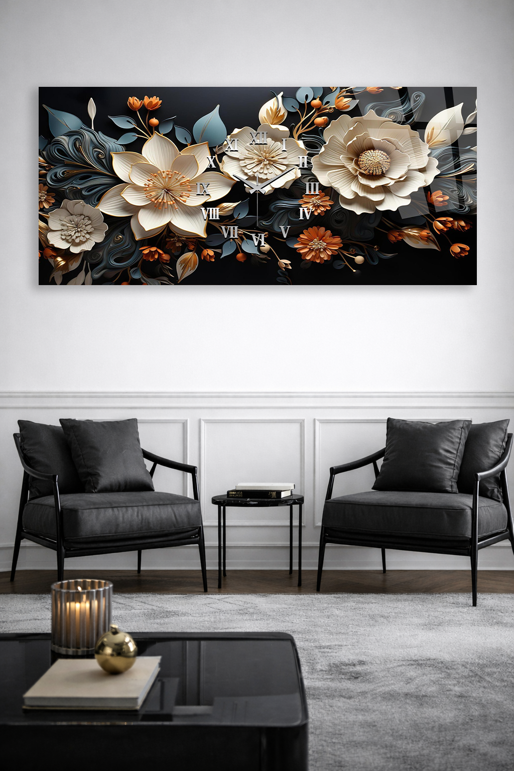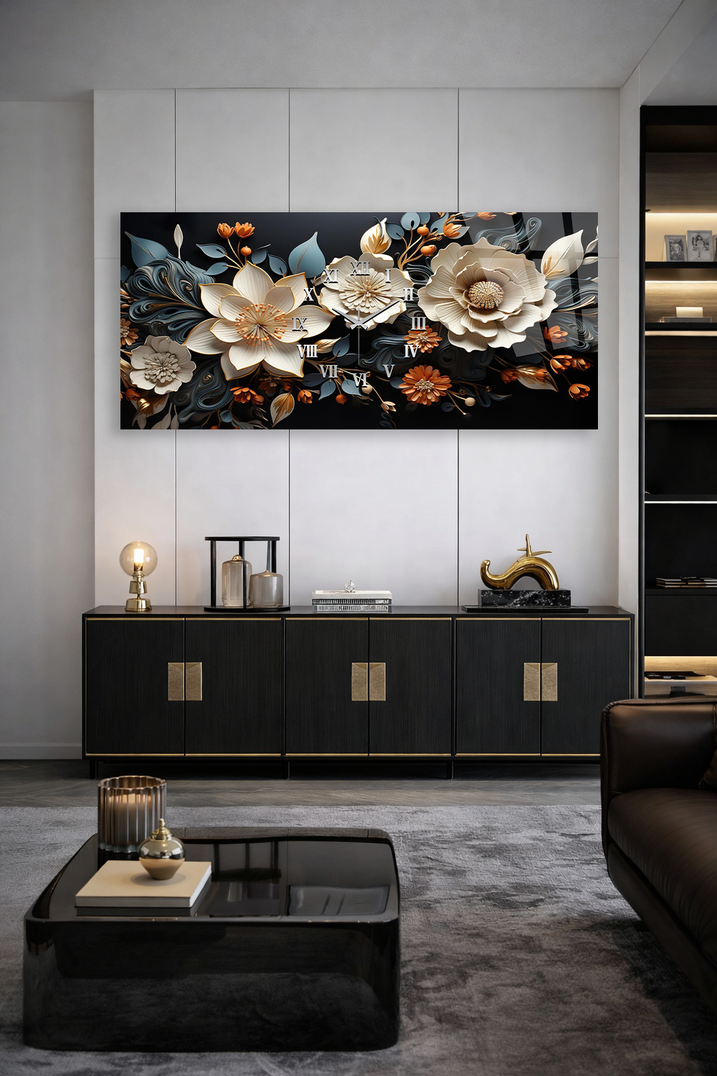 KIRILMAZ CAM DUVAR SAATİ , HEM TABLO HEM SAAT SİYAH ZEMİN ÇİÇEKLİ SANATSAL TASARIM EV OFİS HEDİYESİ