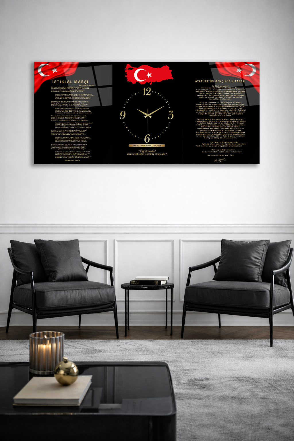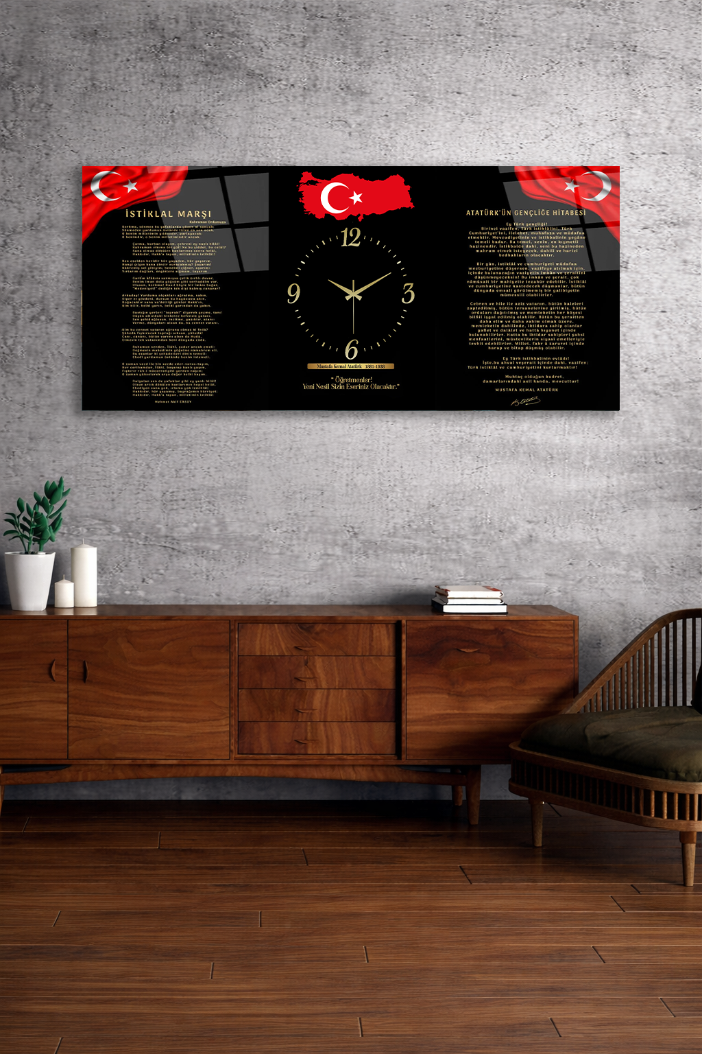 KIRILMAZ CAM DUVAR SAATİ , HEM TABLO HEM SAAT SİYAH ZEMİN GENÇLİĞE HİTABE EV OFİS HEDİYESİ