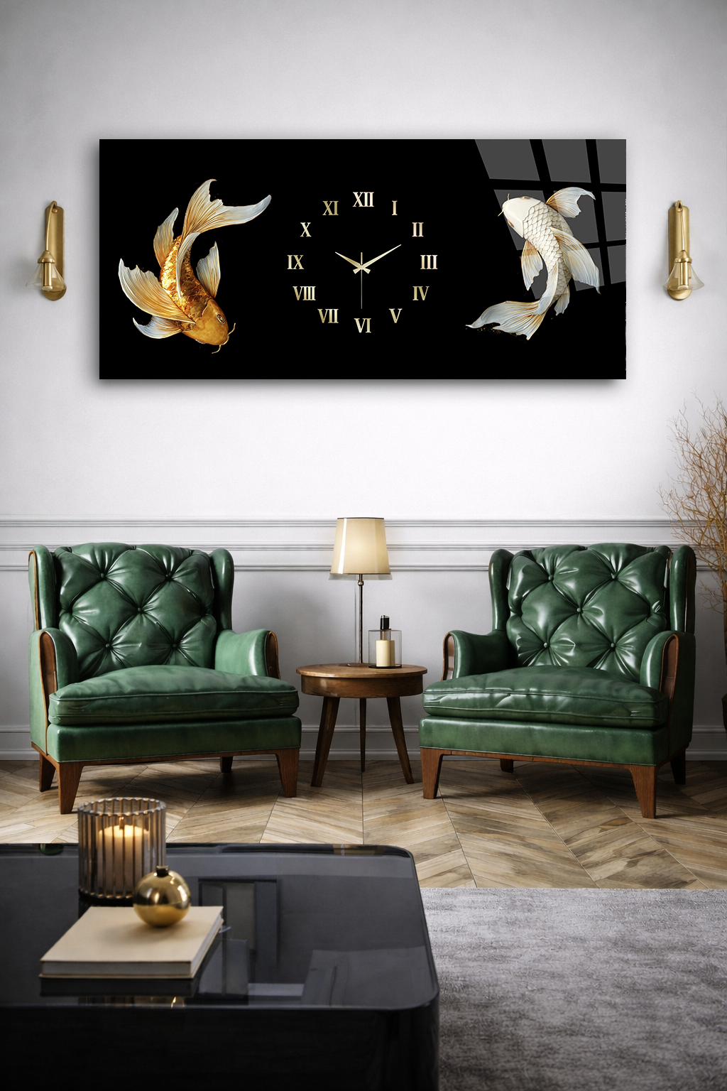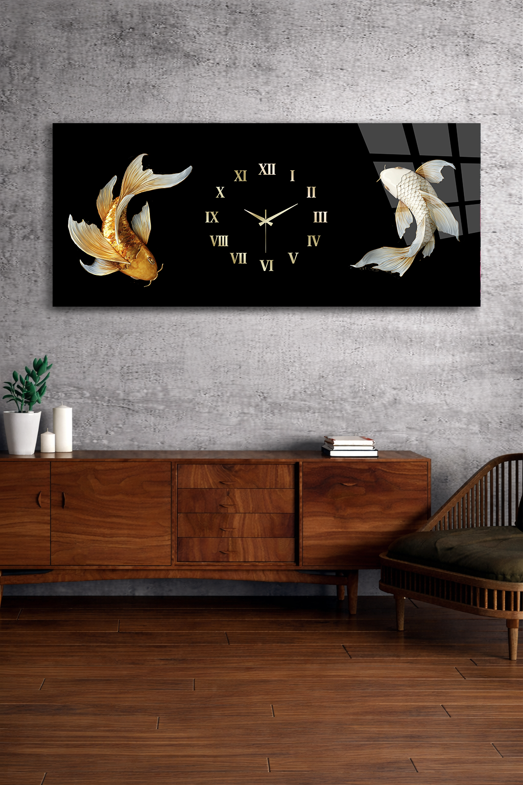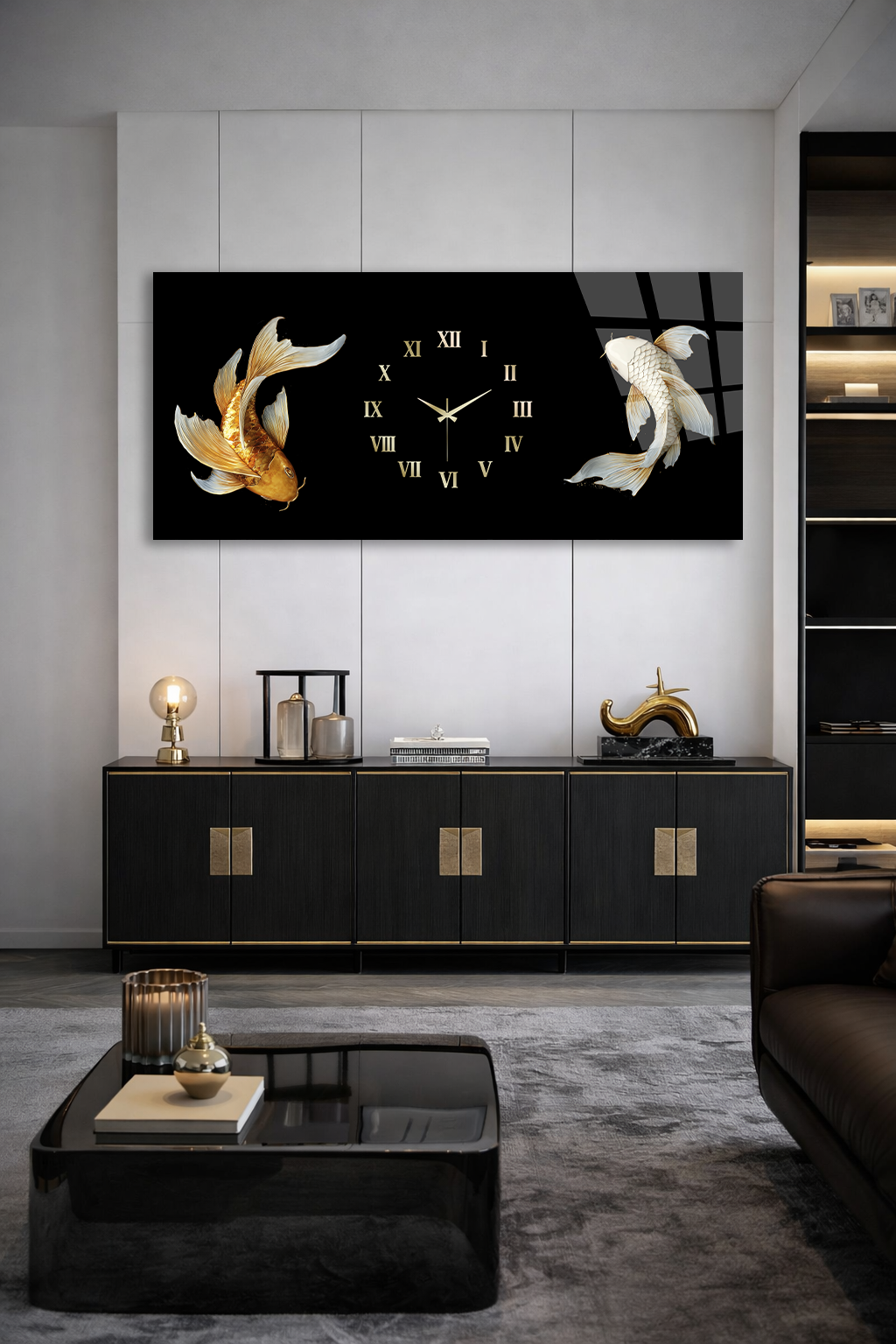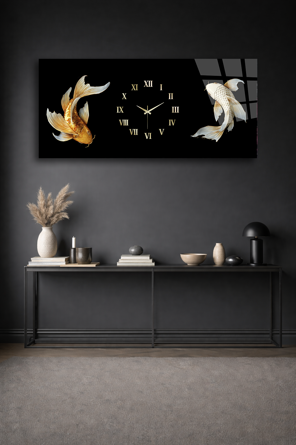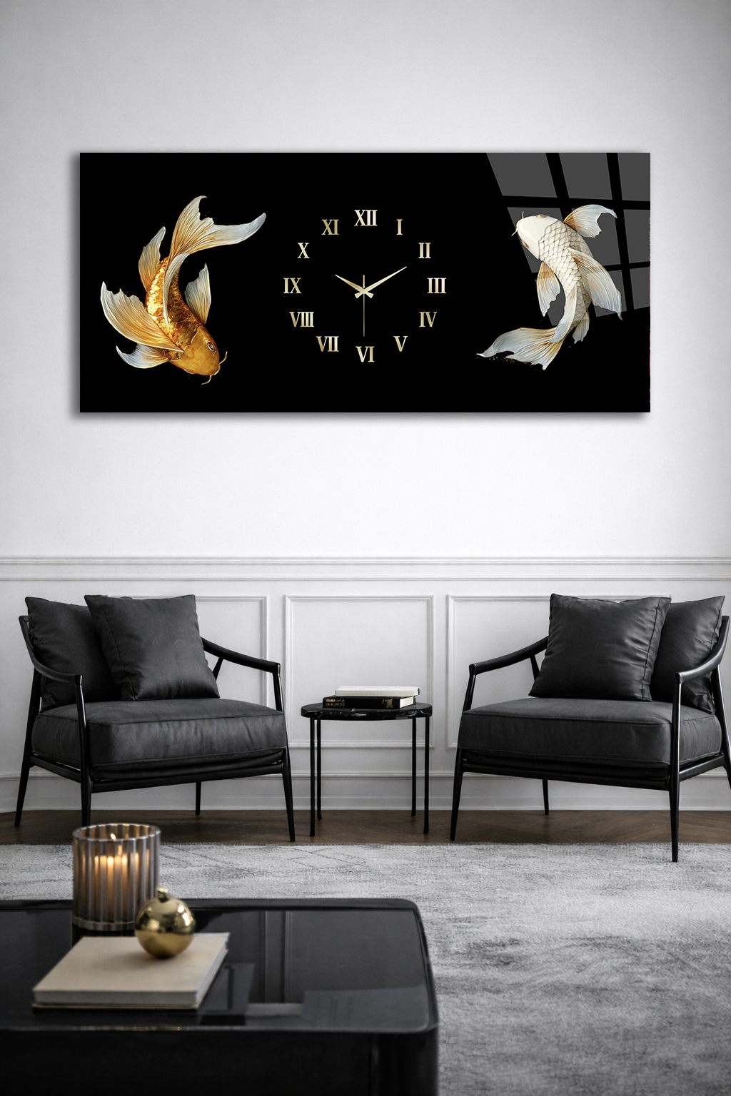 KIRILMAZ CAM DUVAR SAATİ , HEM TABLO HEM SAAT SİYAH ZEMİN KOİ BALIK TASARIM EV OFİS HEDİYESİ