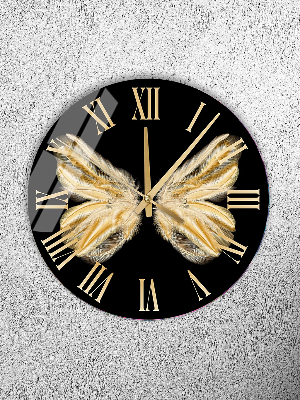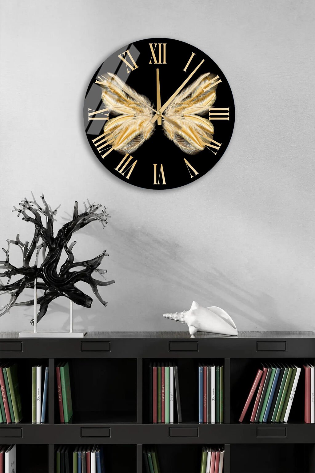 KIRILMAZ CAM DUVAR SAATİ, HEM TABLO HEM SAAT SİYAH ZEMİNDE ALTIN KANAT TASARIM EV OFİS HEDİYESİ