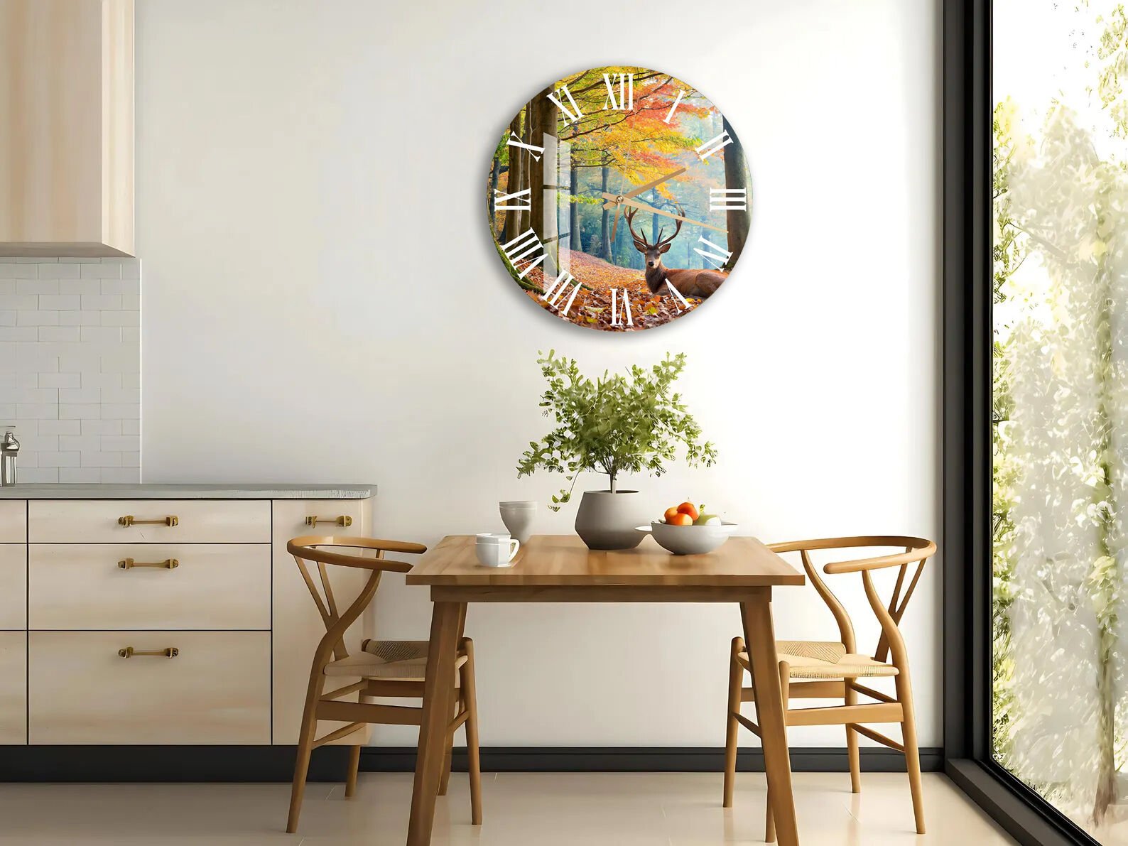 KIRILMAZ CAM DUVAR SAATİ, HEM TABLO HEM SAAT SONBAHAR ORMAN GEYİK DOĞA MANZARASI EV OFİS HEDİYESİ