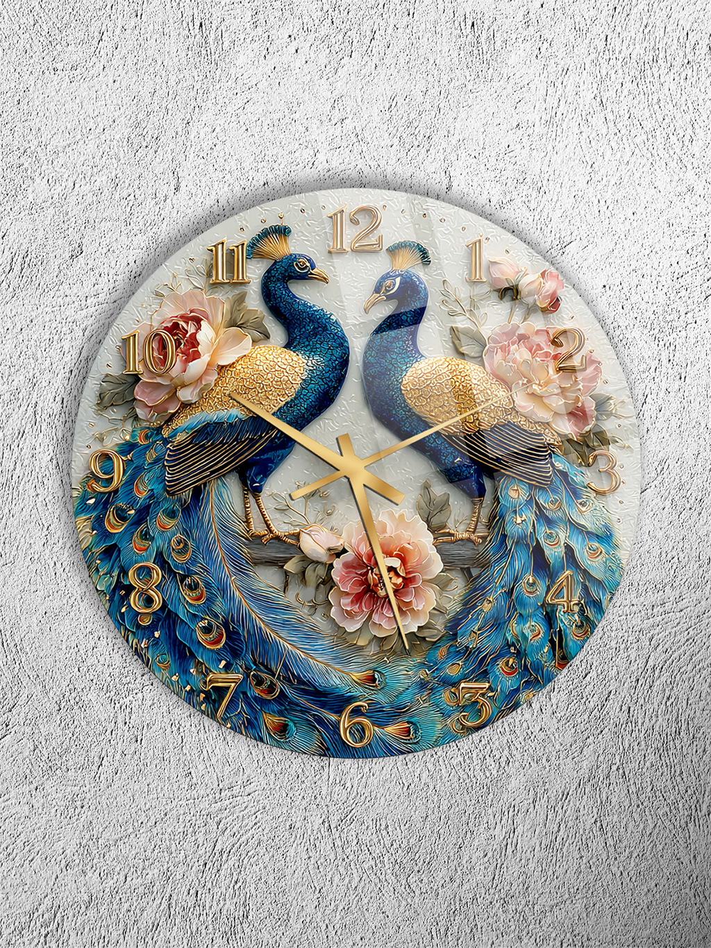 KIRILMAZ CAM DUVAR SAATİ, HEM TABLO HEM SAAT TAVUS KUŞU ÇİÇEK DESENLİ SANATSAL EV OFİS HEDİYESİ