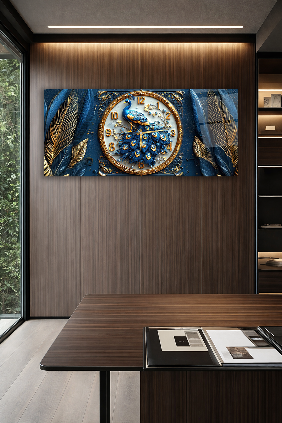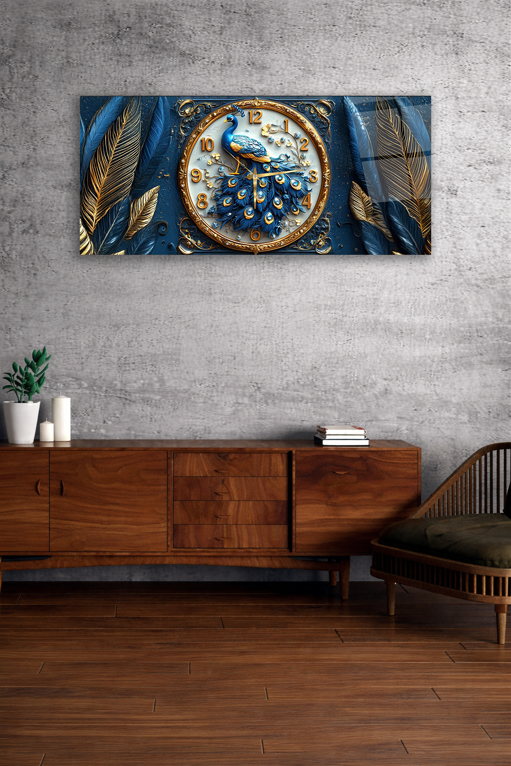 KIRILMAZ CAM DUVAR SAATİ , HEM TABLO HEM SAAT TAVUS KUŞU MAVİ ALTIN CAM SAAT EV OFİS HEDİYESİ