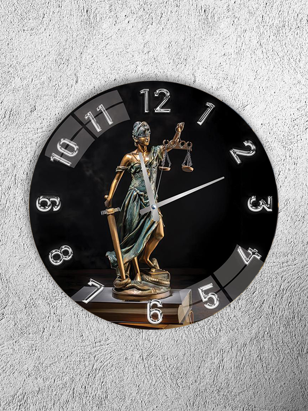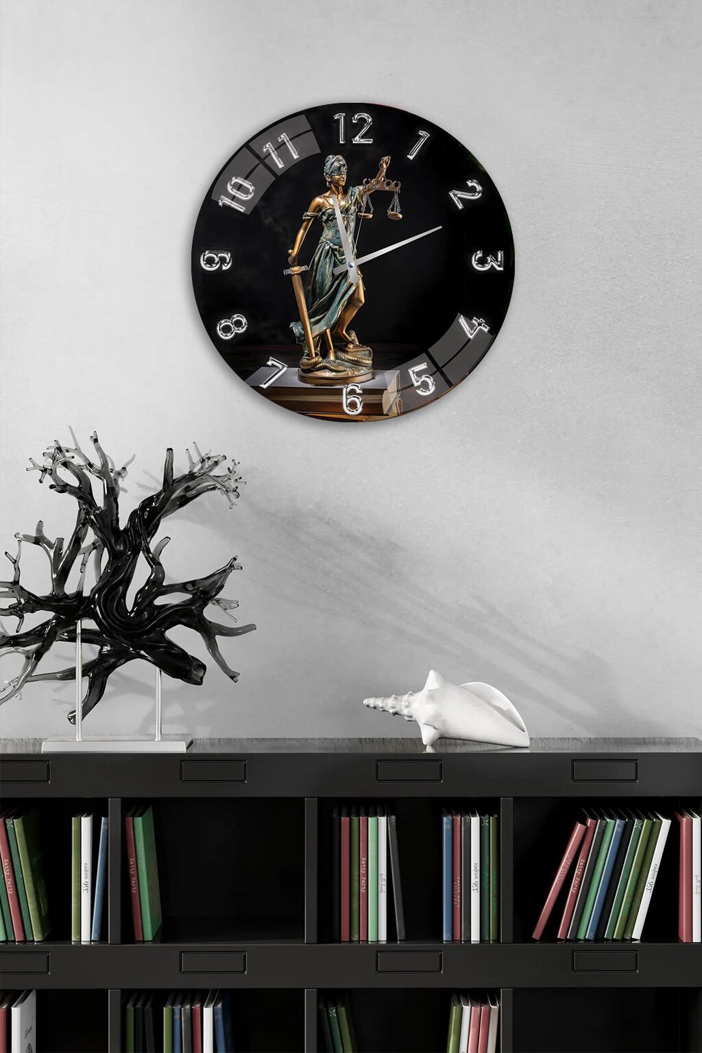 KIRILMAZ CAM DUVAR SAATİ, HEM TABLO HEM SAAT THEMİS ADALET HEYKELİ SİYAH ZEMİN EV OFİS HEDİYESİ
