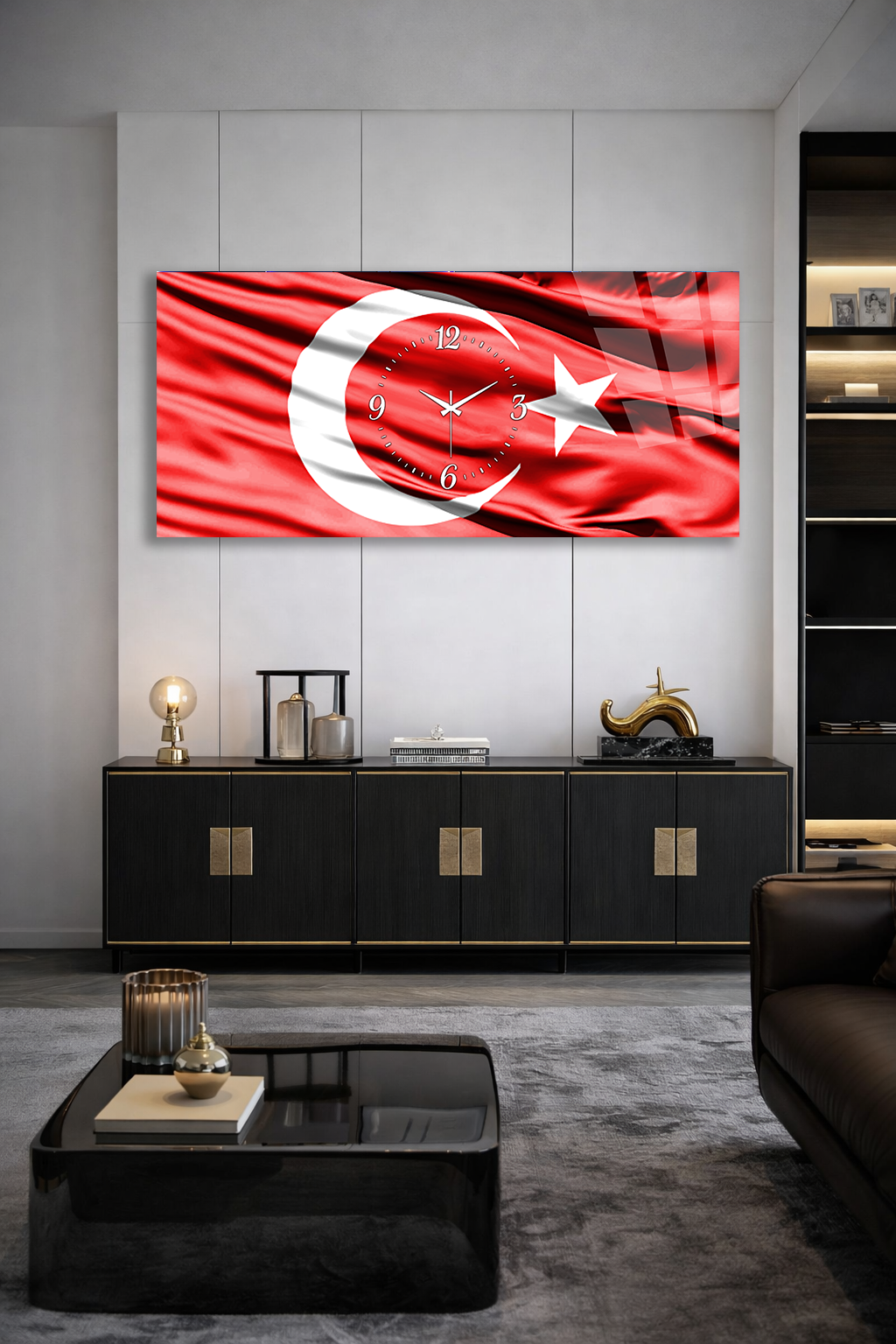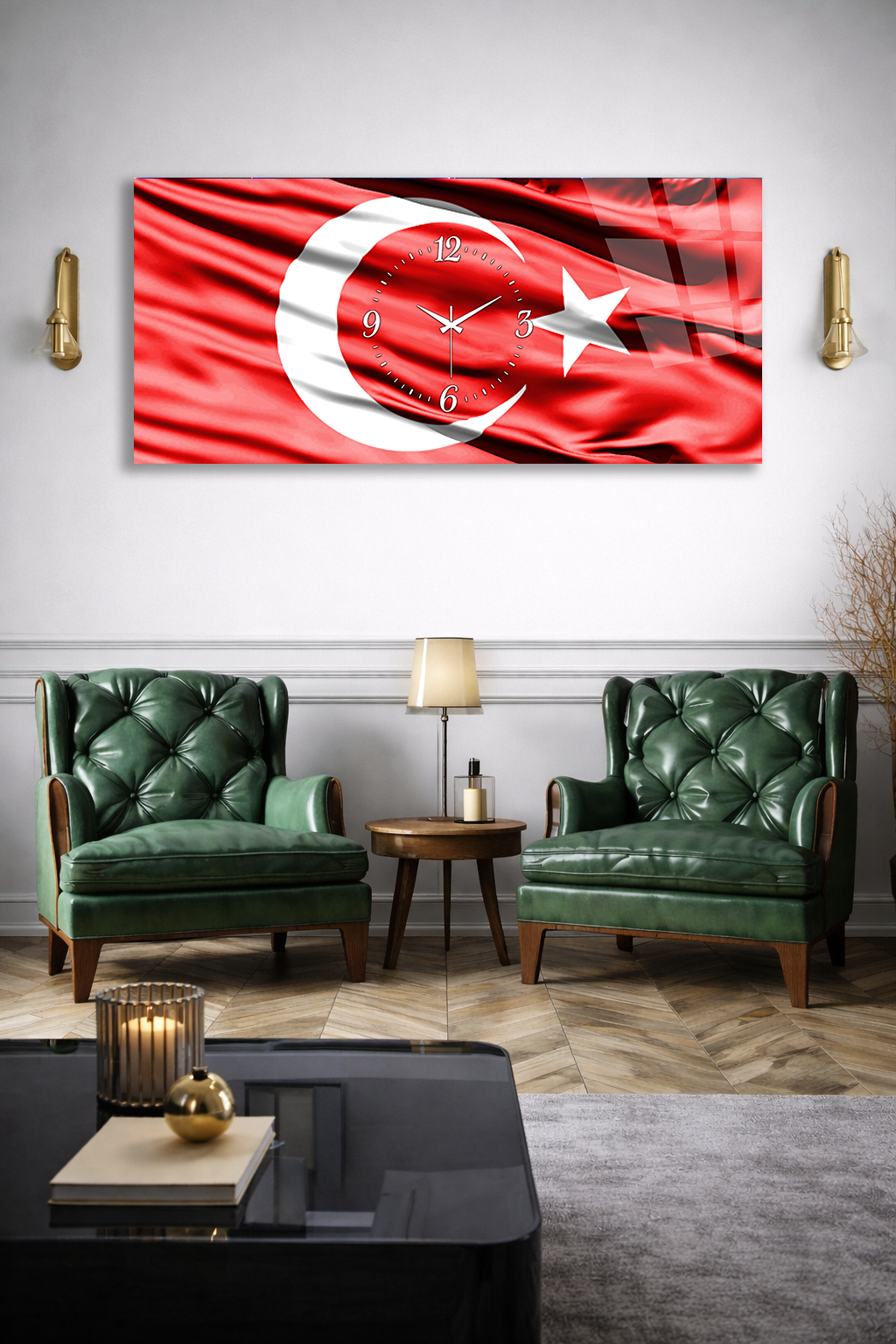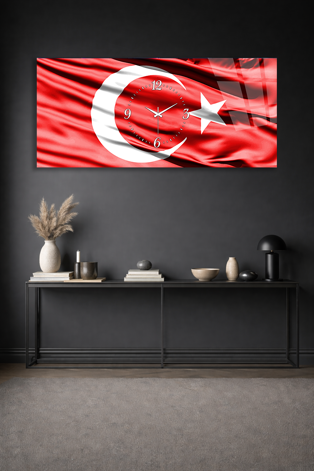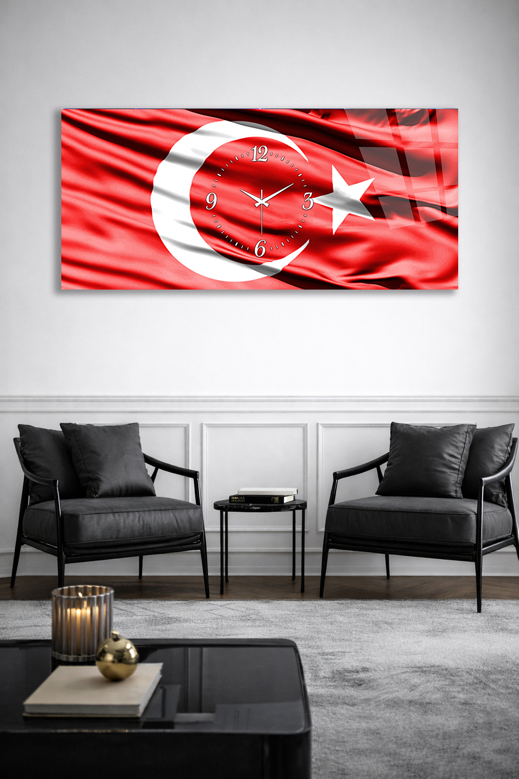 KIRILMAZ CAM DUVAR SAATİ , HEM TABLO HEM SAAT TÜRK BAYRAĞI AY YILDIZ TEMALI EV OFİS HEDİYESİ