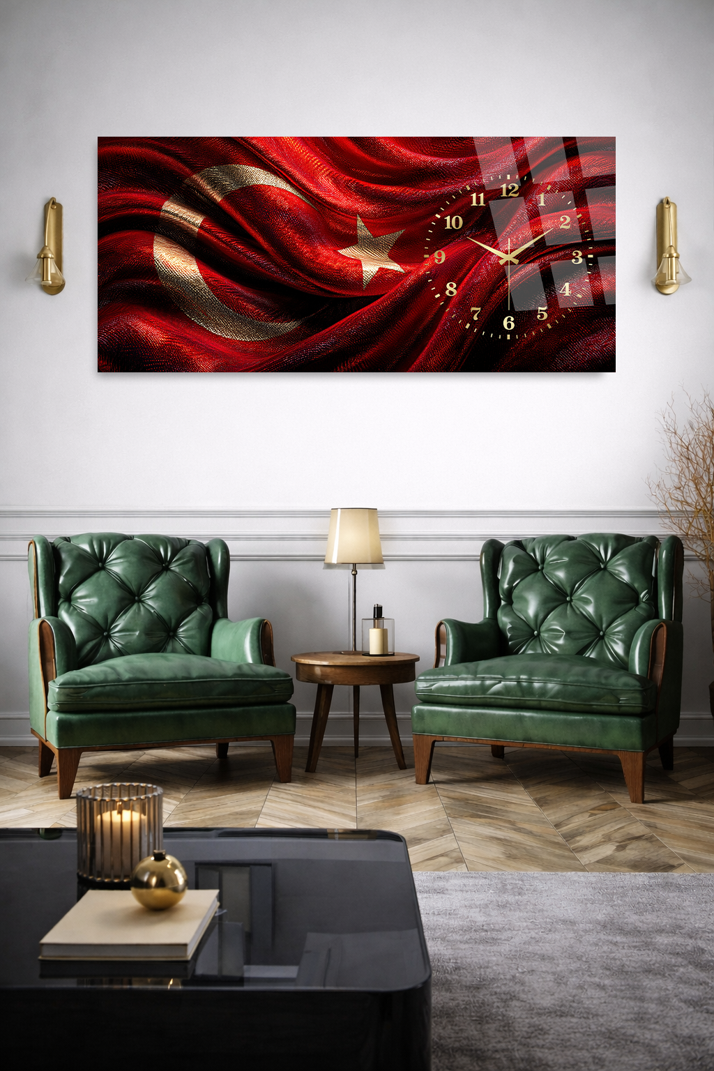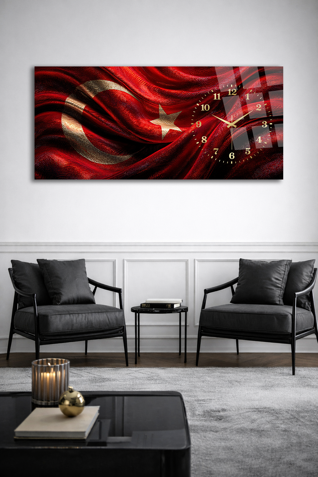 KIRILMAZ CAM DUVAR SAATİ , HEM TABLO HEM SAAT TÜRK BAYRAĞI MODERN ŞIK TASARIM EV OFİS HEDİYESİ