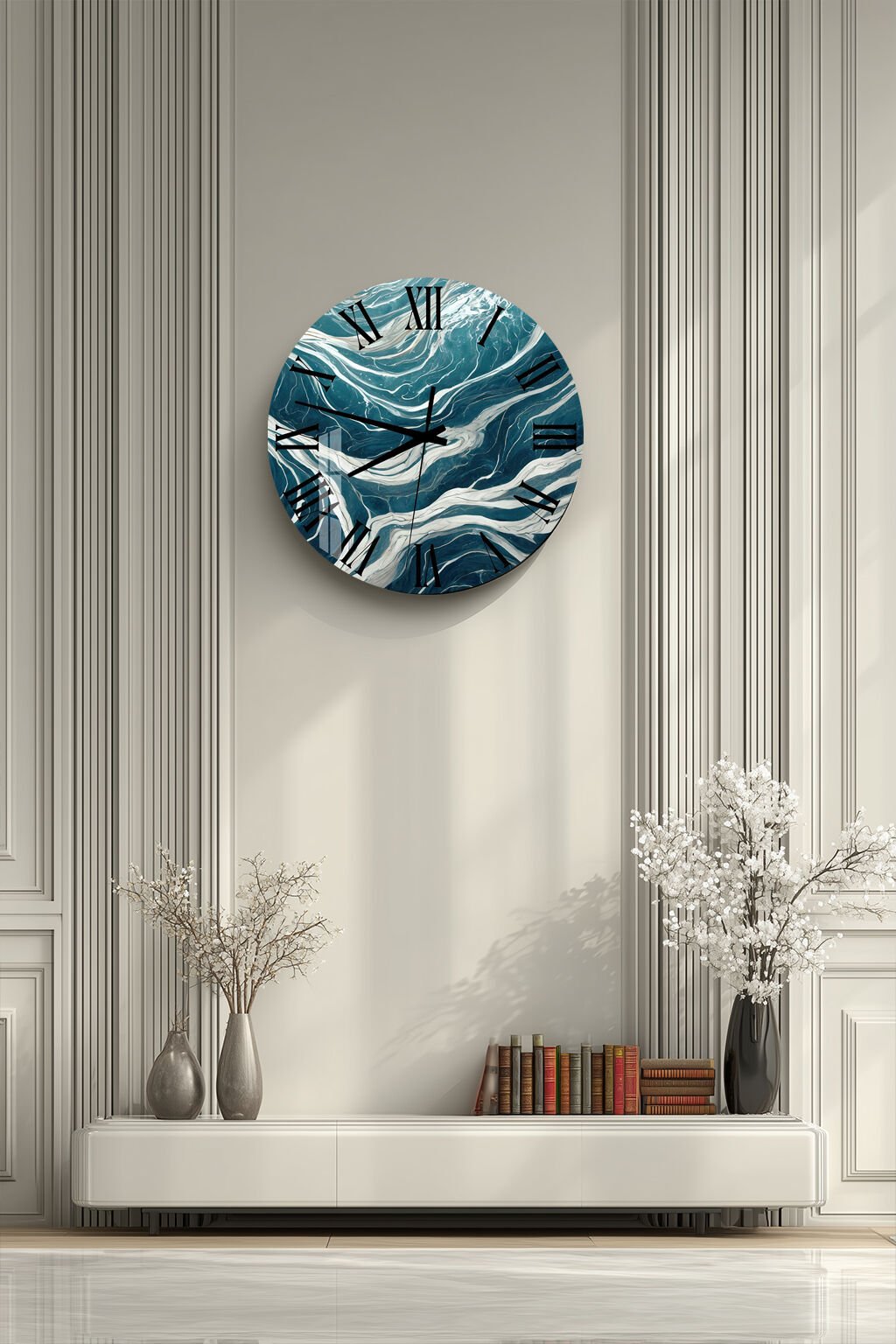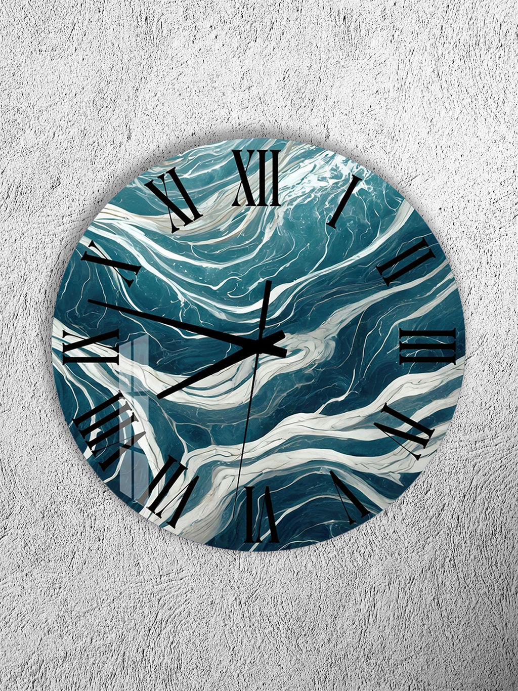 KIRILMAZ CAM DUVAR SAATİ, HEM TABLO HEM SAAT TURKUAZ BEYAZ DALGA MERMER DESEN EV OFİS HEDİYESİ