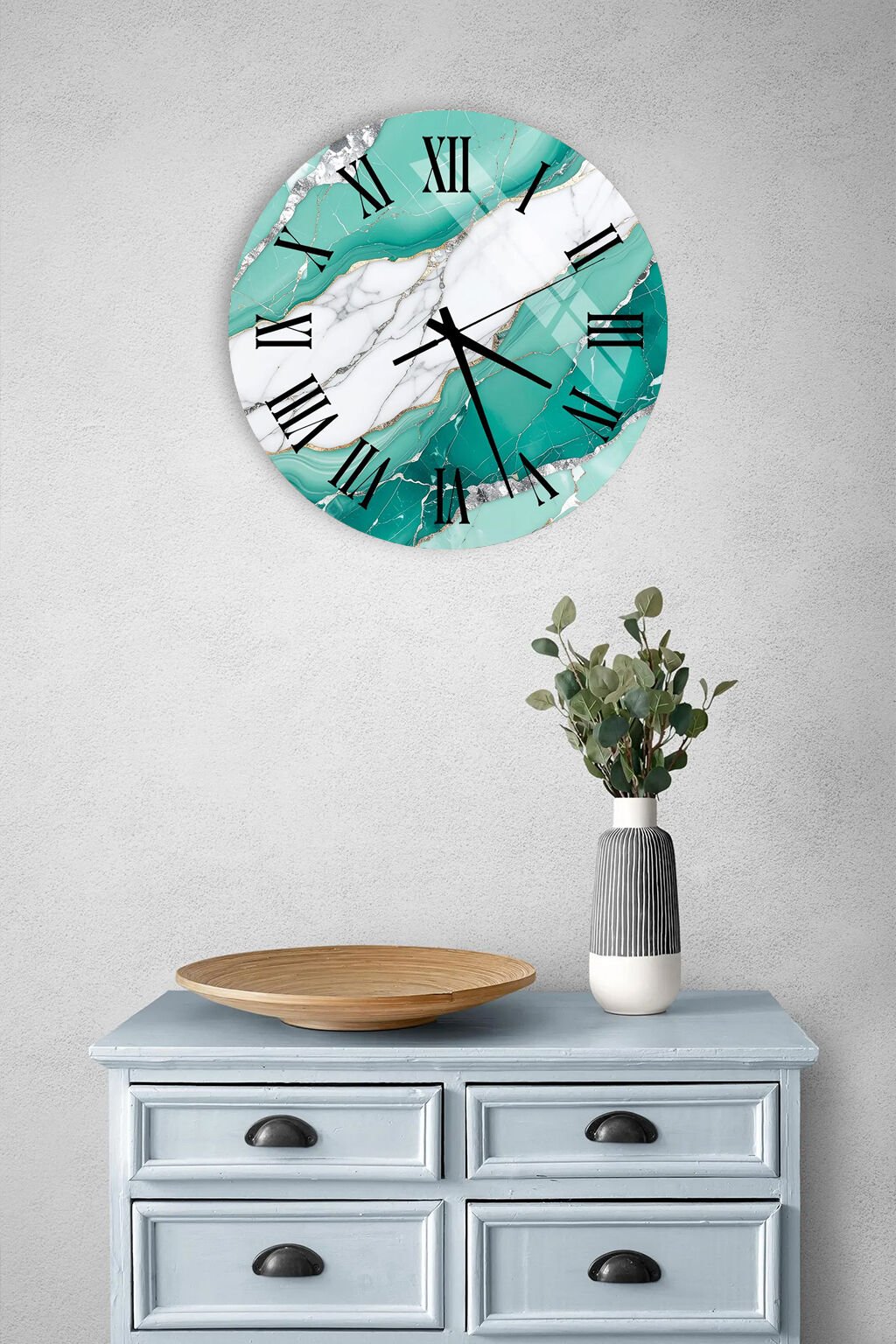 KIRILMAZ CAM DUVAR SAATİ, HEM TABLO HEM SAAT TURKUAZ BEYAZ MERMER ALTIN DAMARLI ROMEN RAKAM EV OFİS HEDİYESİ