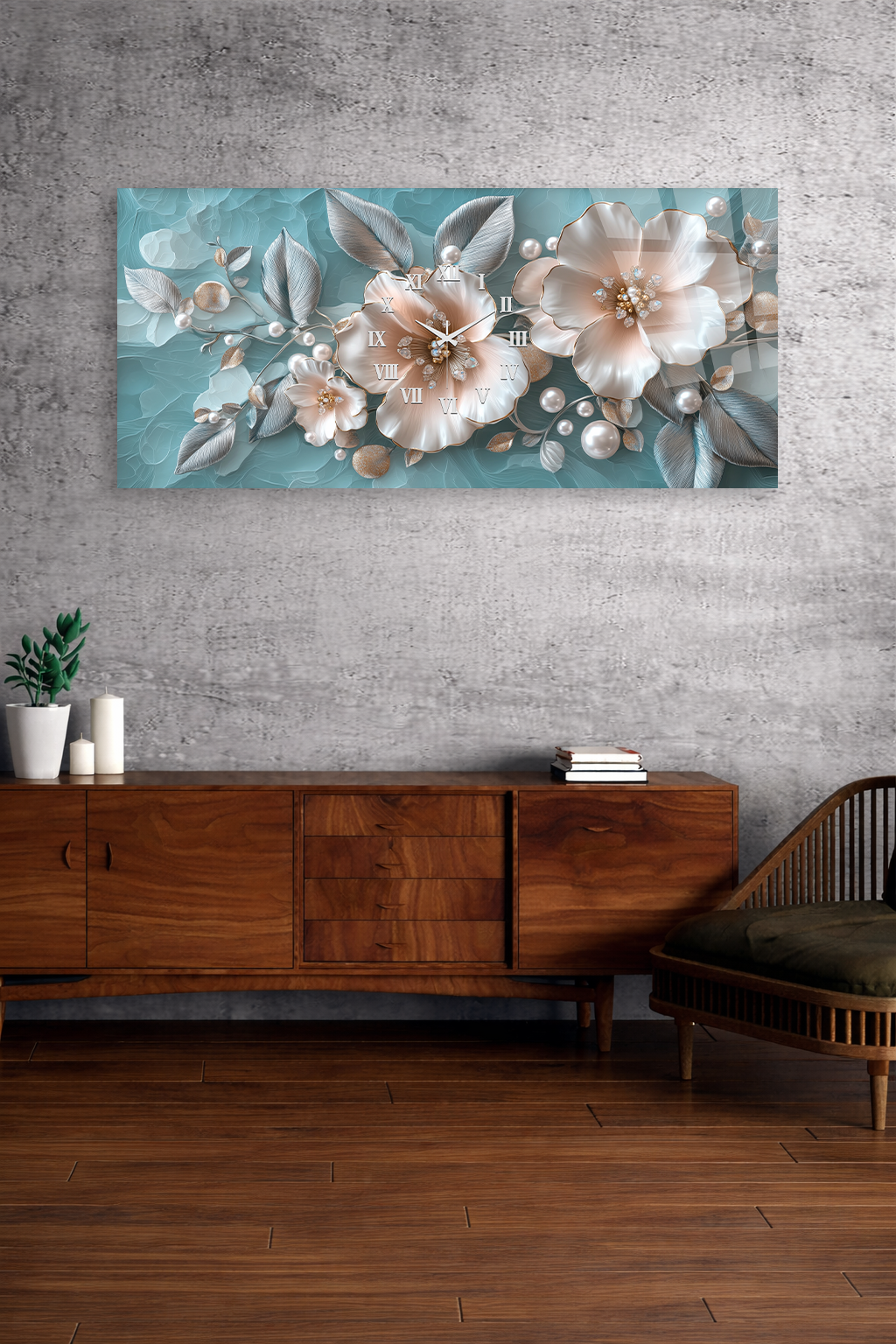 KIRILMAZ CAM DUVAR SAATİ , HEM TABLO HEM SAAT TURKUAZ ÇİÇEKLİ ZARİF TASARIM EV OFİS HEDİYESİ