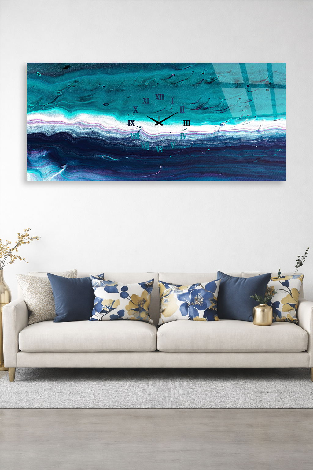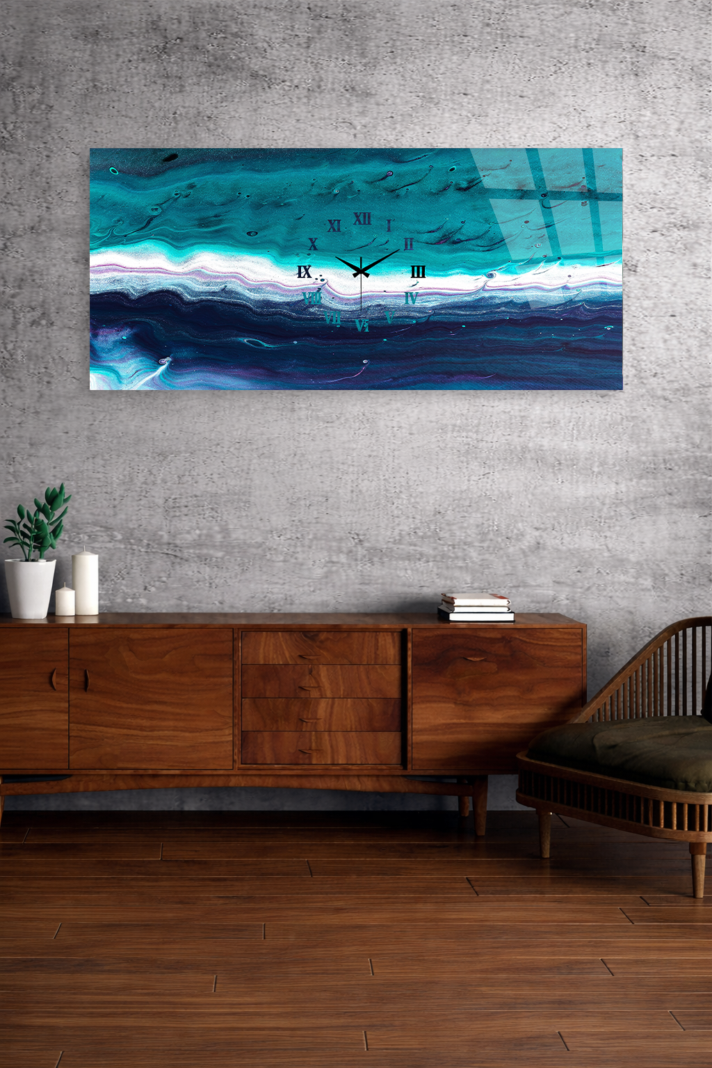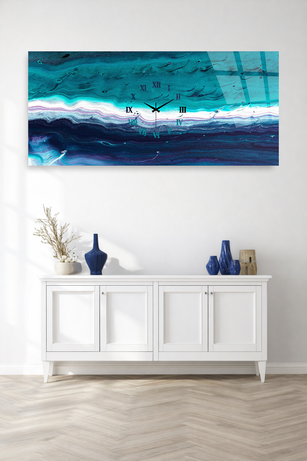 KIRILMAZ CAM DUVAR SAATİ , HEM TABLO HEM SAAT TURKUAZ DALGA DESENLİ MODERN SANAT EV OFİS HEDİYESİ