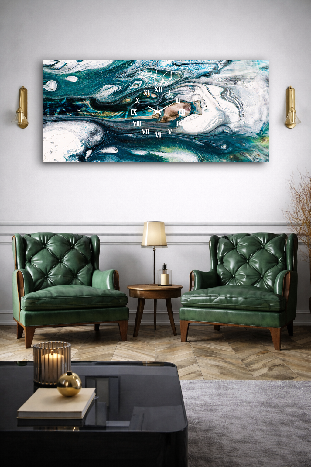 KIRILMAZ CAM DUVAR SAATİ , HEM TABLO HEM SAAT TURKUAZ MERMER DESENLİ MODERN TASARIM EV OFİS HEDİYESİ