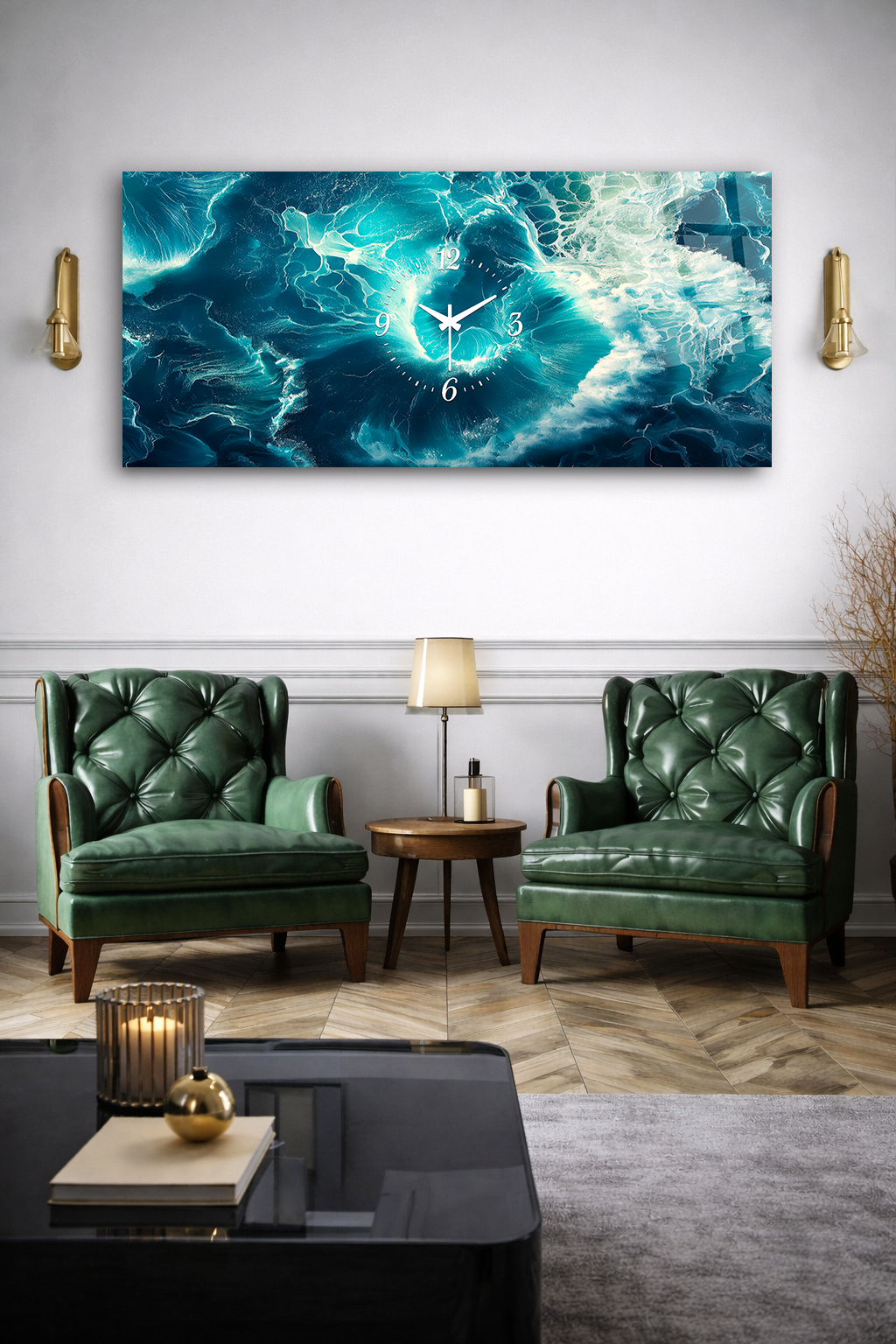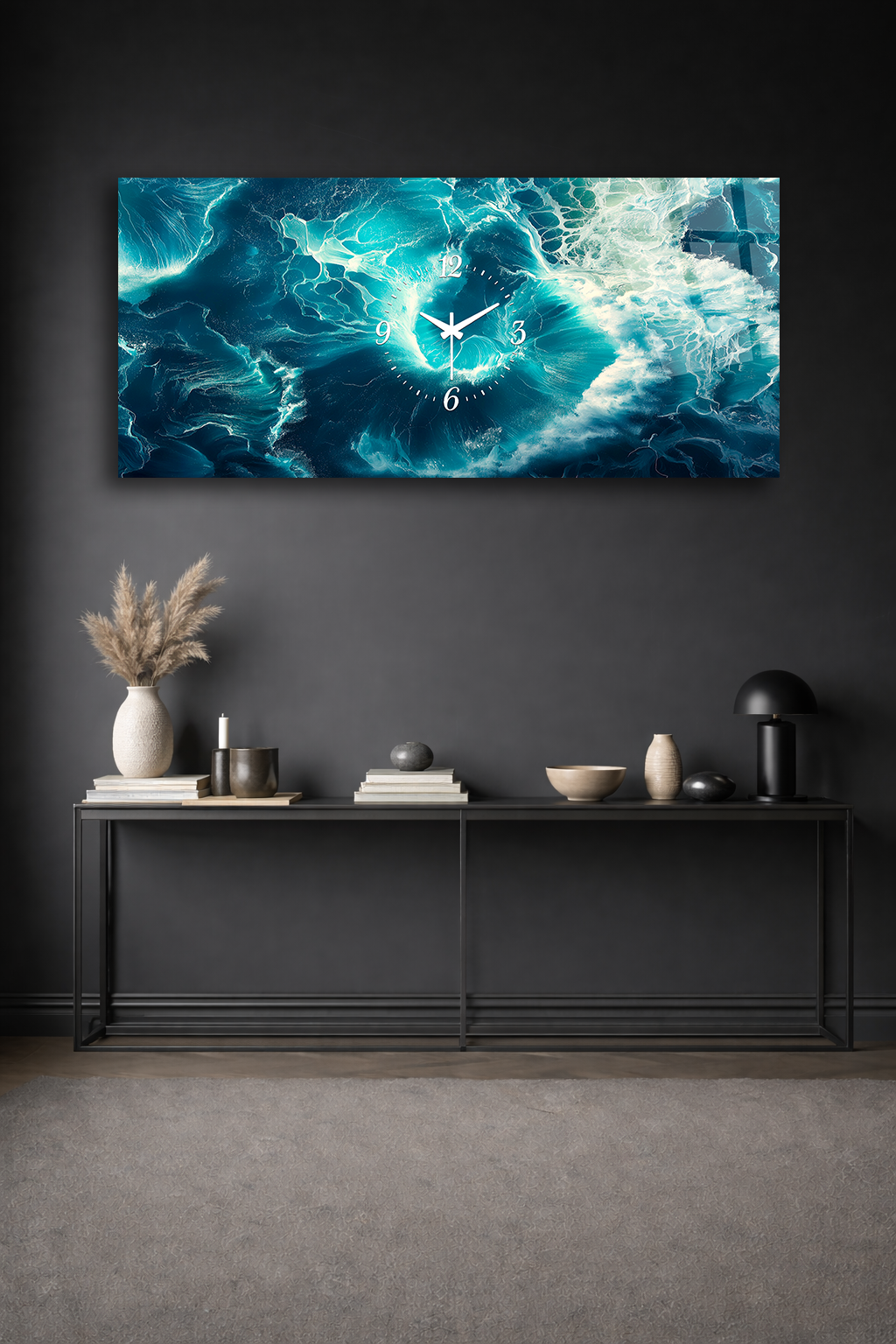 KIRILMAZ CAM DUVAR SAATİ , HEM TABLO HEM SAAT TURKUAZ OKYANUS DALGA DERİNLİK EV OFİS HEDİYESİ