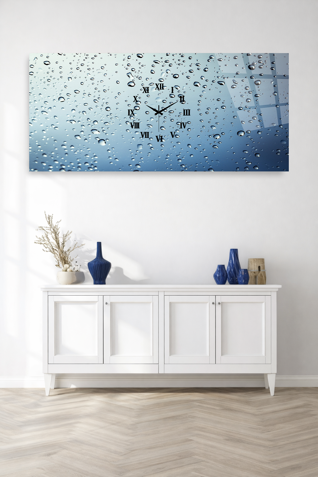 KIRILMAZ CAM DUVAR SAATİ , HEM TABLO HEM SAAT YAĞMUR DAMLALI MODERN MAVİ TASARIM EV OFİS HEDİYESİ