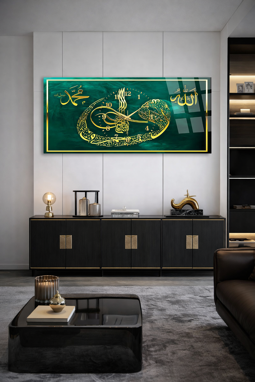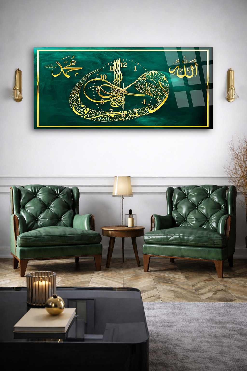 KIRILMAZ CAM DUVAR SAATİ , HEM TABLO HEM SAAT YEŞİL ALTIN HAT SANATI İSLAMİ EV OFİS HEDİYESİ