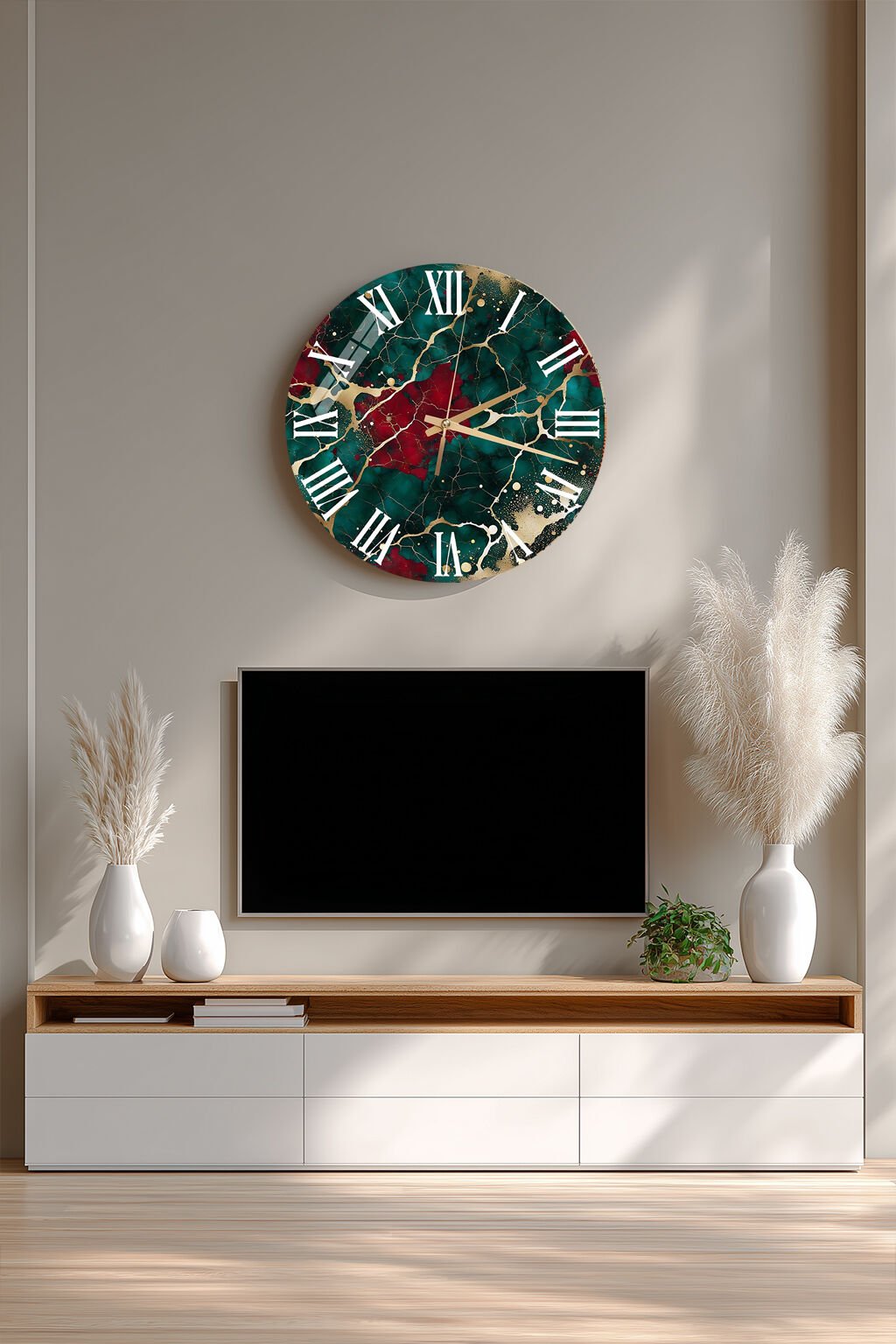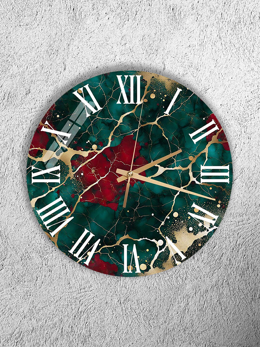 KIRILMAZ CAM DUVAR SAATİ, HEM TABLO HEM SAAT YEŞİL KIRMIZI MERMER ALTIN DAMAR LÜKS EV OFİS HEDİYESİ