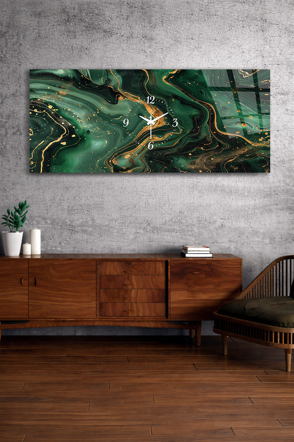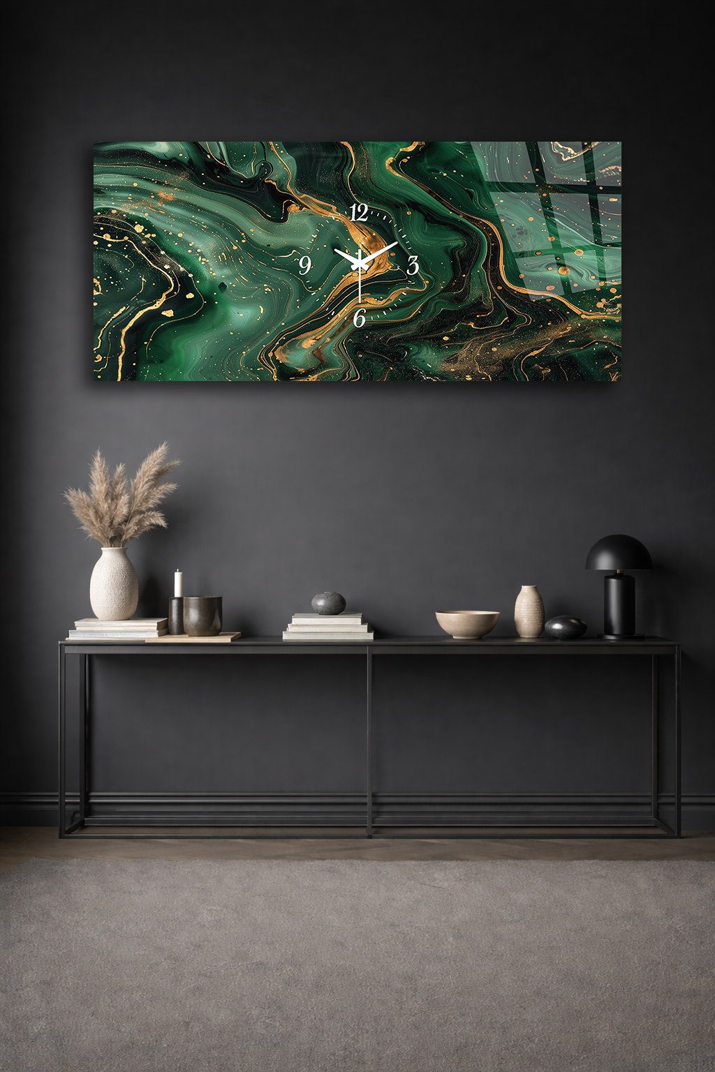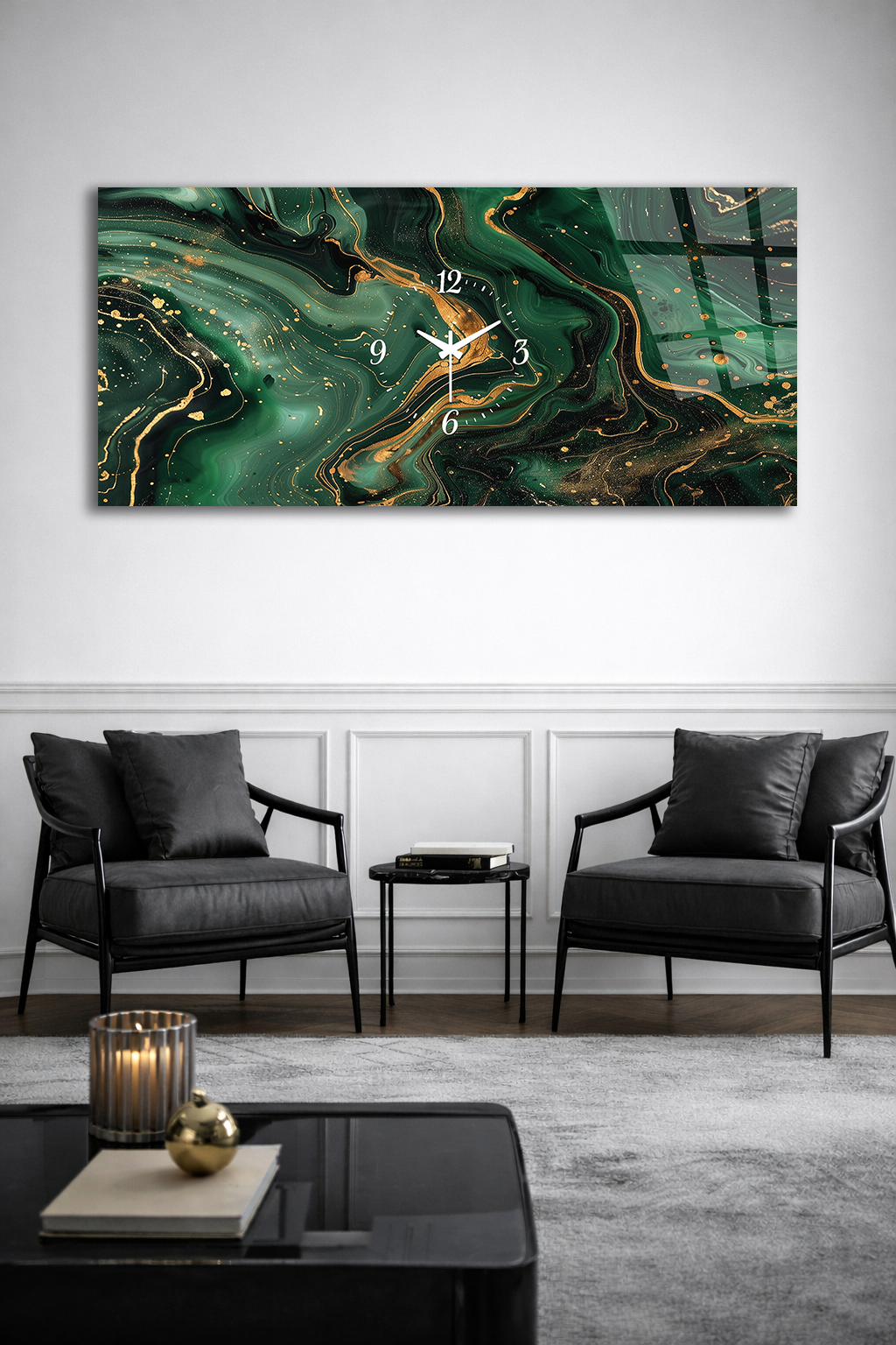 KIRILMAZ CAM DUVAR SAATİ , HEM TABLO HEM SAAT YEŞİL MERMER ALTIN DAMARLI TASARIM EV OFİS HEDİYESİ