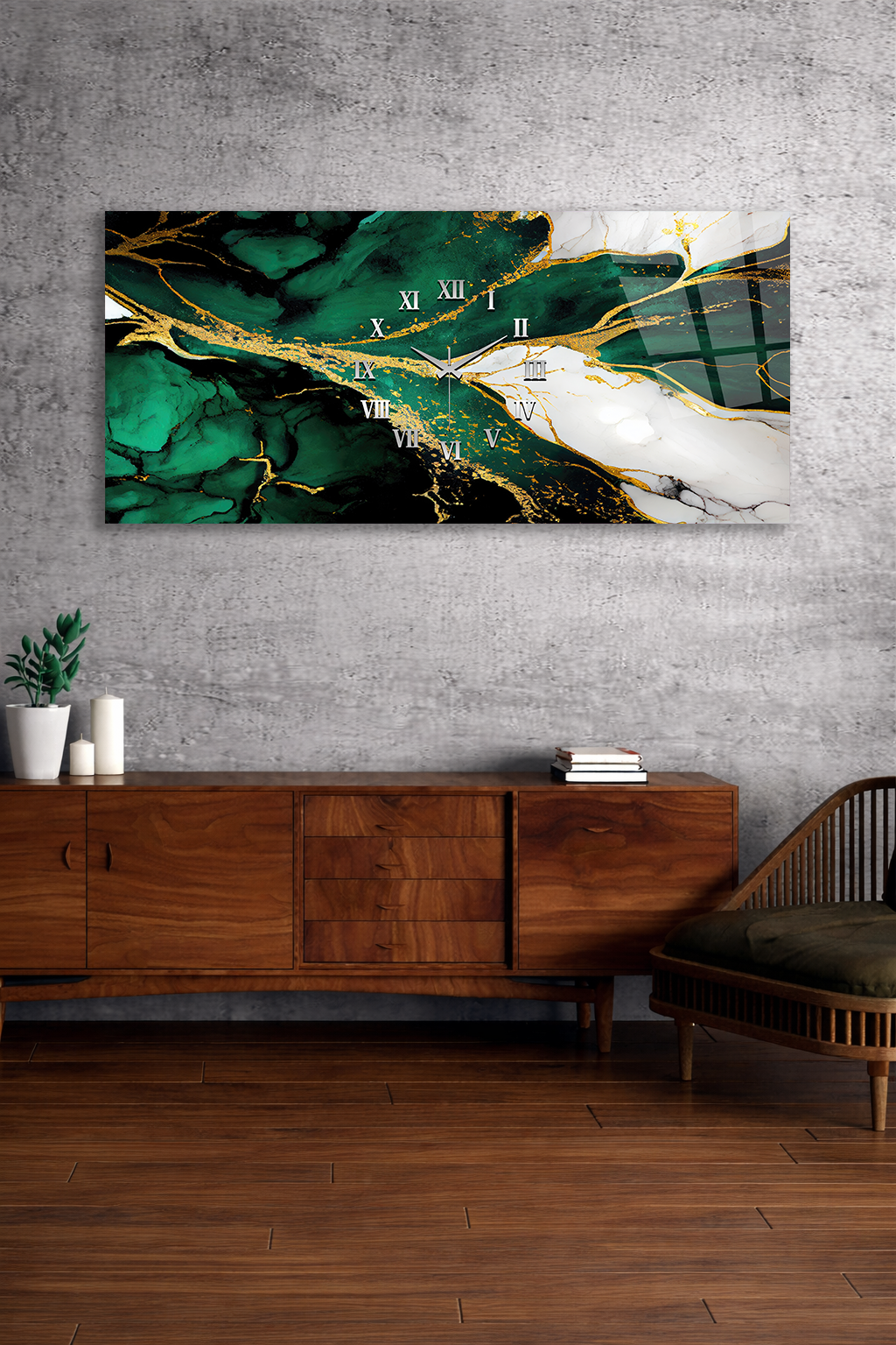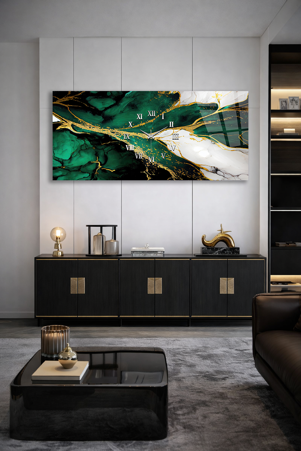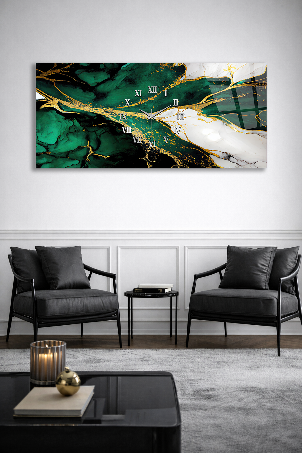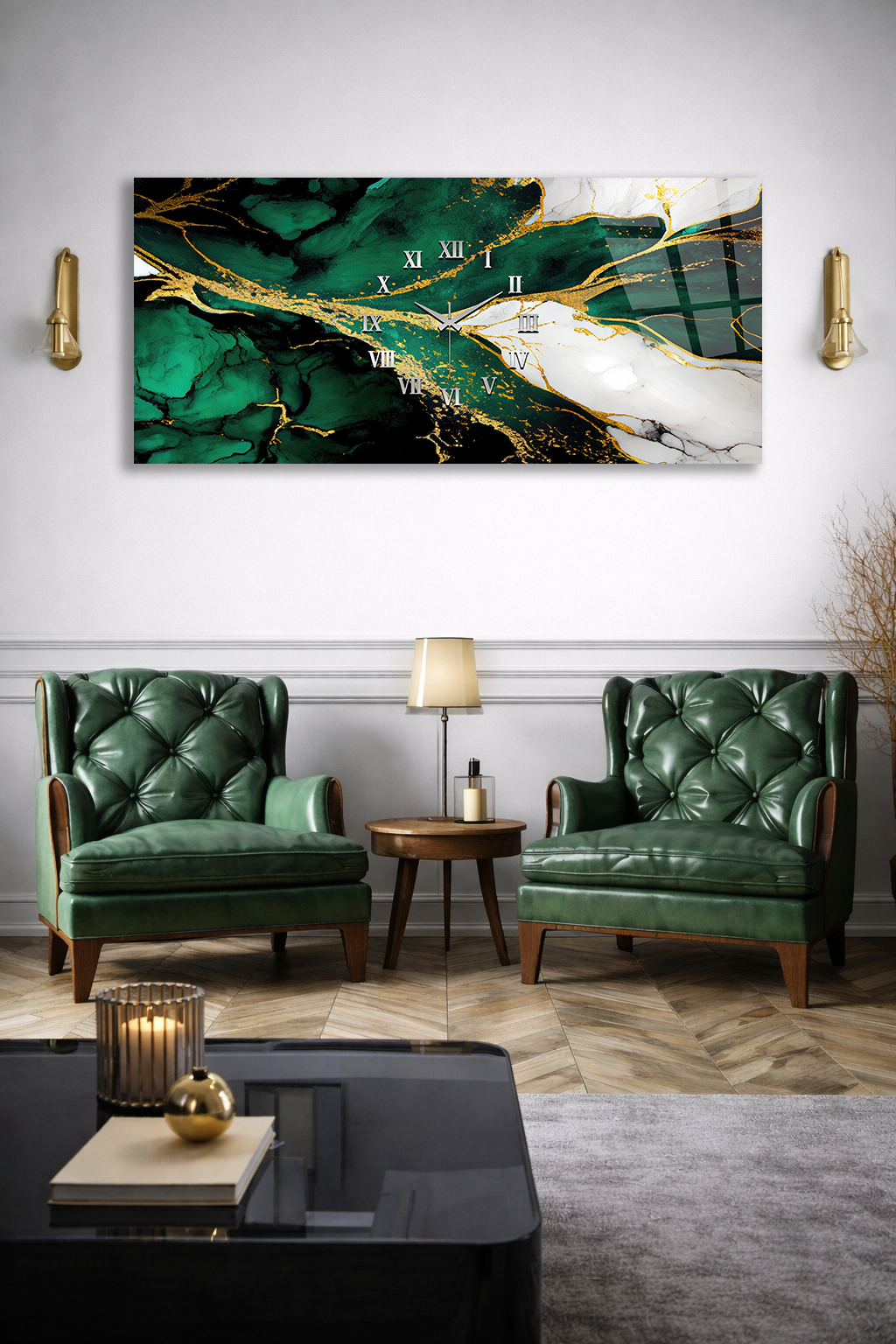 KIRILMAZ CAM DUVAR SAATİ , HEM TABLO HEM SAAT YEŞİL MERMER ALTIN DETAY LÜKS TASARIM EV OFİS HEDİYESİ