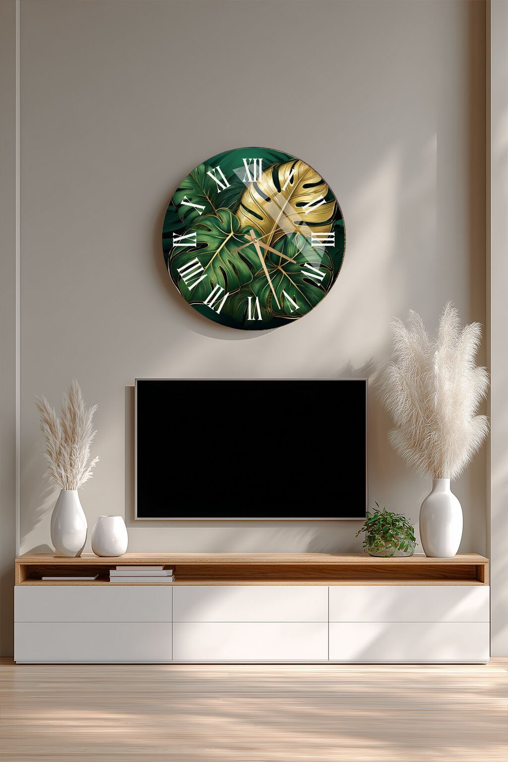 KIRILMAZ CAM DUVAR SAATİ, HEM TABLO HEM SAAT YEŞİL MONSTERA YAPRAK ALTIN DETAY ROMEN RAKAM EV OFİS HEDİYESİ