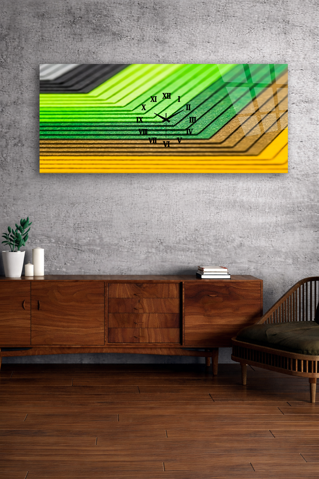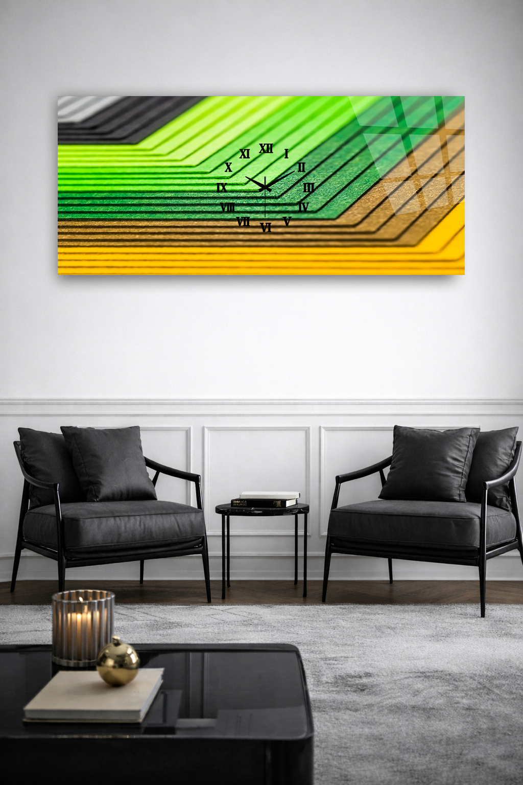 KIRILMAZ CAM DUVAR SAATİ , HEM TABLO HEM SAAT YEŞİL SARI ÇİZGİLİ EV OFİS HEDİYESİ
