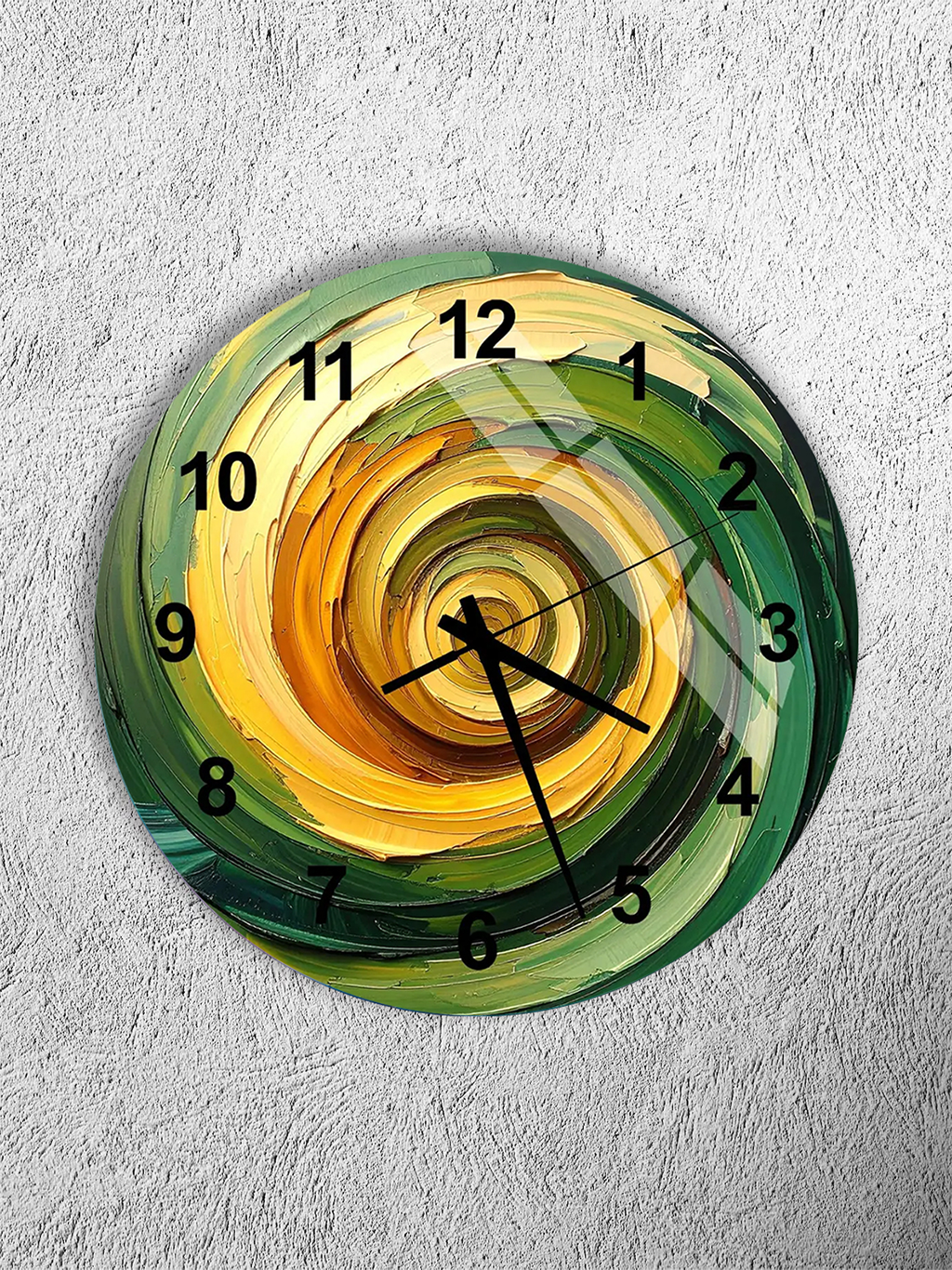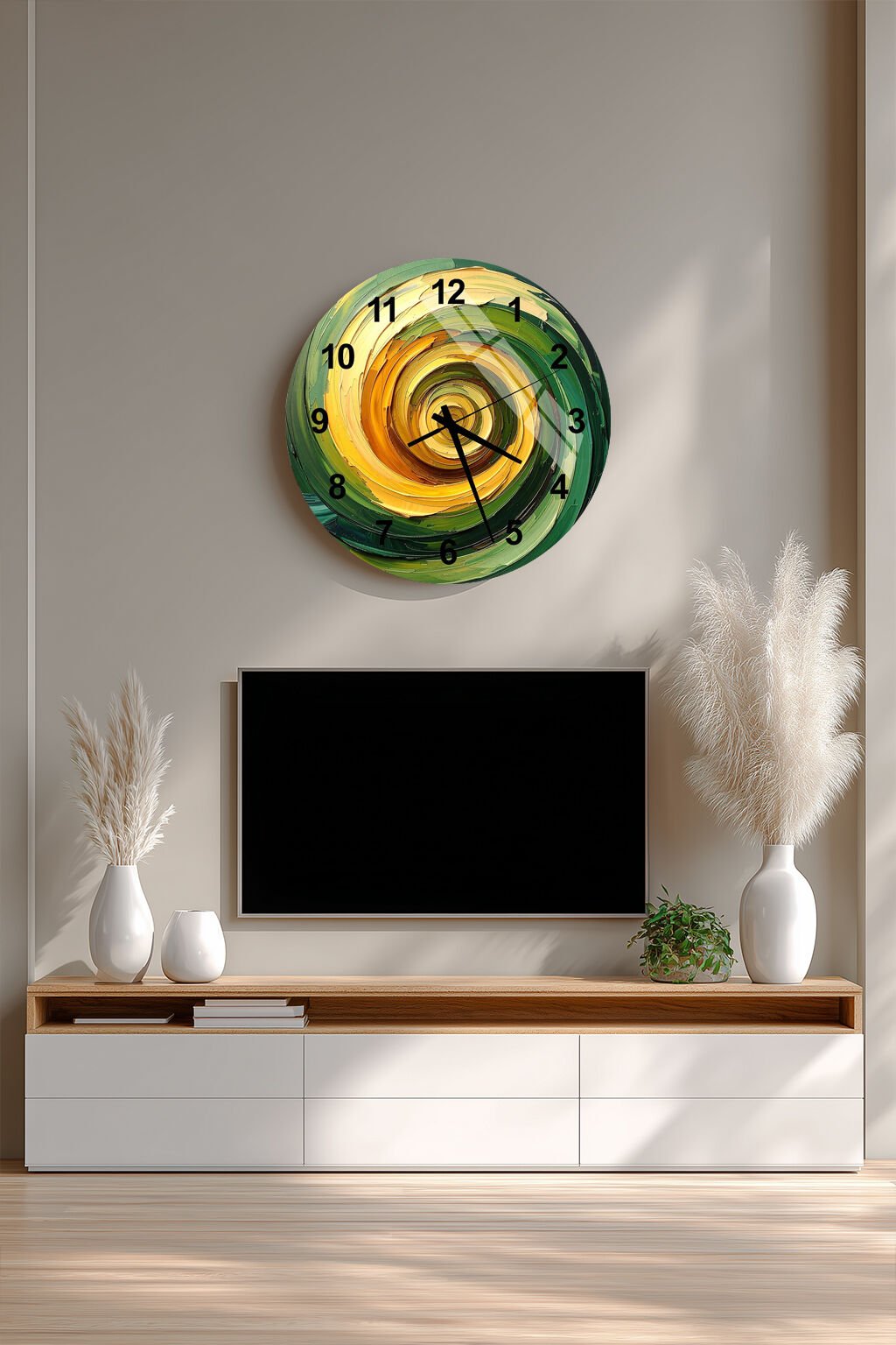 KIRILMAZ CAM DUVAR SAATİ, HEM TABLO HEM SAAT YEŞİL SARI SPİRAL SOYUT SAYILI EV OFİS HEDİYESİ