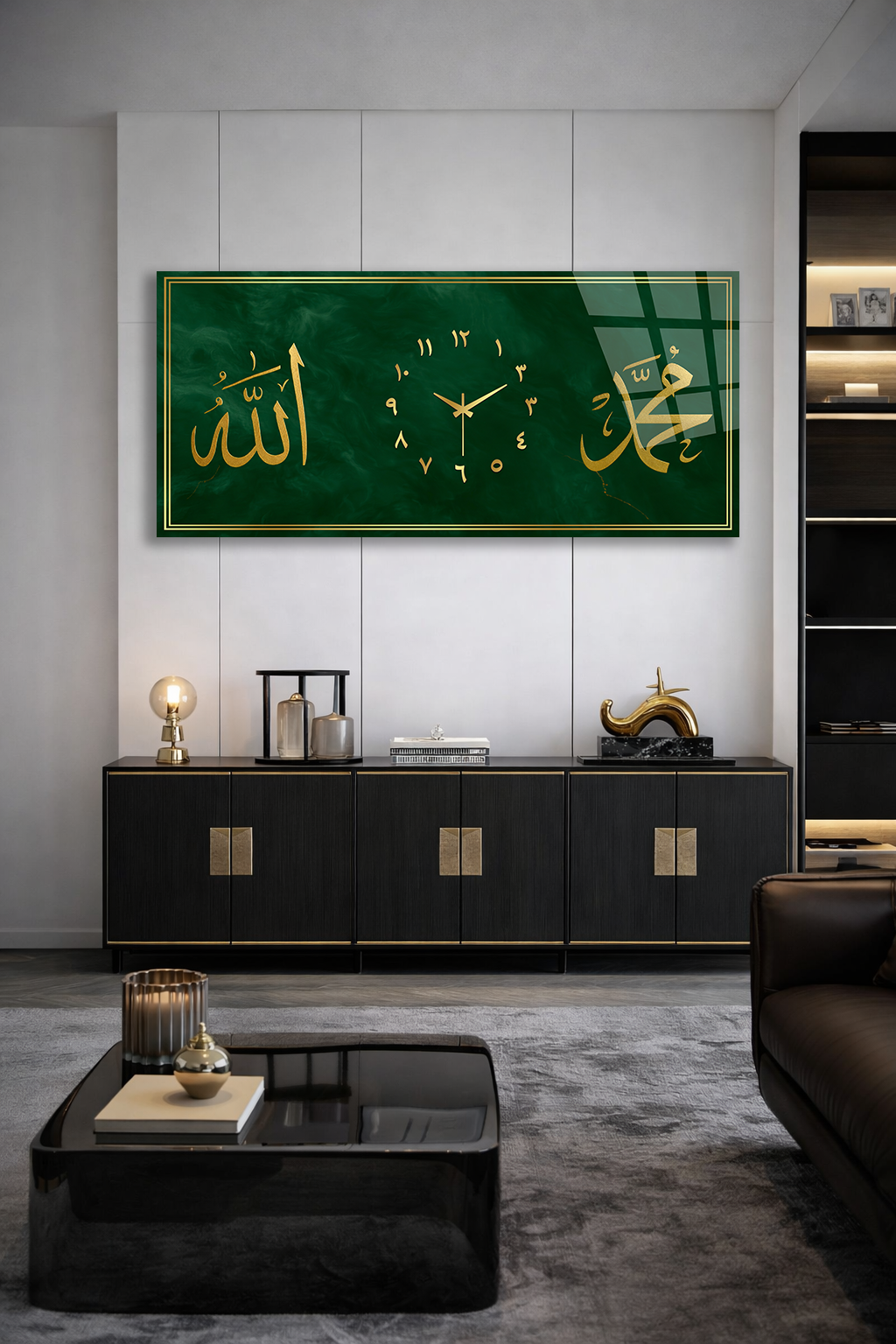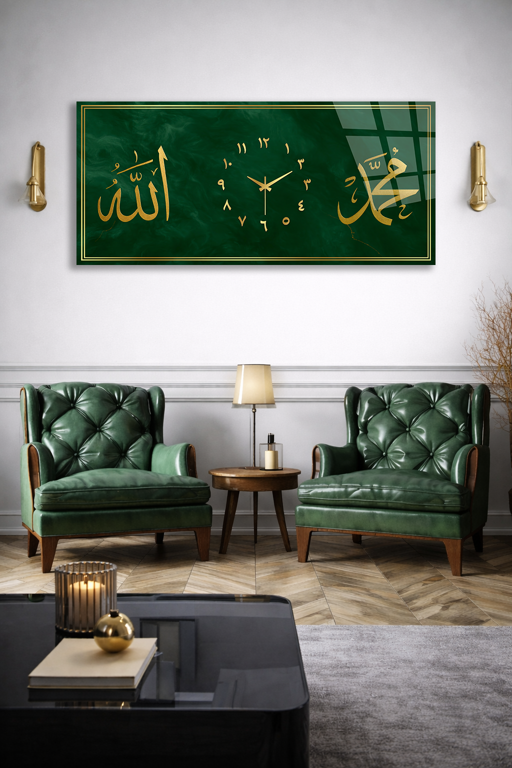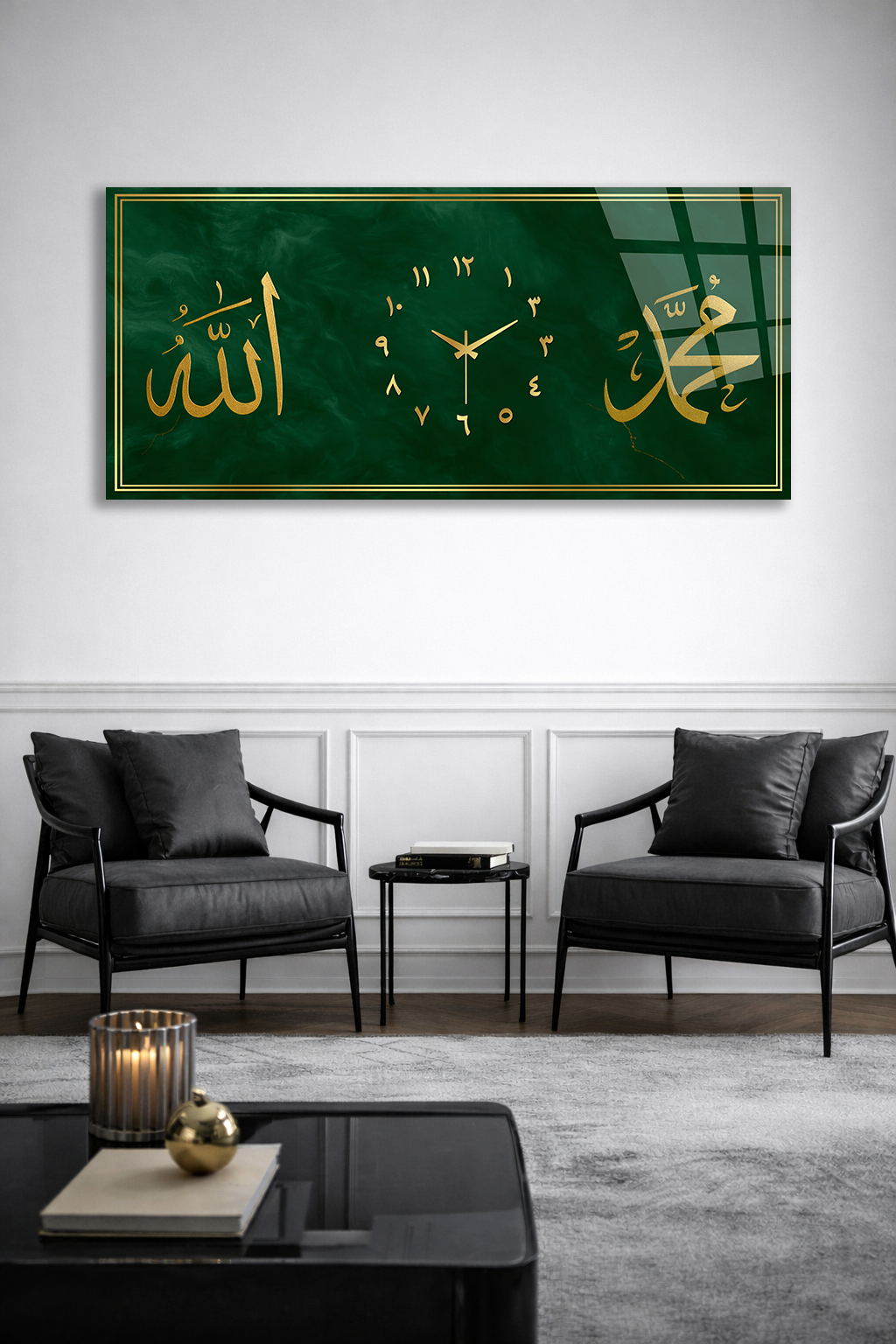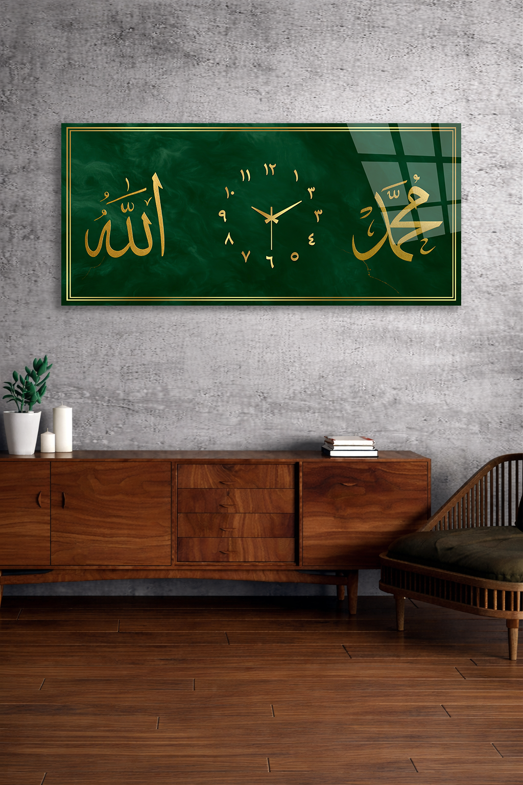 KIRILMAZ CAM DUVAR SAATİ , HEM TABLO HEM SAAT YEŞİL ZEMİN ALLAH MUHAMMED HAT SANATI EV OFİS HEDİYESİ