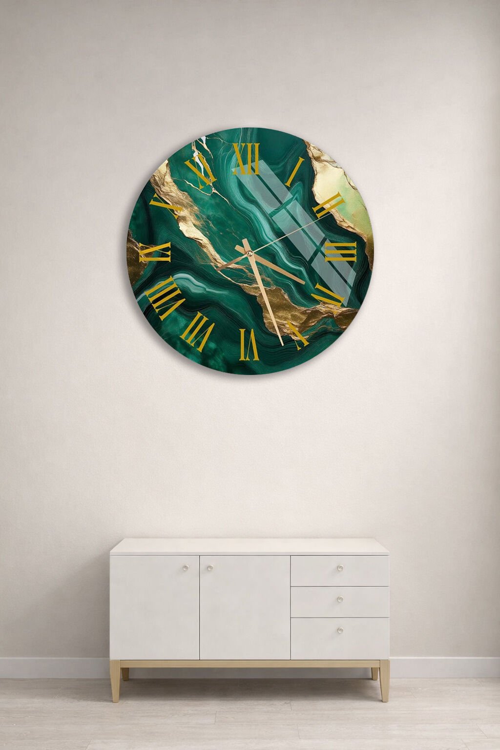 KIRILMAZ CAM DUVAR SAATİ , HEM TABLO HEM SAAT ZÜMRÜT YEŞİLİ ALTIN DAMARLI ROMEN RAKAMLI LÜKS EV OFİS HEDİYESİ