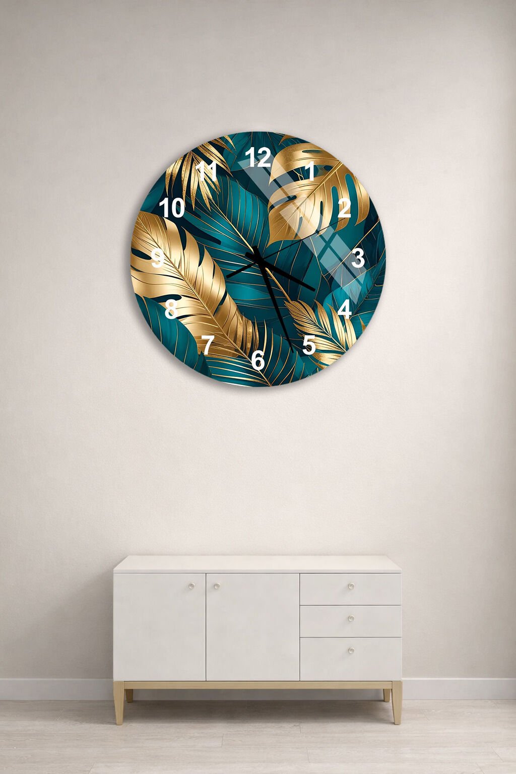 KIRILMAZ CAM DUVAR SAATİ, HEM TABLO HEM SAAT ZÜMRÜT YEŞİLİ ALTIN YAPRAK DESENİ EV OFİS HEDİYESİ
