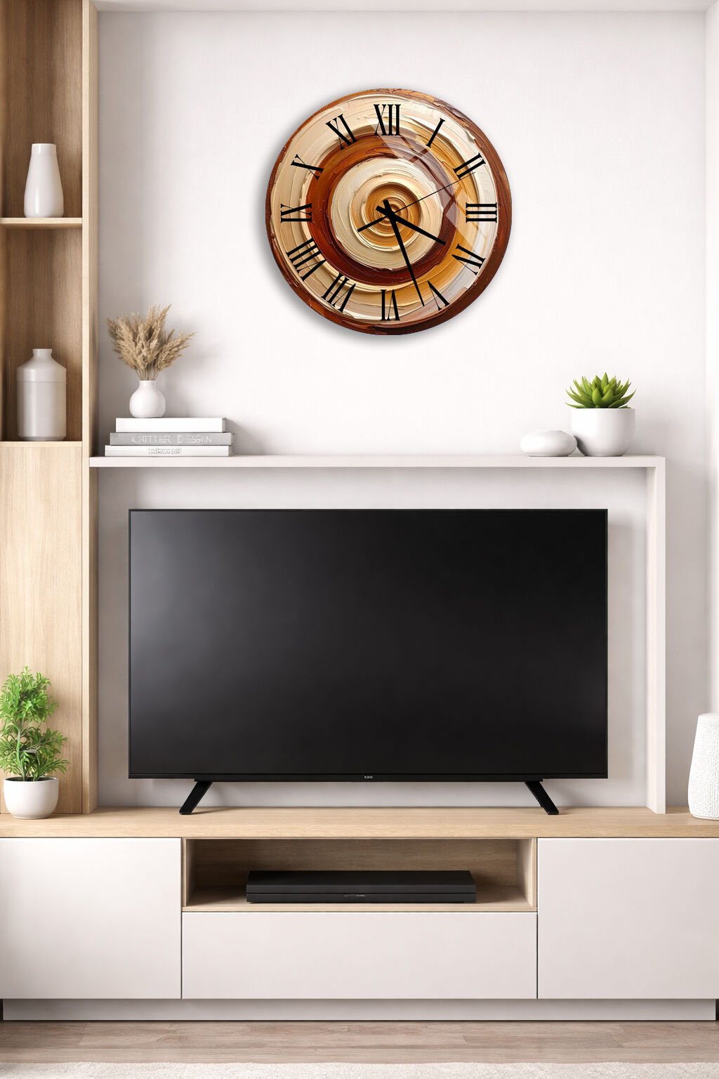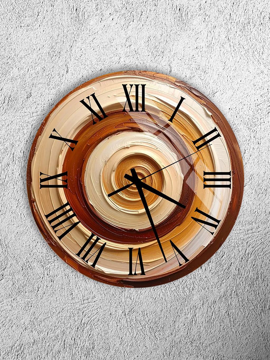 KIRILMAZ CAM DUVAR SAATİ, KAHVE TONLARI DAİRESEL SOYUT DESENLİ, HEM TABLO HEM SAAT EV OFİS HEDİYESİ