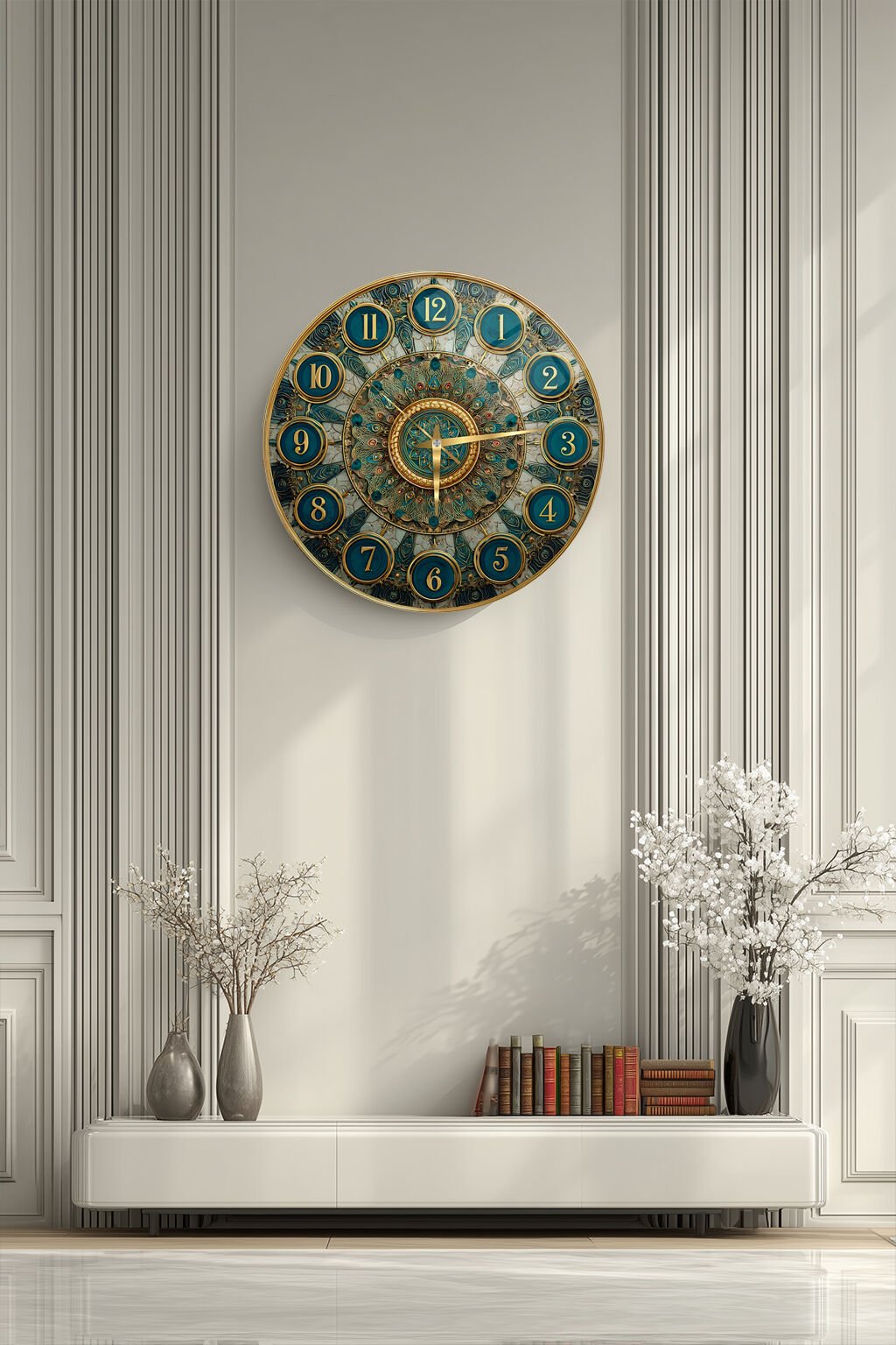 KIRILMAZ CAM DUVAR SAATİ, OSMANLI MOTİFLİ TURKUAZ ALTIN DETAYLI MANDALA TASARIMI, HEM TABLO HEM SAAT EV OFİS HEDİYESİ