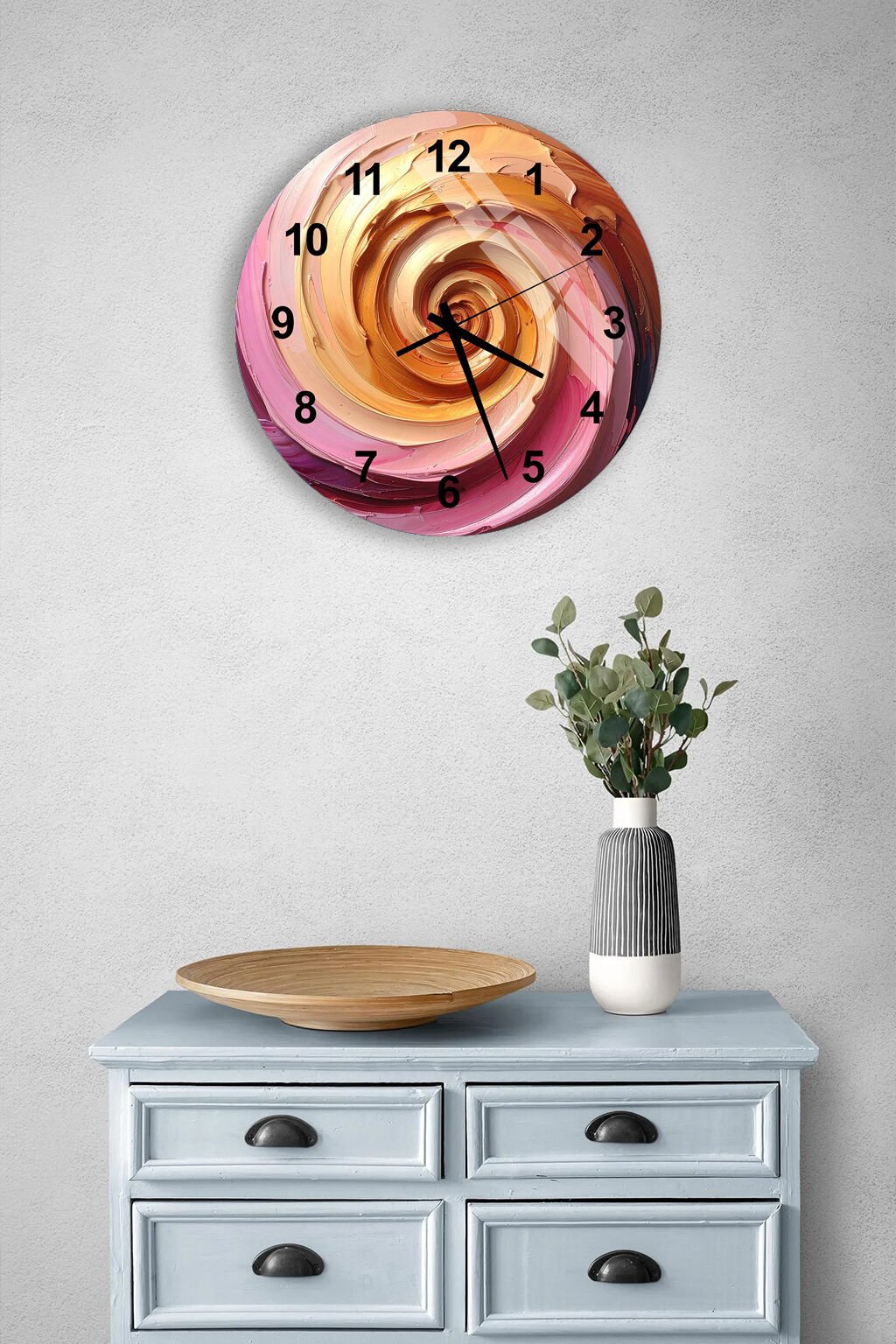 KIRILMAZ CAM DUVAR SAATİ, SOYUT SPİRAL RENK GEÇİŞLİ MODERN TASARIM, HEM TABLO HEM SAAT, EV OFİS HEDİYESİ