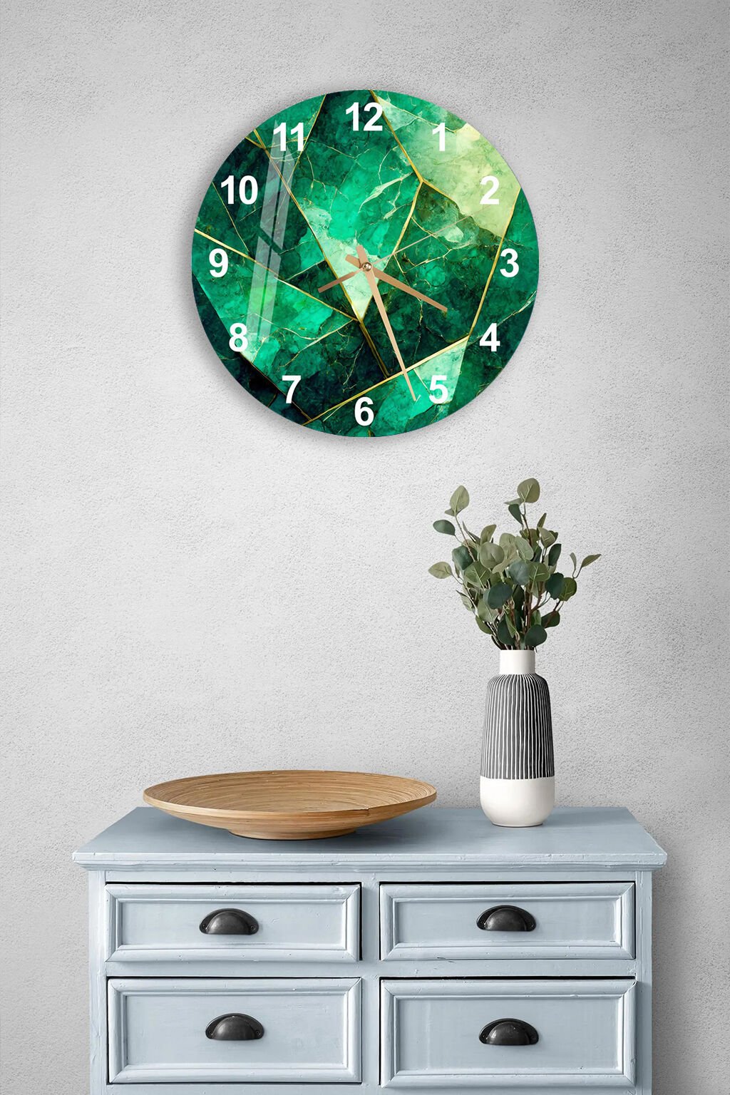 KIRILMAZ CAM DUVAR SAATİ, YEŞİL MERMER GOLD DAMARLI, HEM TABLO HEM SAAT, ŞIK EV OFİS HEDİYESİ