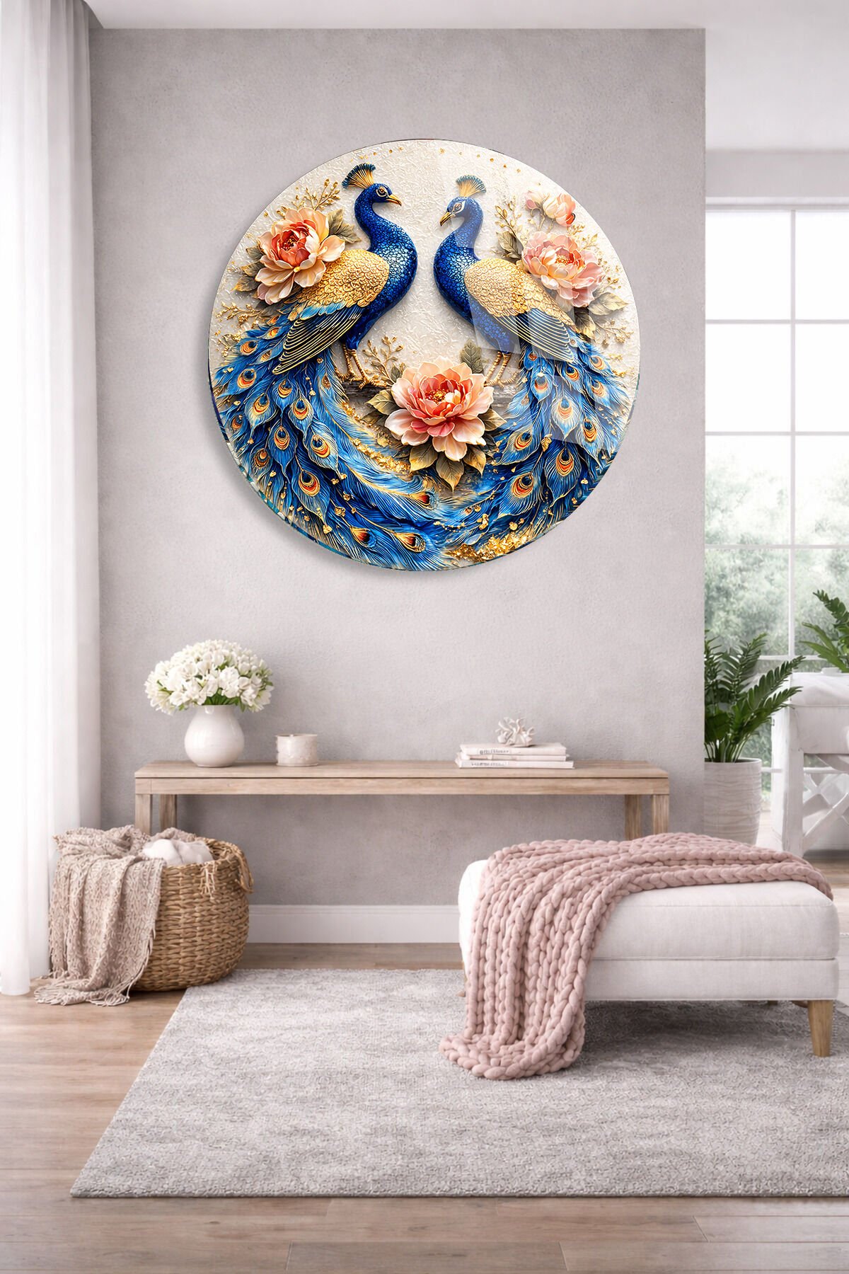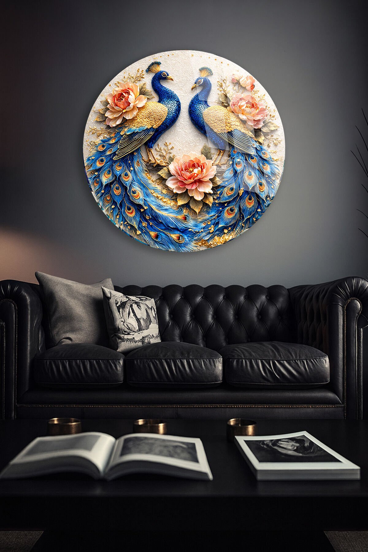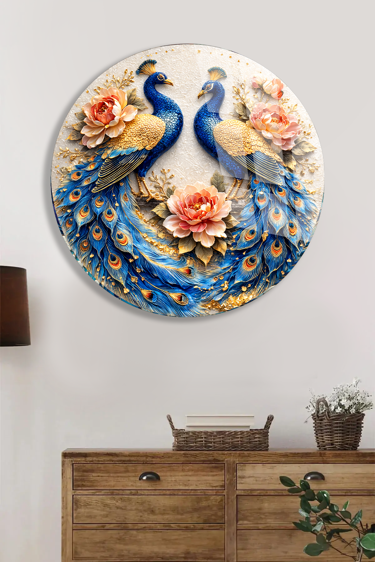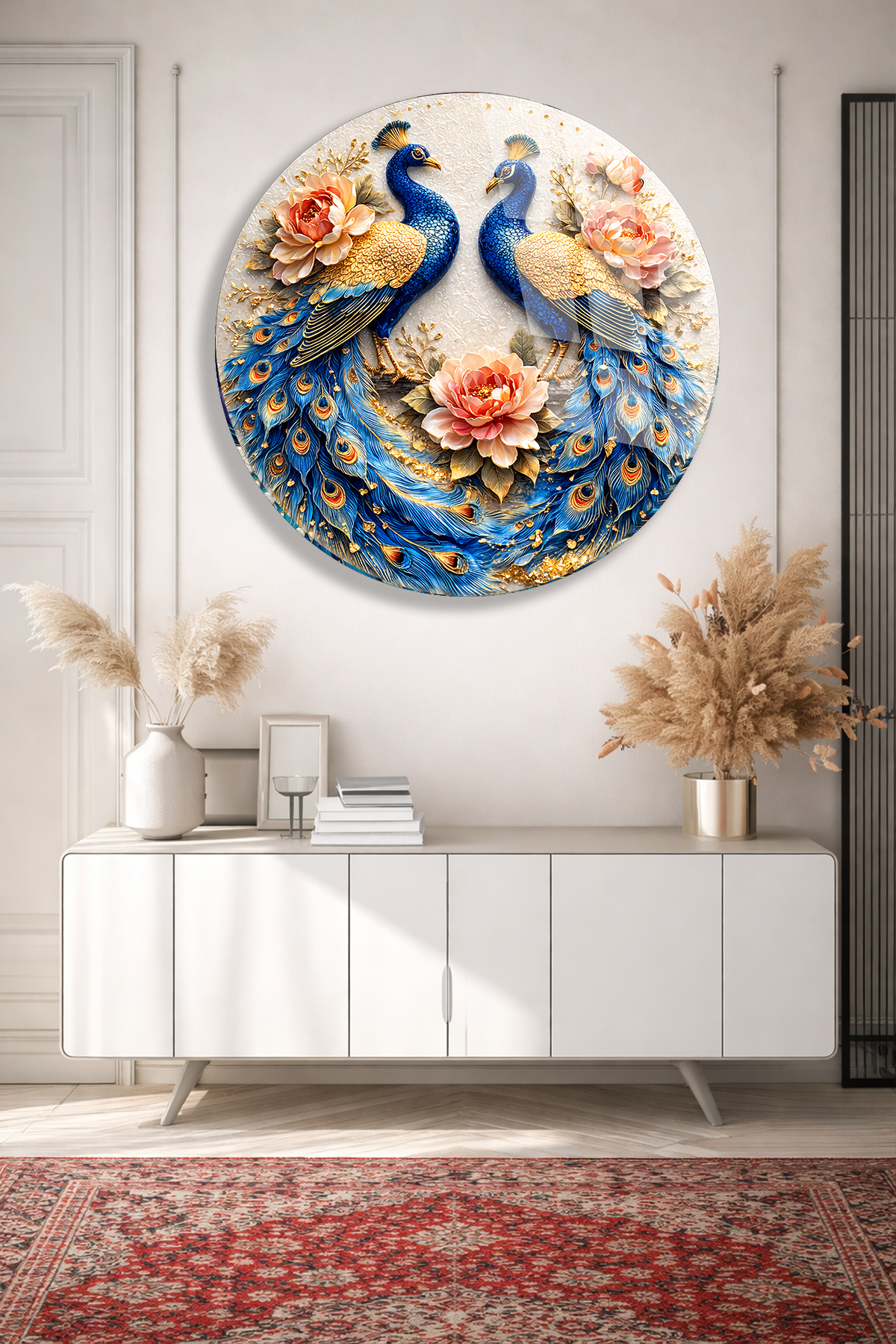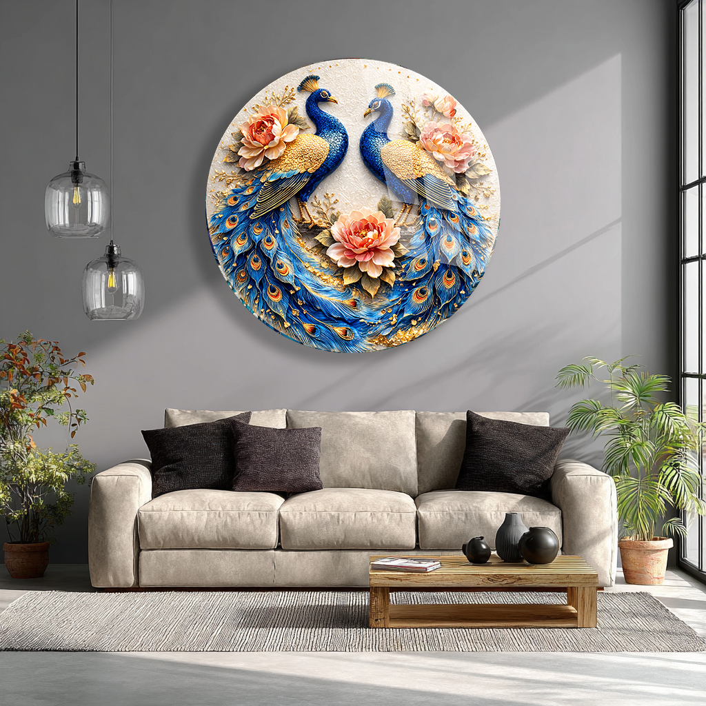 KIRILMAZ CAM DUVAR TABLOSU – ÇİFT TAVUS KUŞU ÇİÇEKLİ SANAT TASARIMI | LÜKS DEKOR
