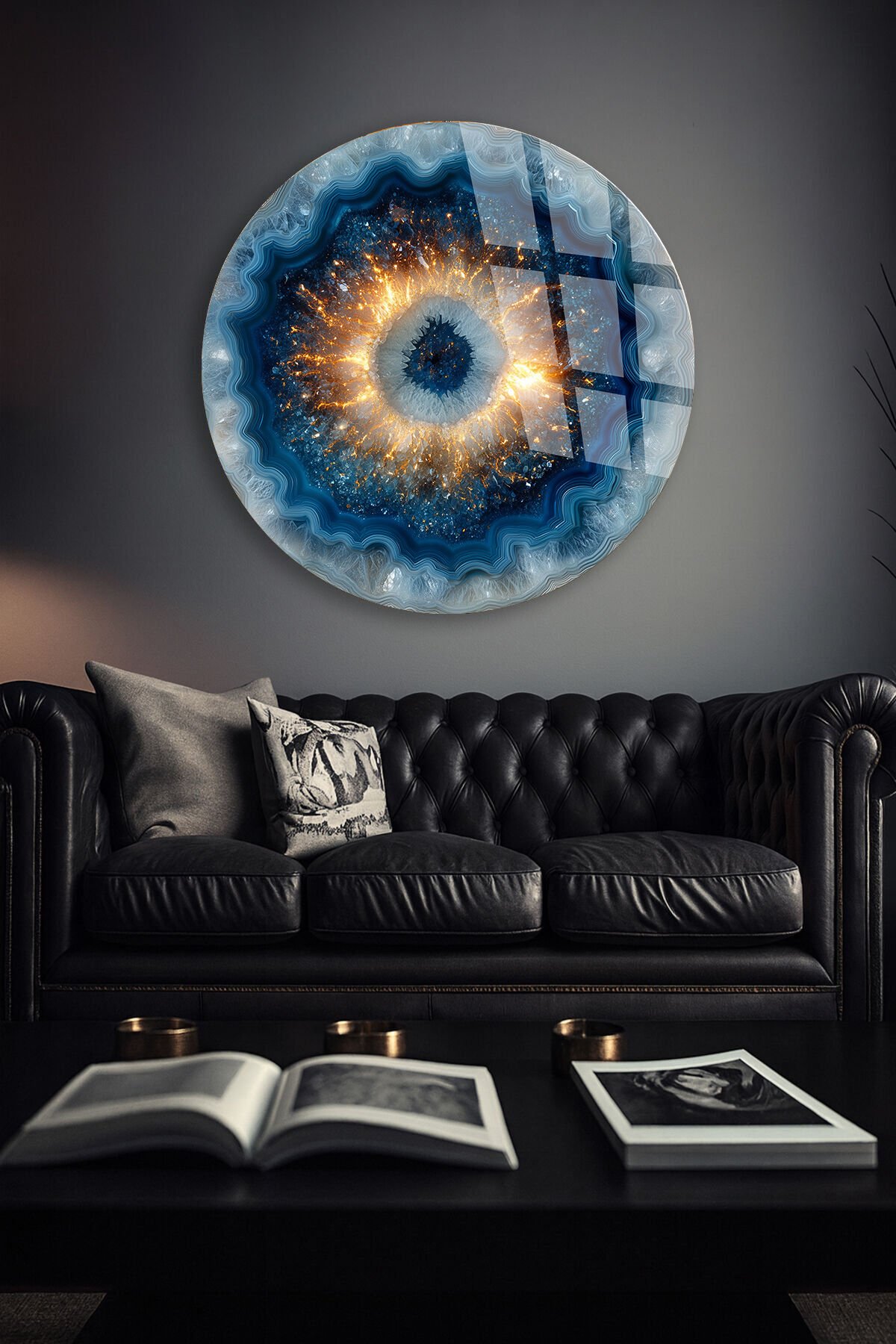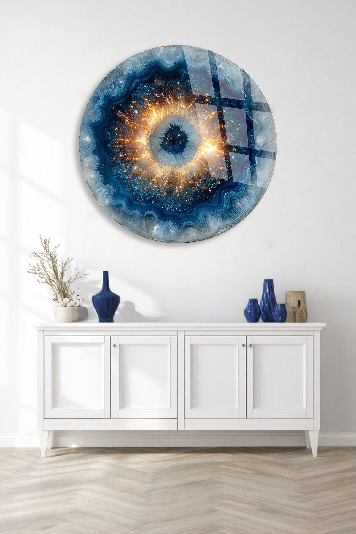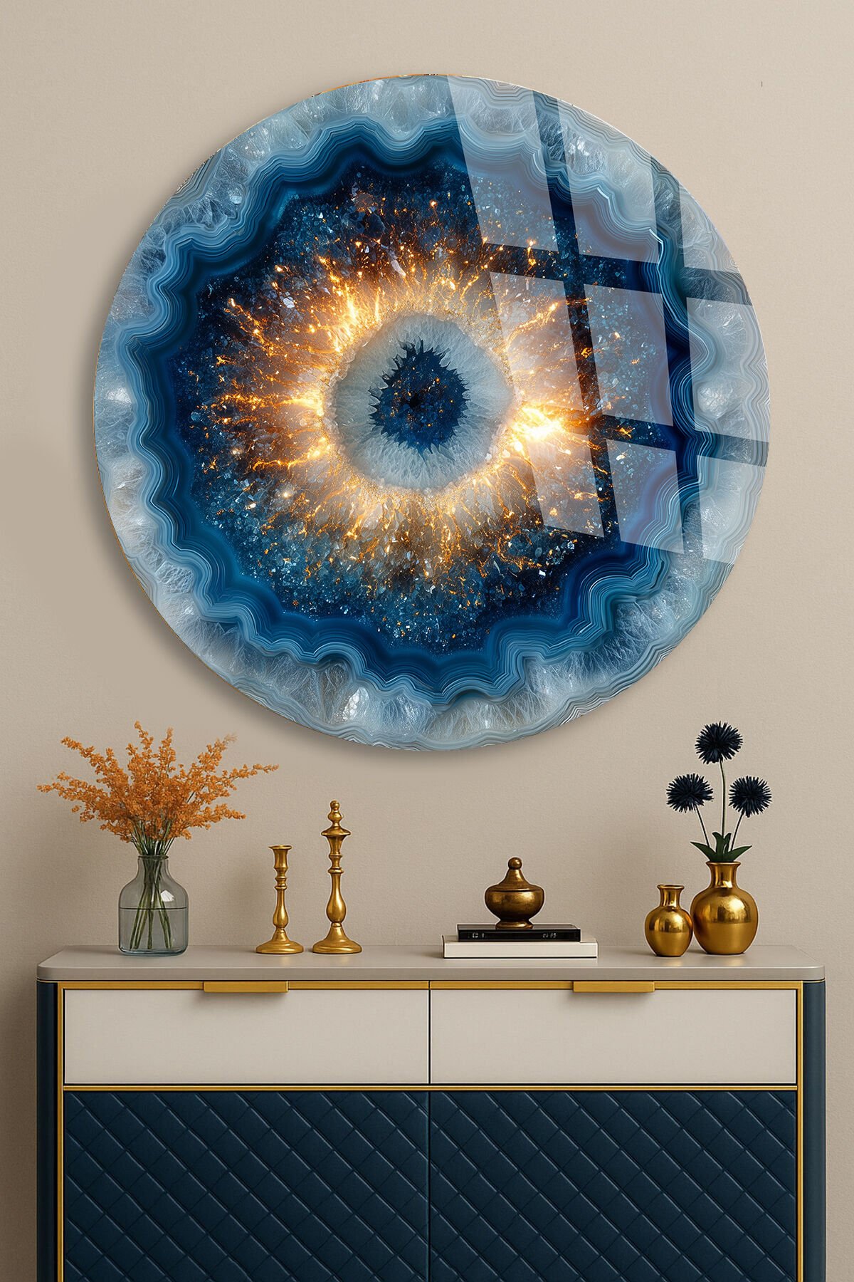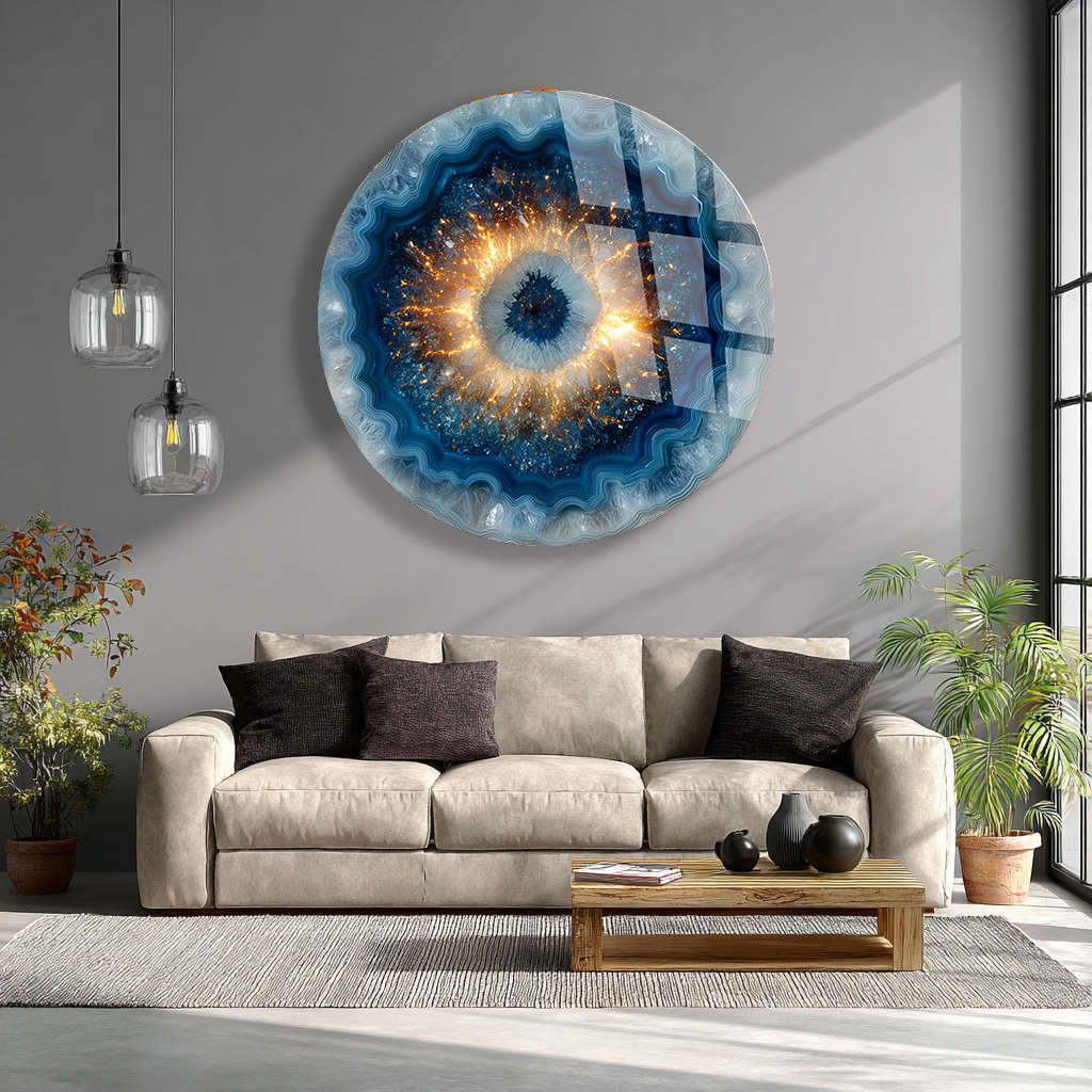KIRILMAZ CAM DUVAR TABLOSU – MAVİ KOZMİK GÖZ SOYUT SANAT TASARIMI | LÜKS MODERN DEKOR