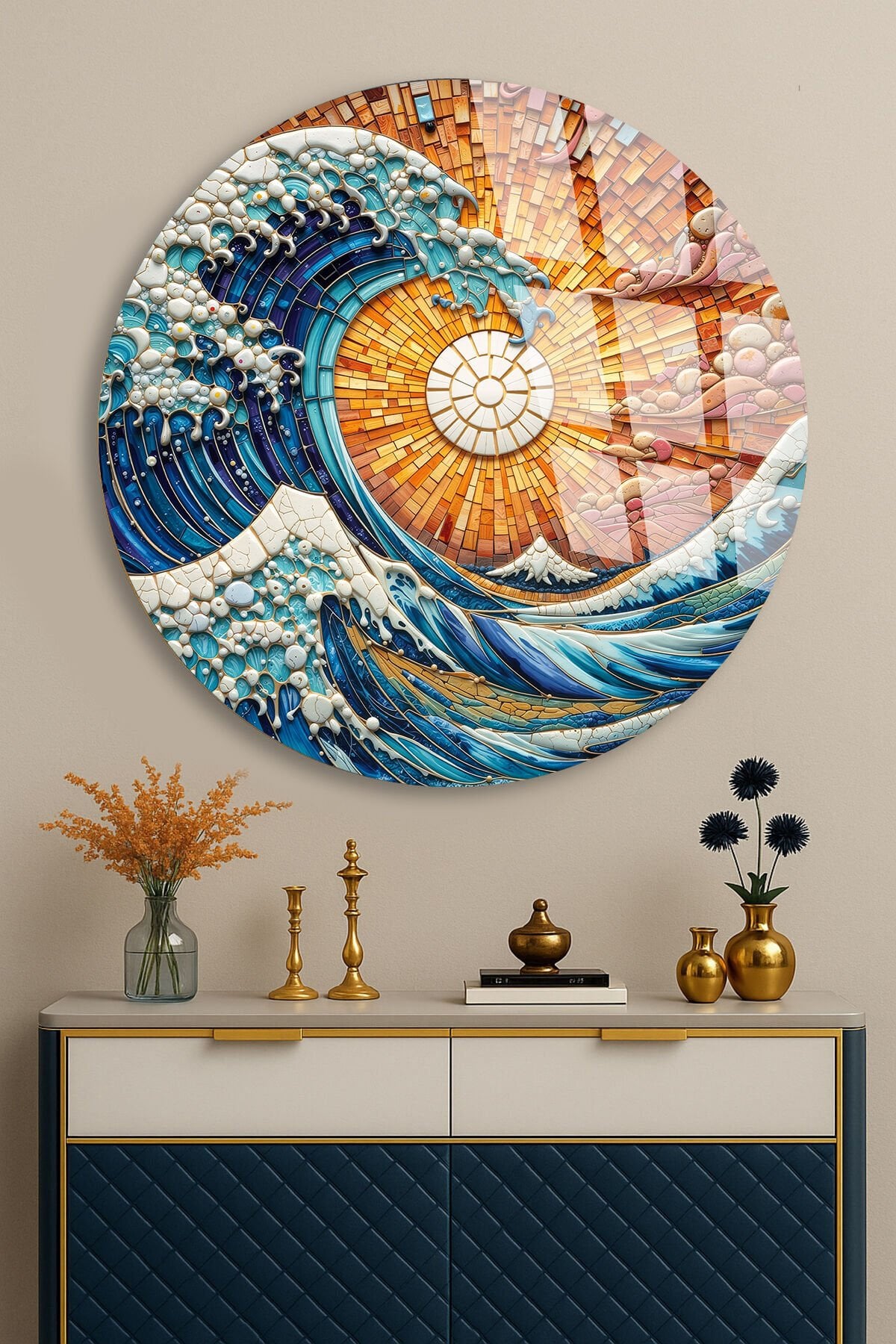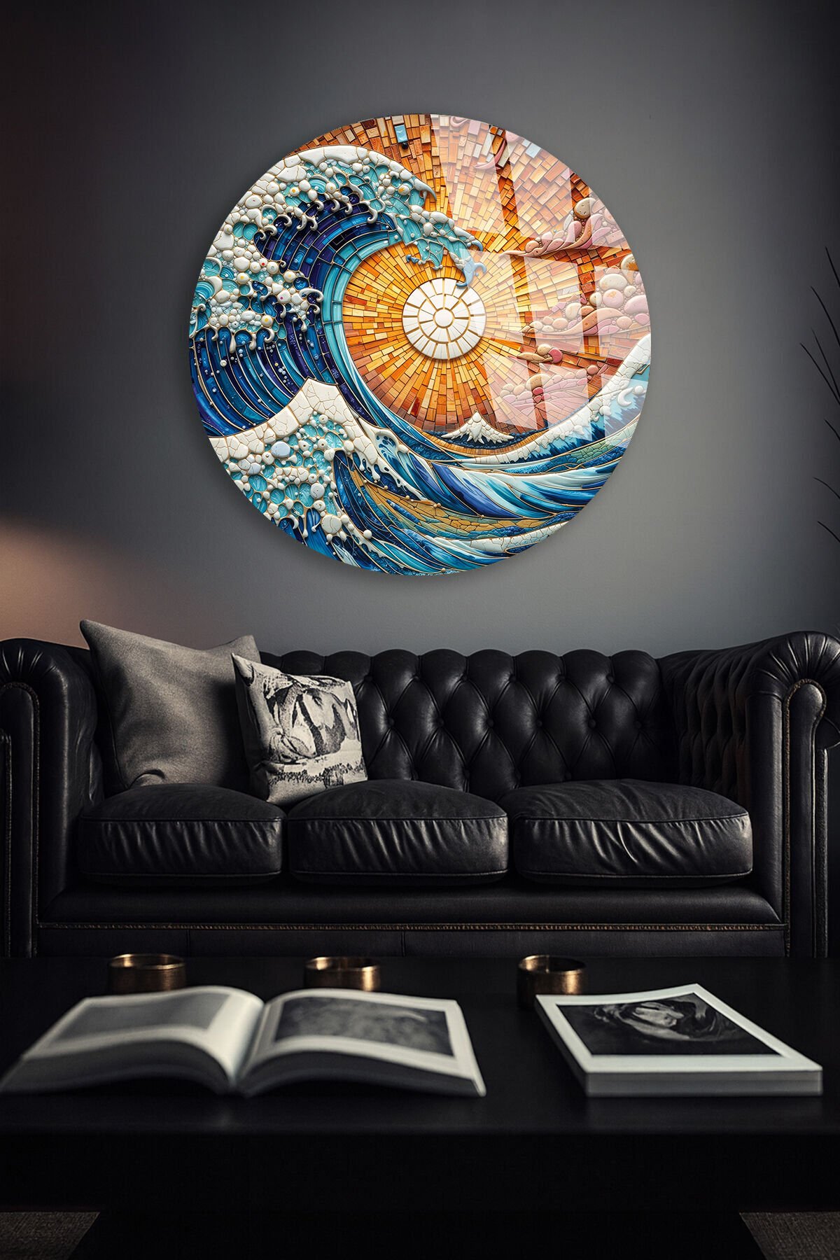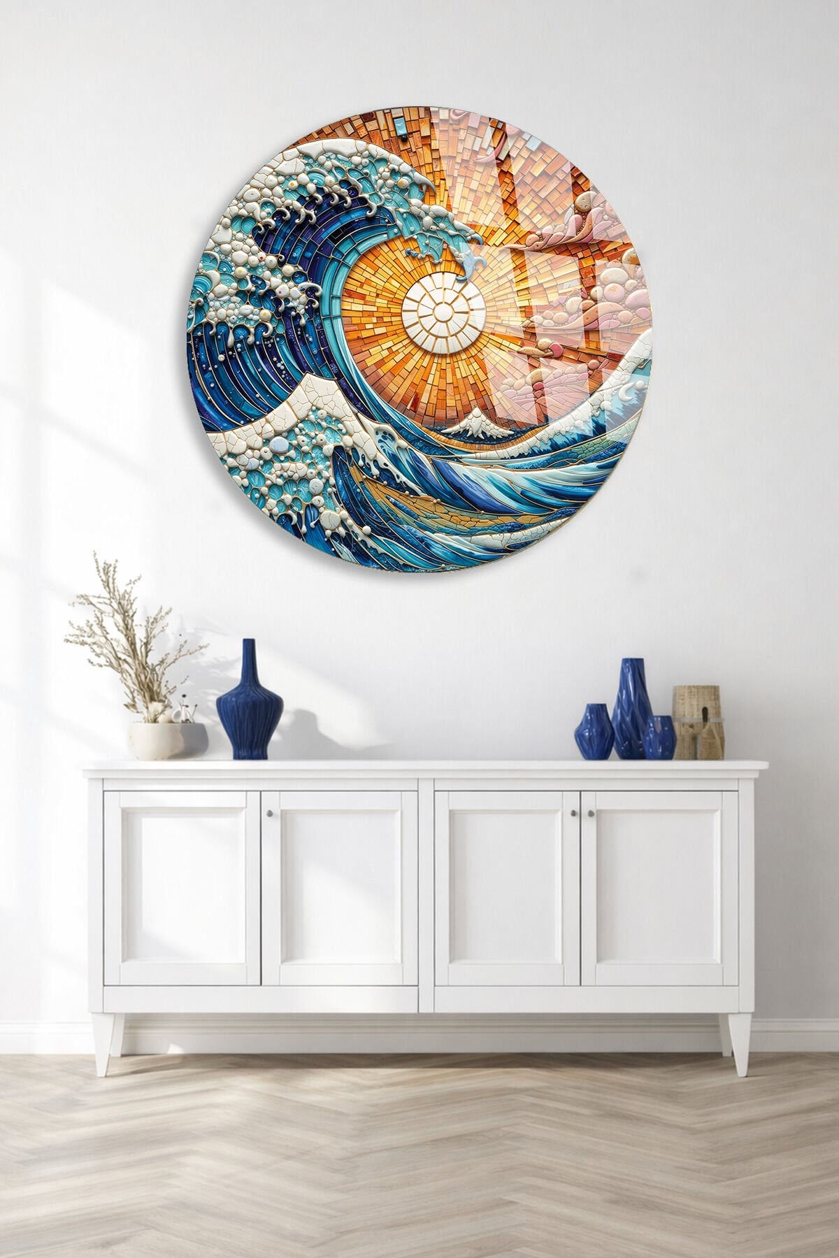 KIRILMAZ CAM DUVAR TABLOSU – OKYANUS DALGA MOZAİK SANAT TASARIMI | MODERN DENİZ TEMASI