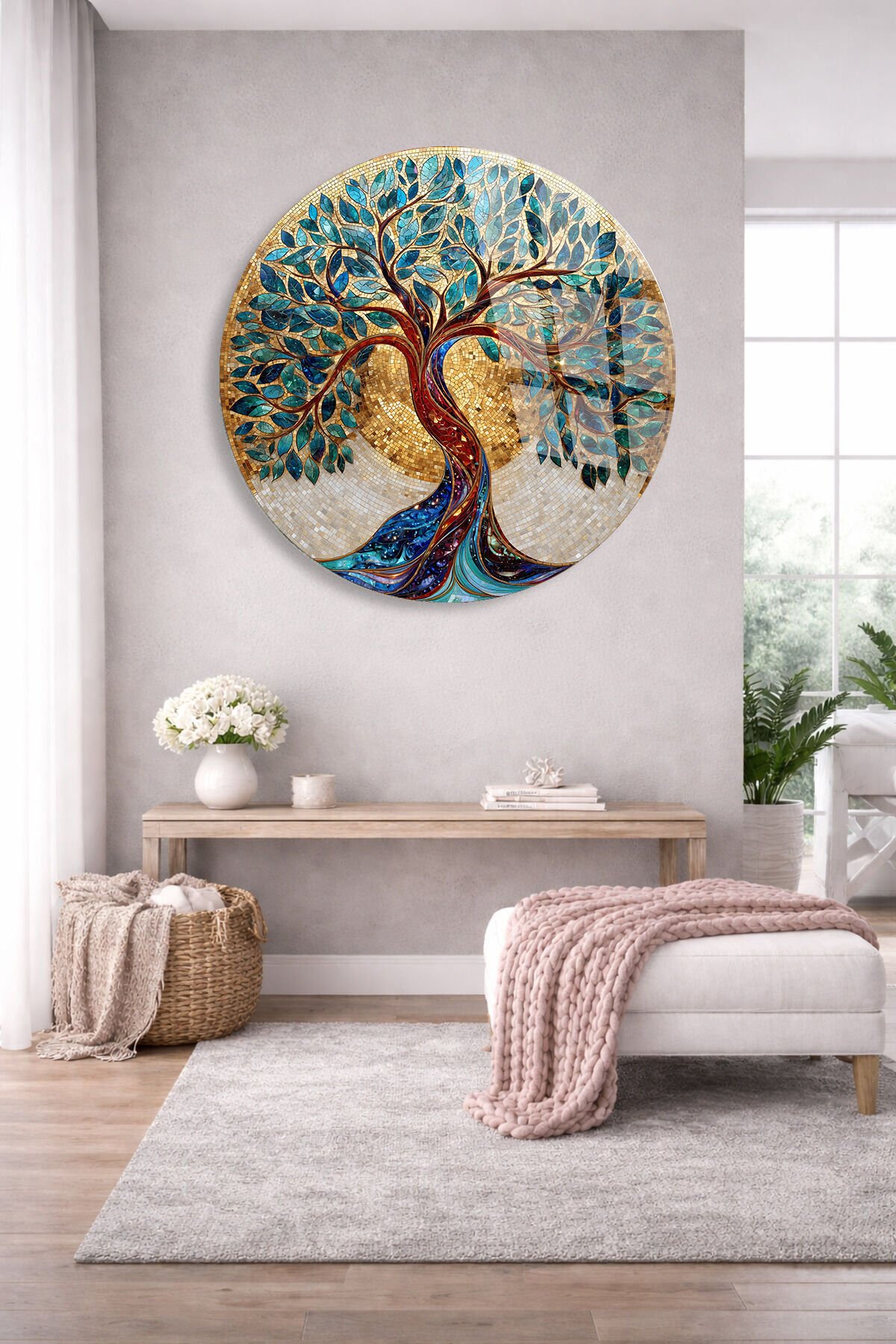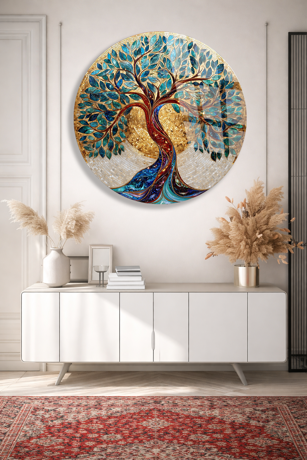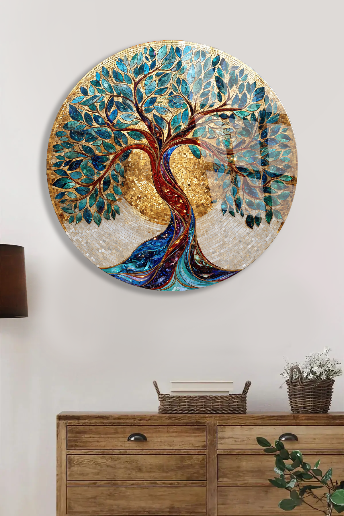 KIRILMAZ CAM TABLO – ALTIN ZEMİN ÜZERİ TURKUAZ HAYAT AĞACI SANAT TASARIMI