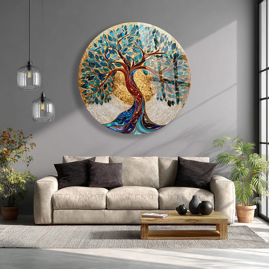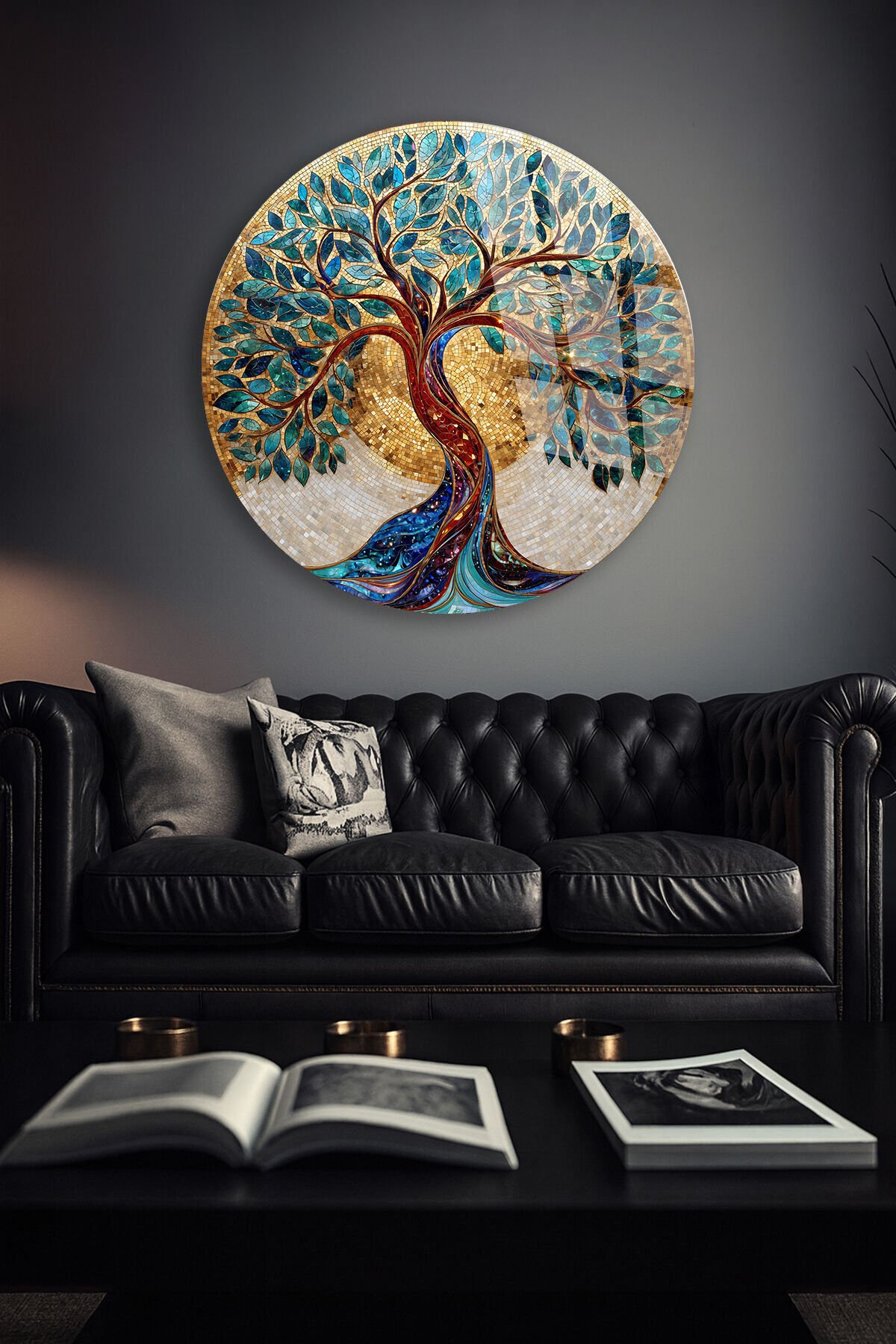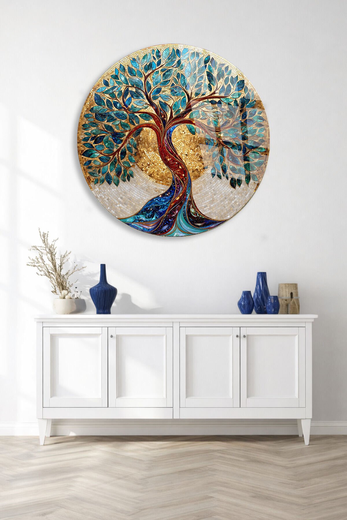 KIRILMAZ CAM TABLO – ALTIN ZEMİN ÜZERİ TURKUAZ HAYAT AĞACI SANAT TASARIMI