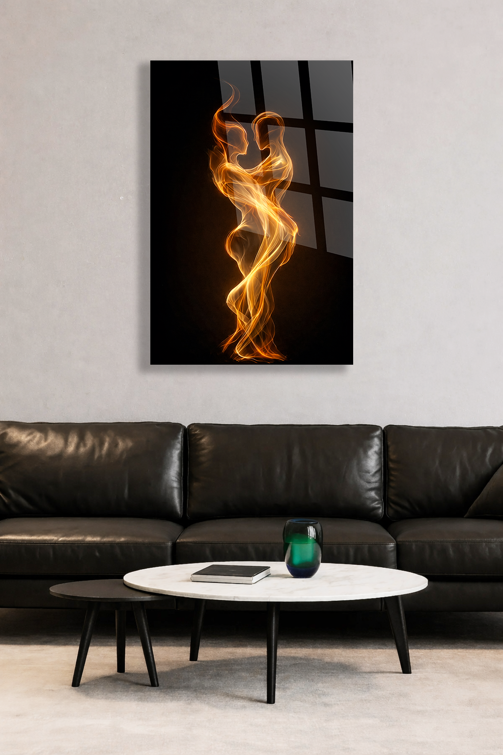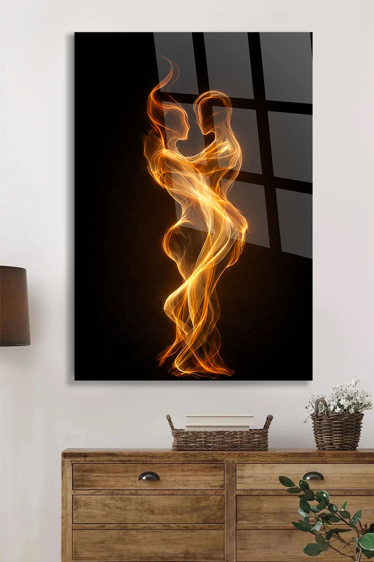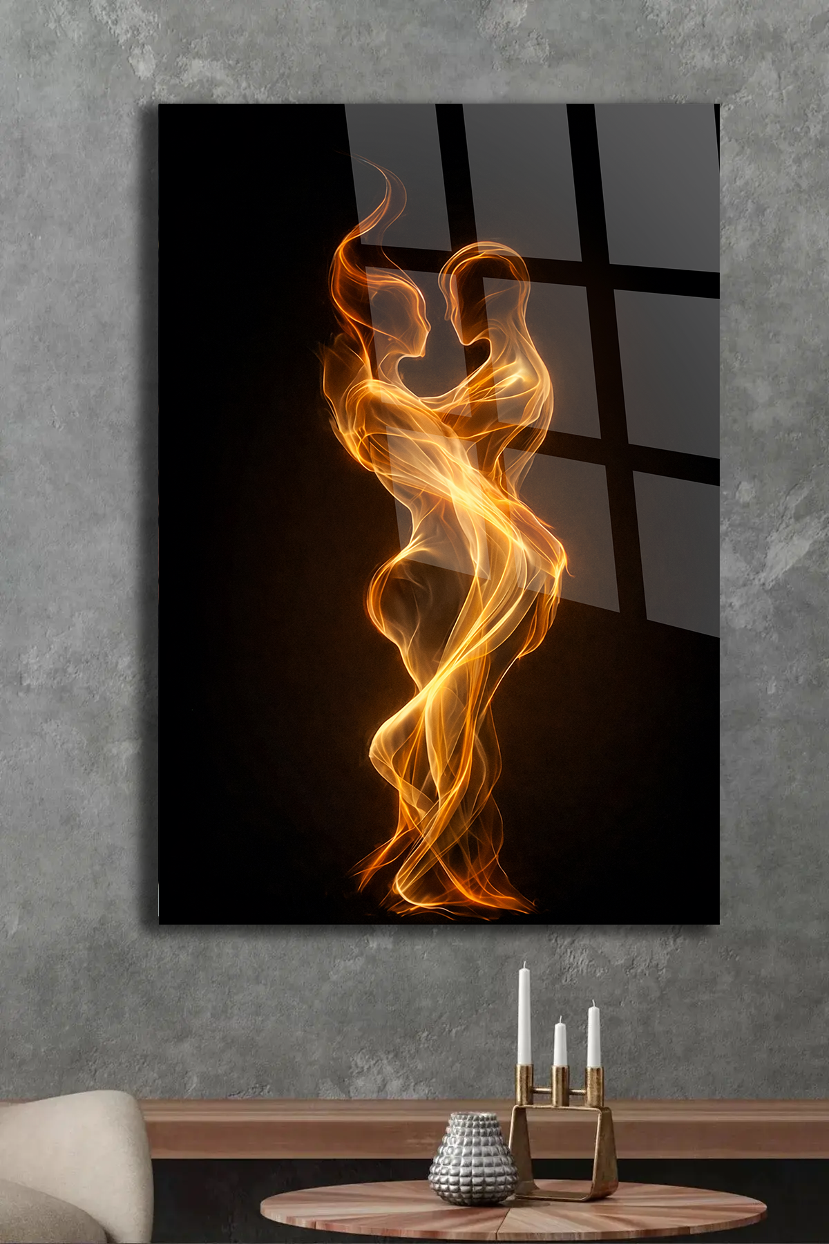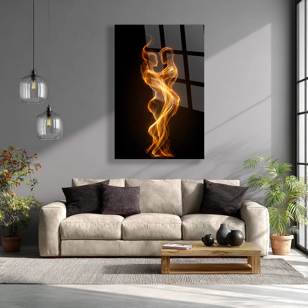 KIRILMAZ CAM TABLO AŞK VE BİRLİKTE DANS EDEN IŞIK SİLÜETLERİ SOYUT TASARIM