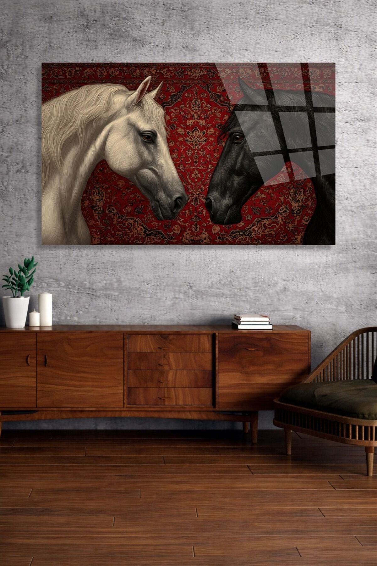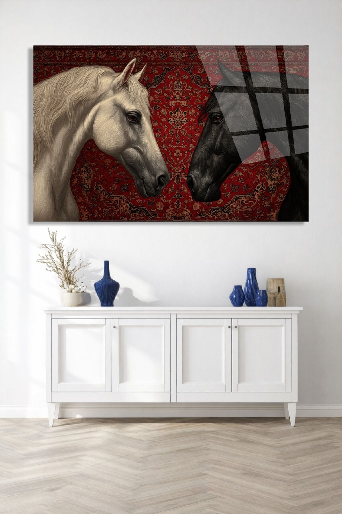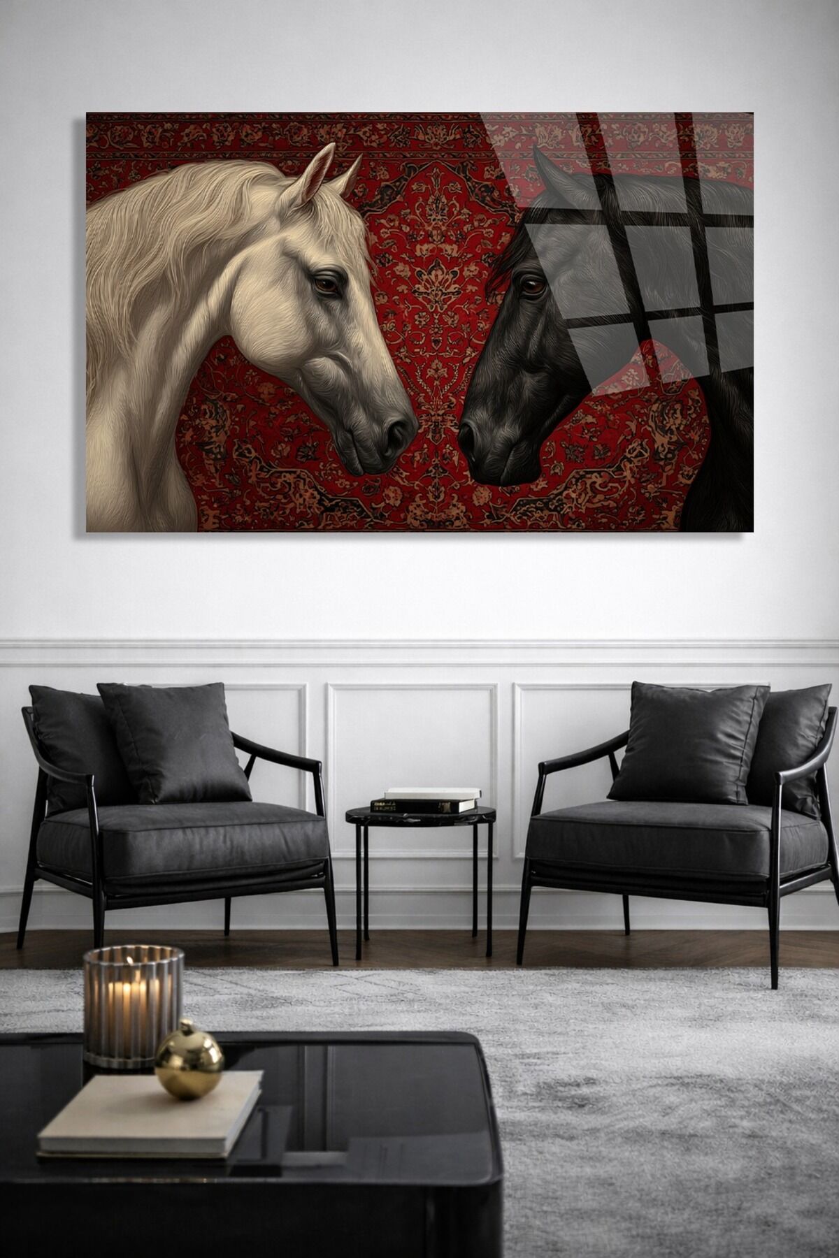 KIRILMAZ CAM TABLO BEYAZ VE SİYAH AT İRAN HALISI DESENİ Kırmızı