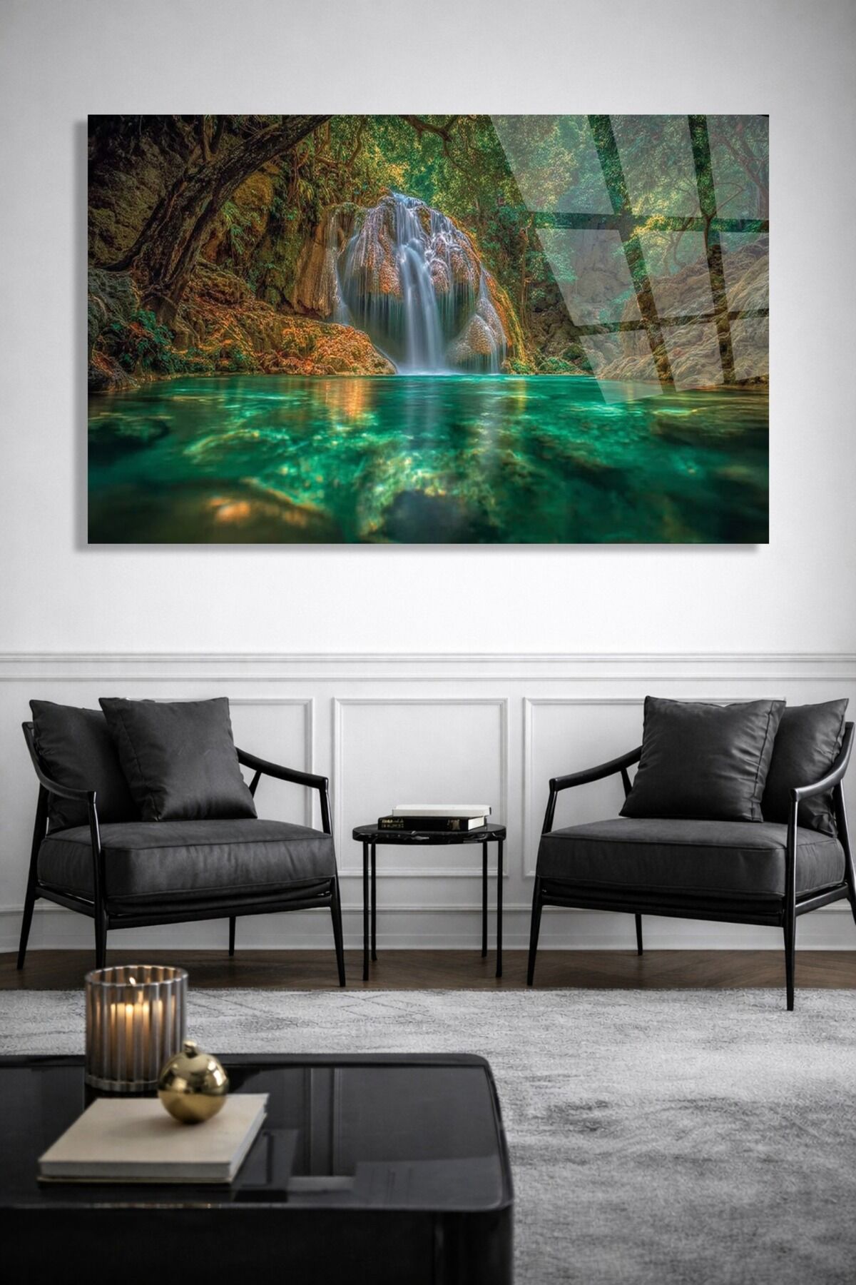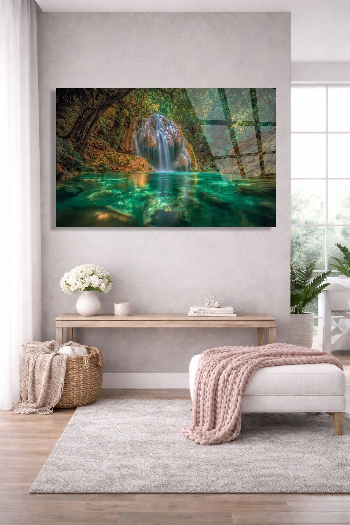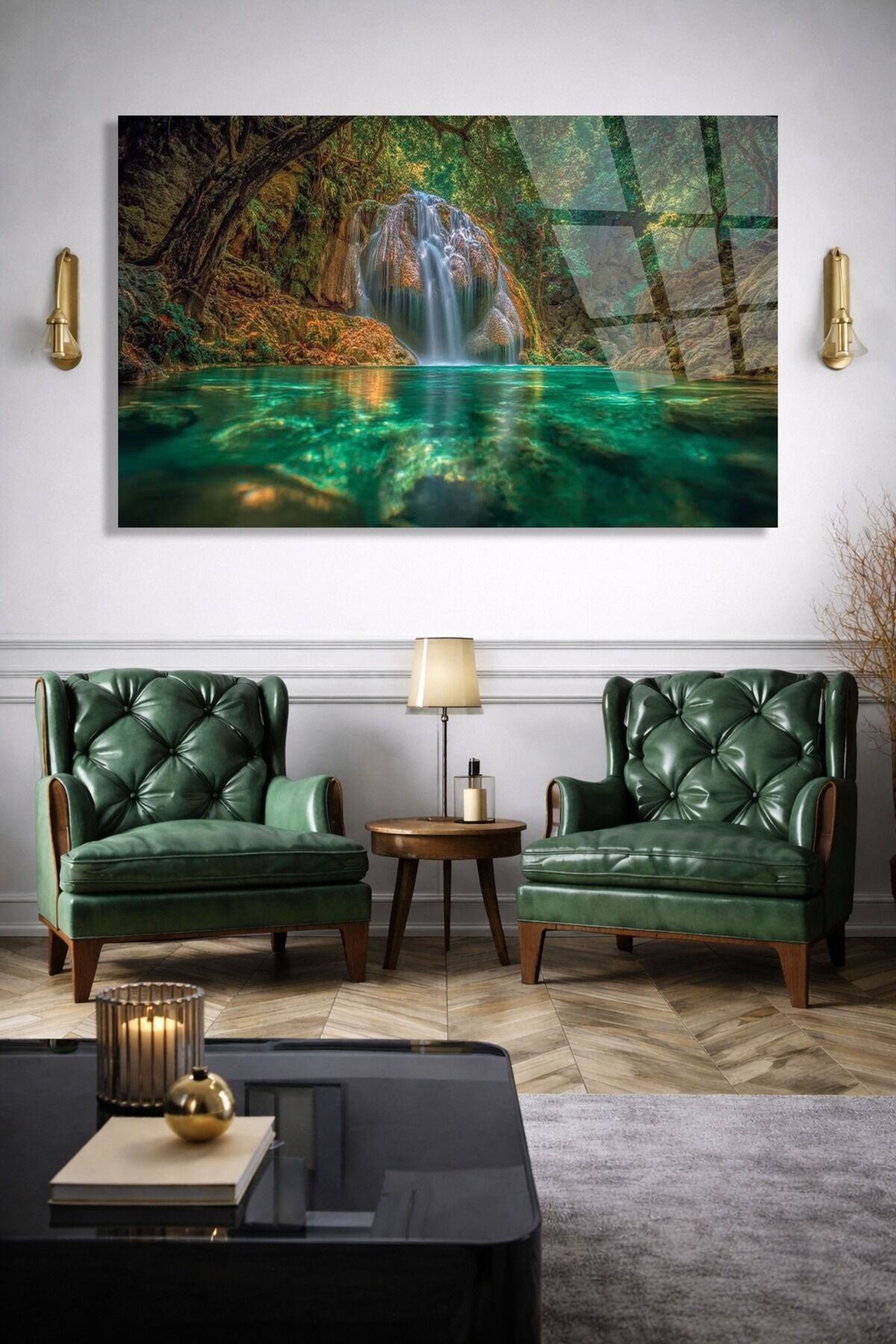KIRILMAZ CAM TABLO DOĞA ŞELALE MANZARALI DUVAR TABLOSU Yeşil