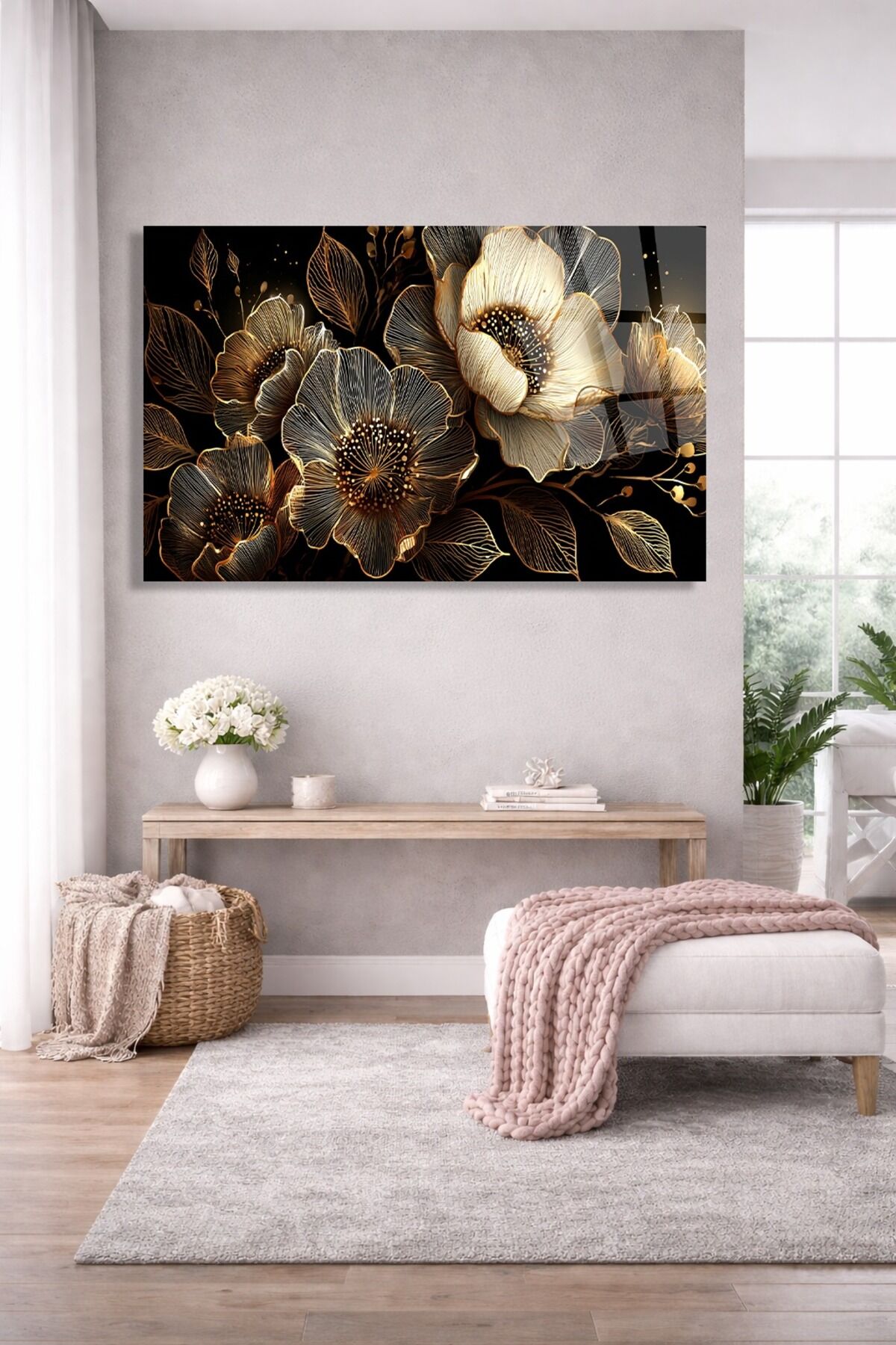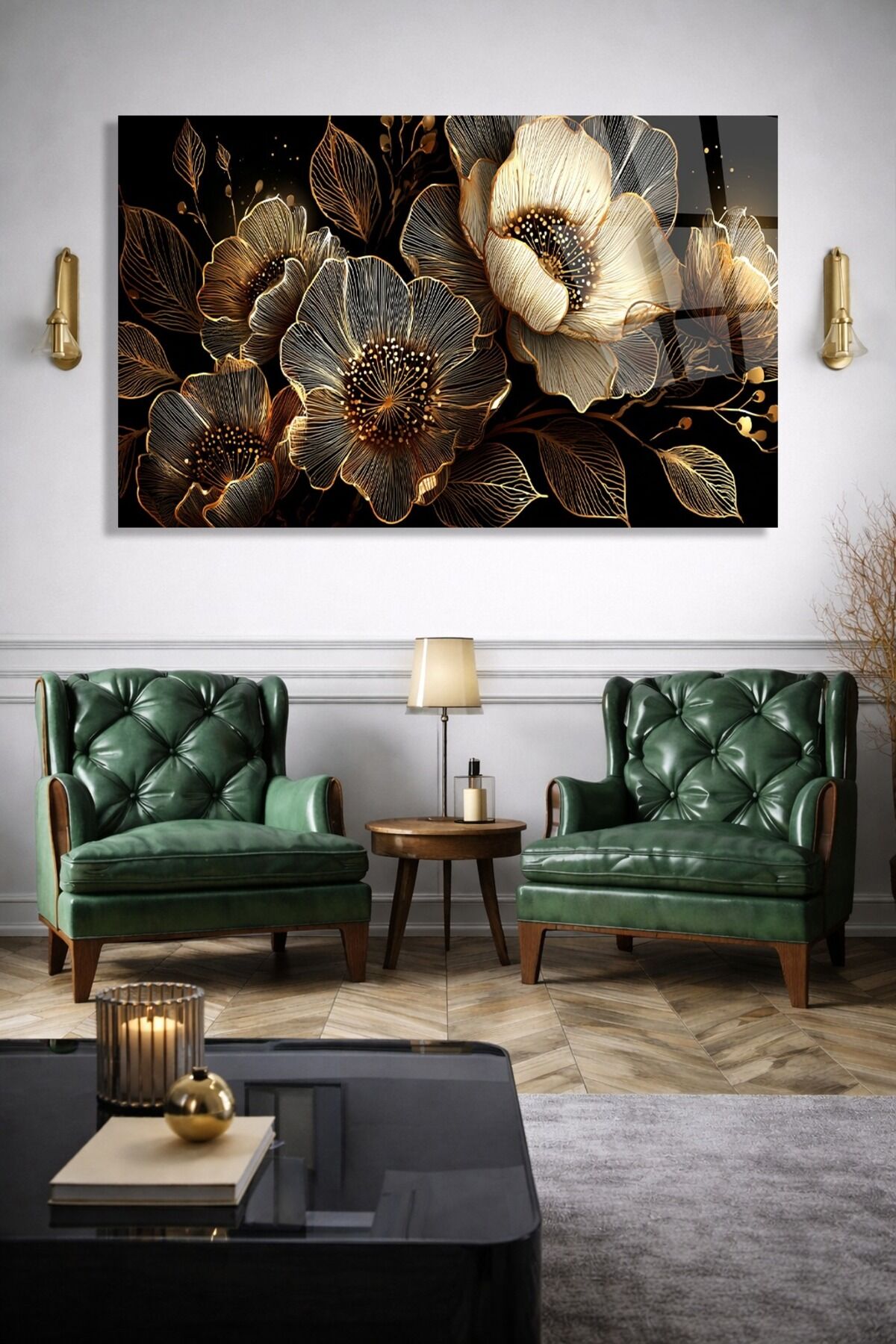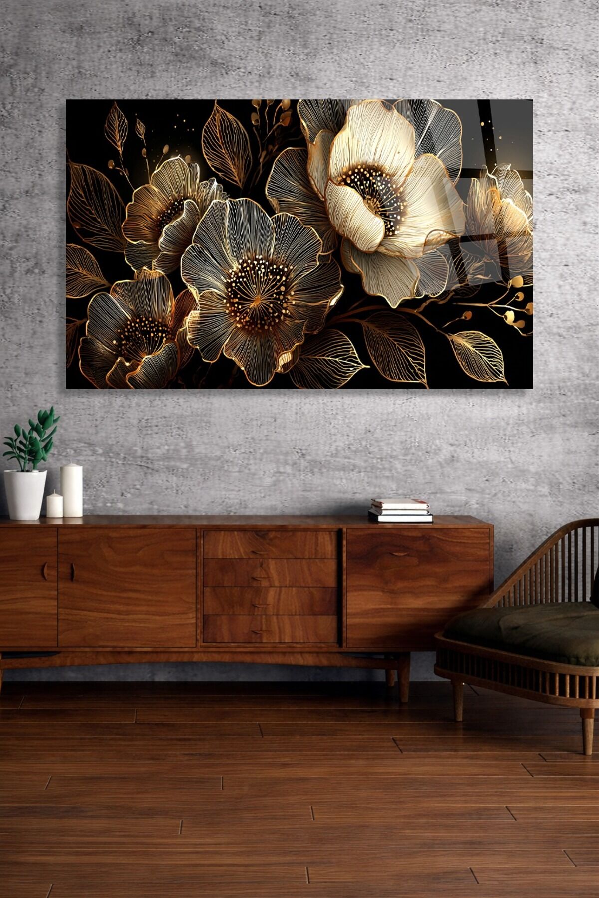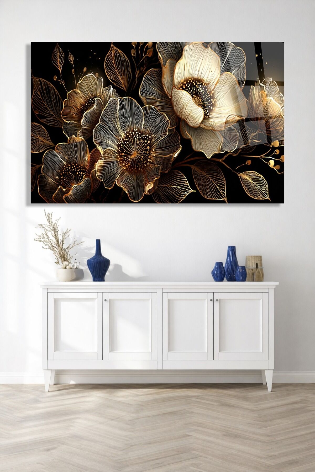 KIRILMAZ CAM TABLO GOLD ÇİÇEK DESENLİ LÜKS DUVAR TABLOSU Çok Renkli