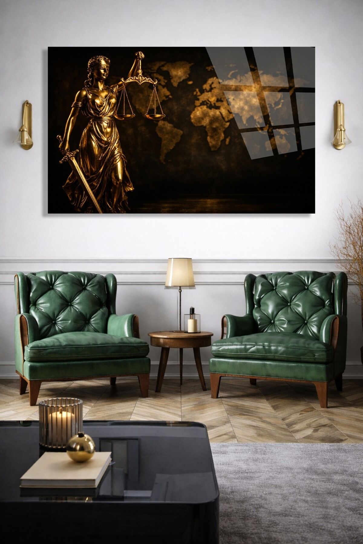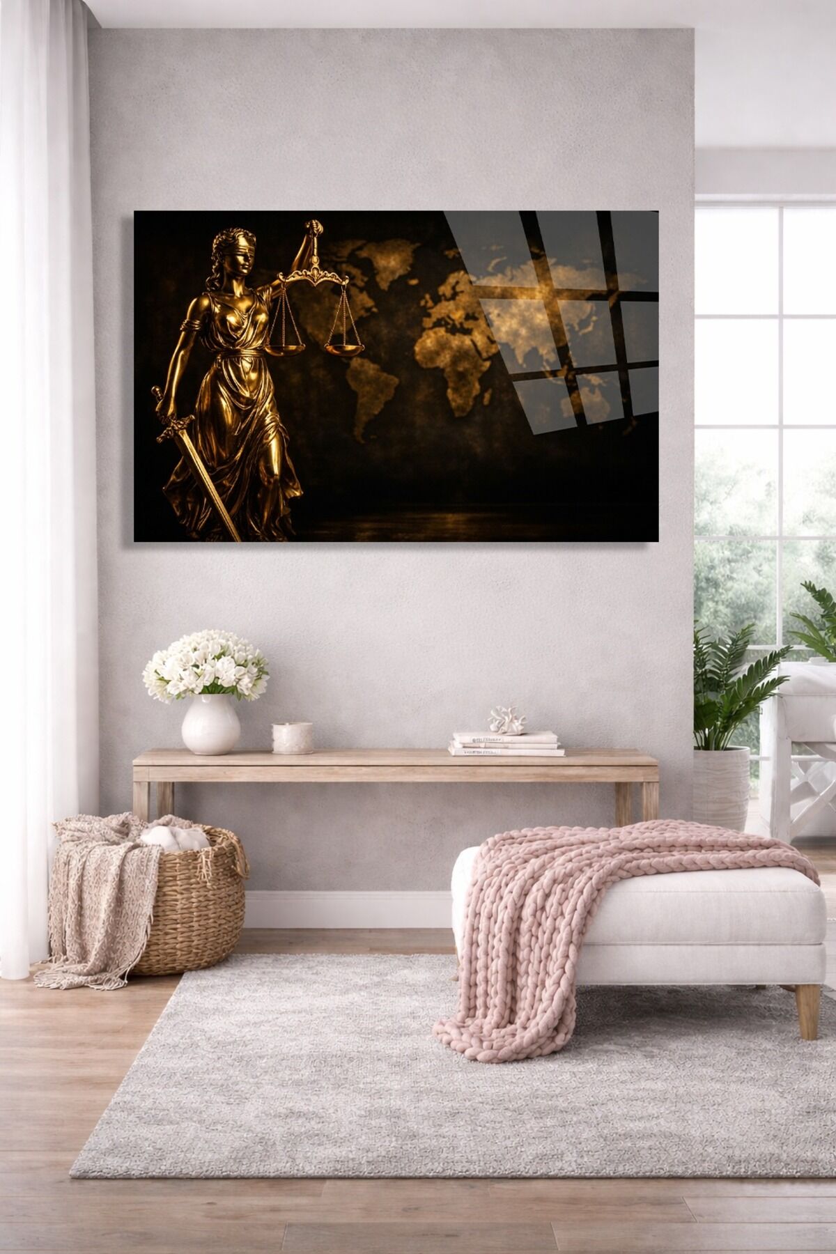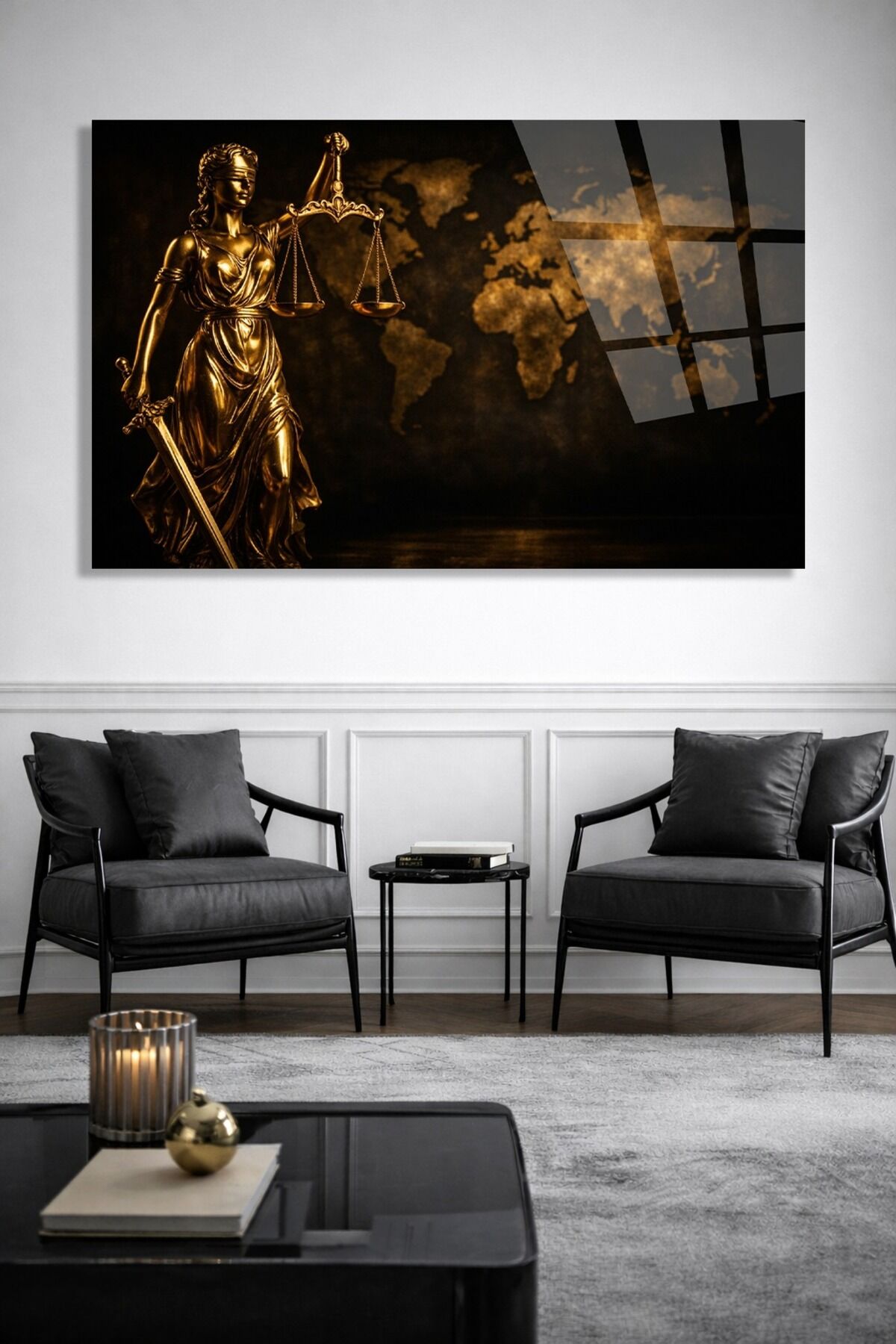 KIRILMAZ CAM TABLO GOLD THEMİS ADALET HEYKELİ DUVAR TABLOSU OFİS HEDİYESİ MODERN TABLO Altın