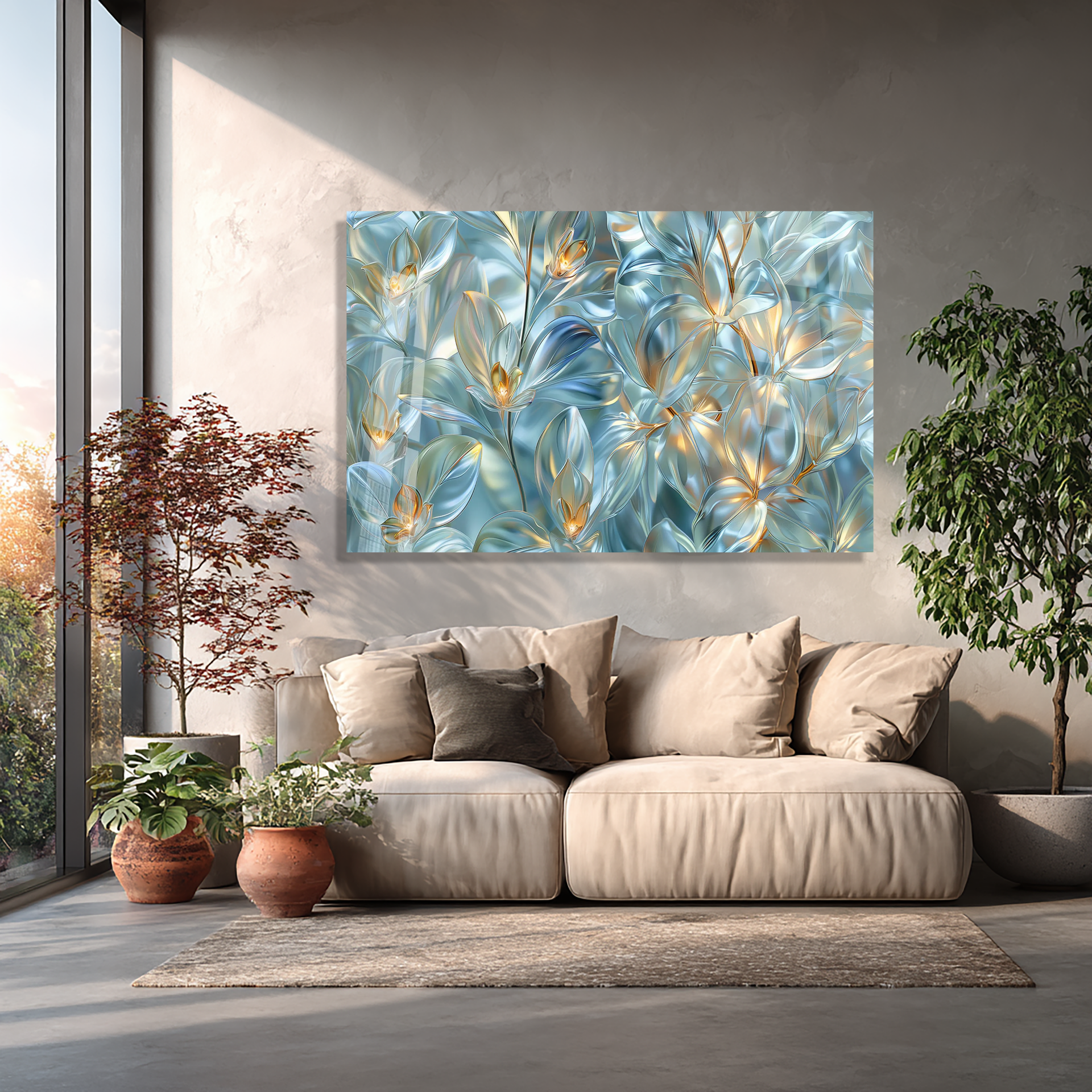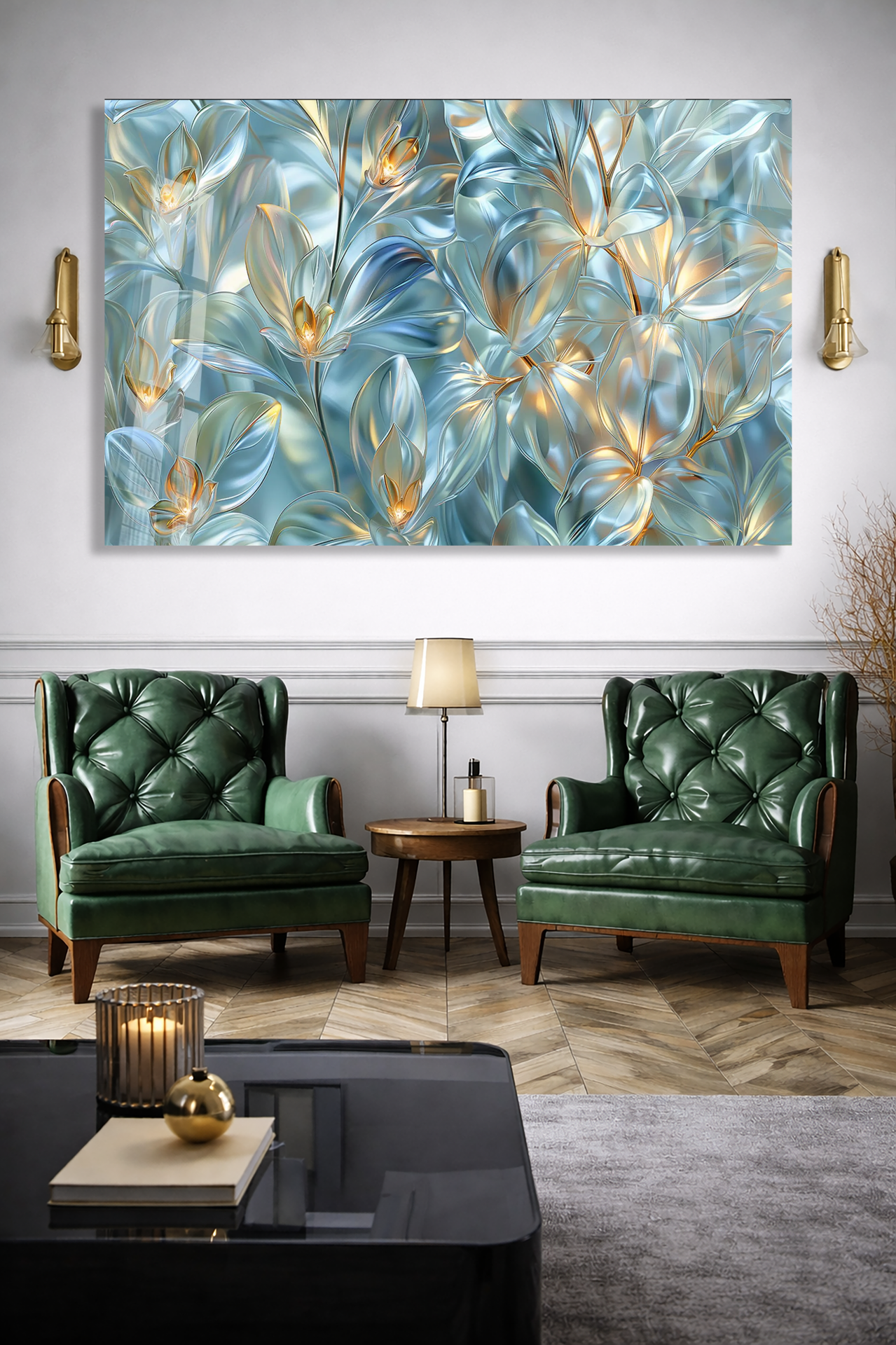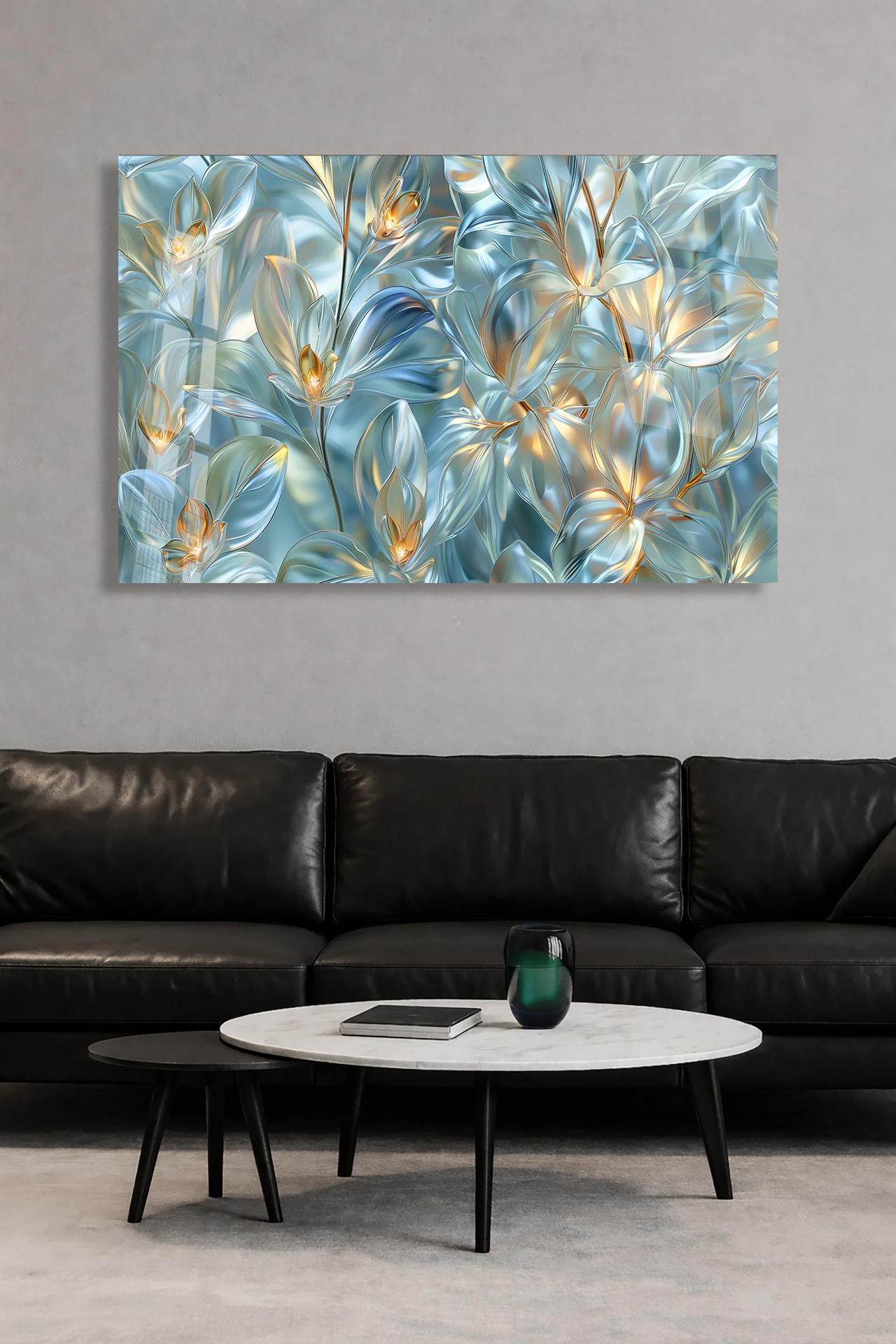 KIRILMAZ CAM TABLO MAVİ ALTIN ŞEFFAF ÇİÇEKLER LÜKS SOYUT DOĞA TASARIMI