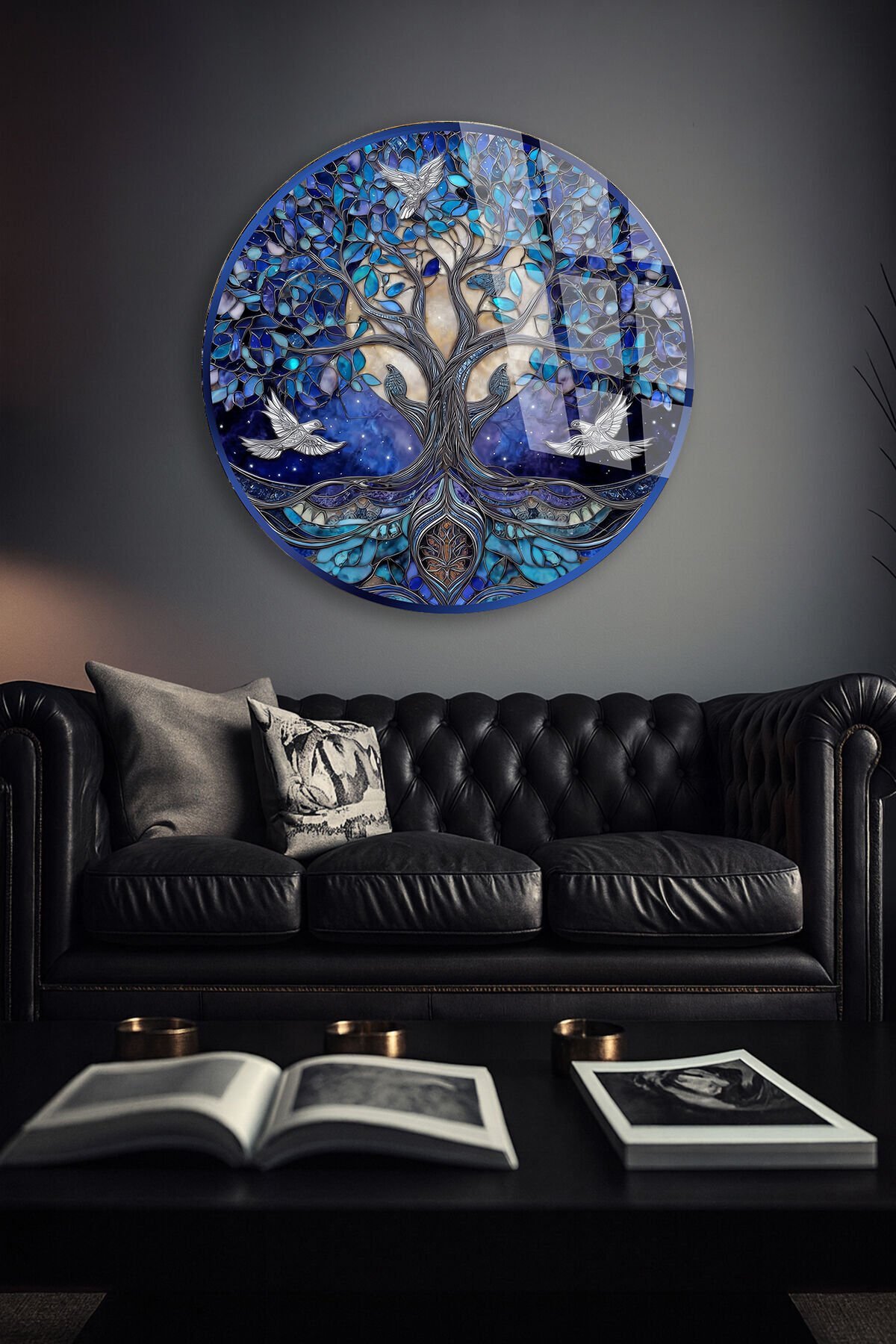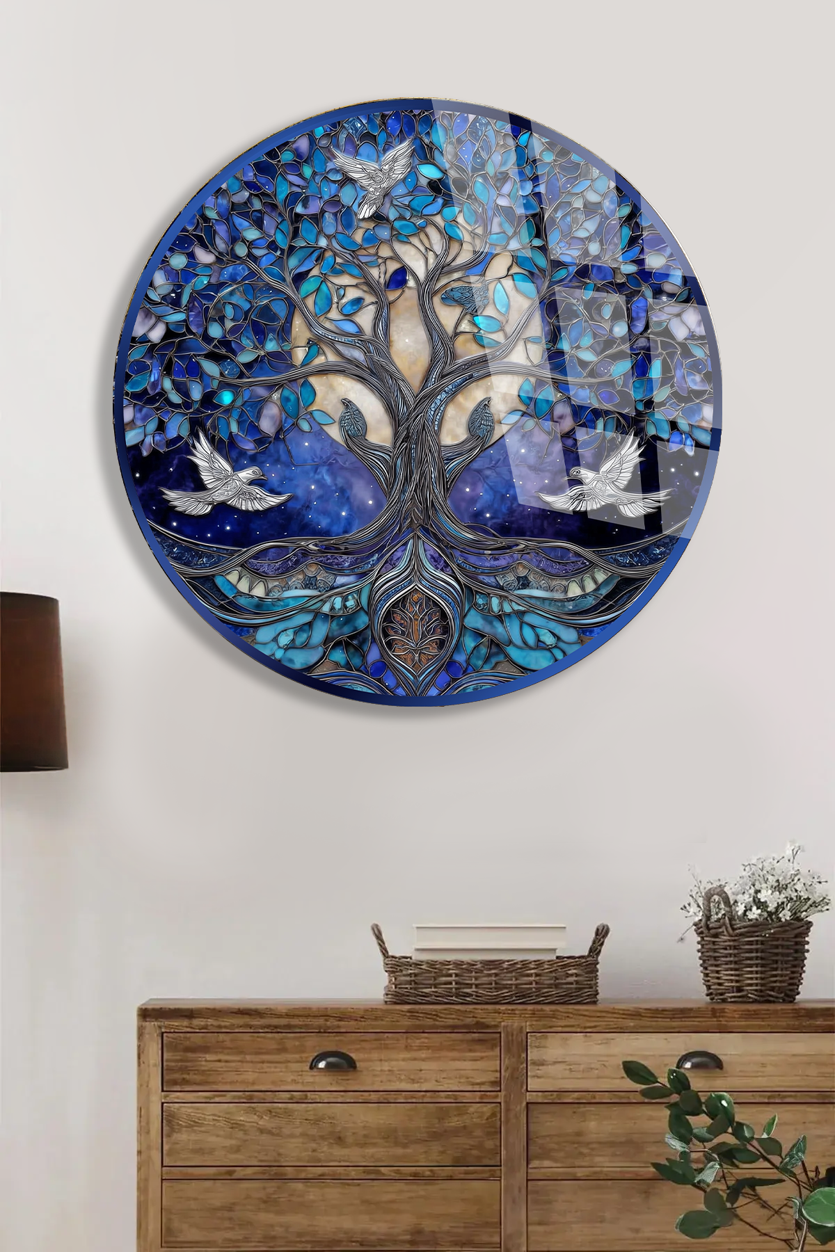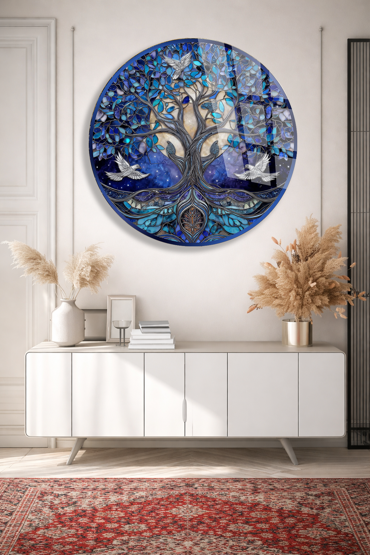 KIRILMAZ CAM TABLO – MAVİ HAYAT AĞACI VE BEYAZ KUŞLAR MOZAİK SANAT TASARIMI
