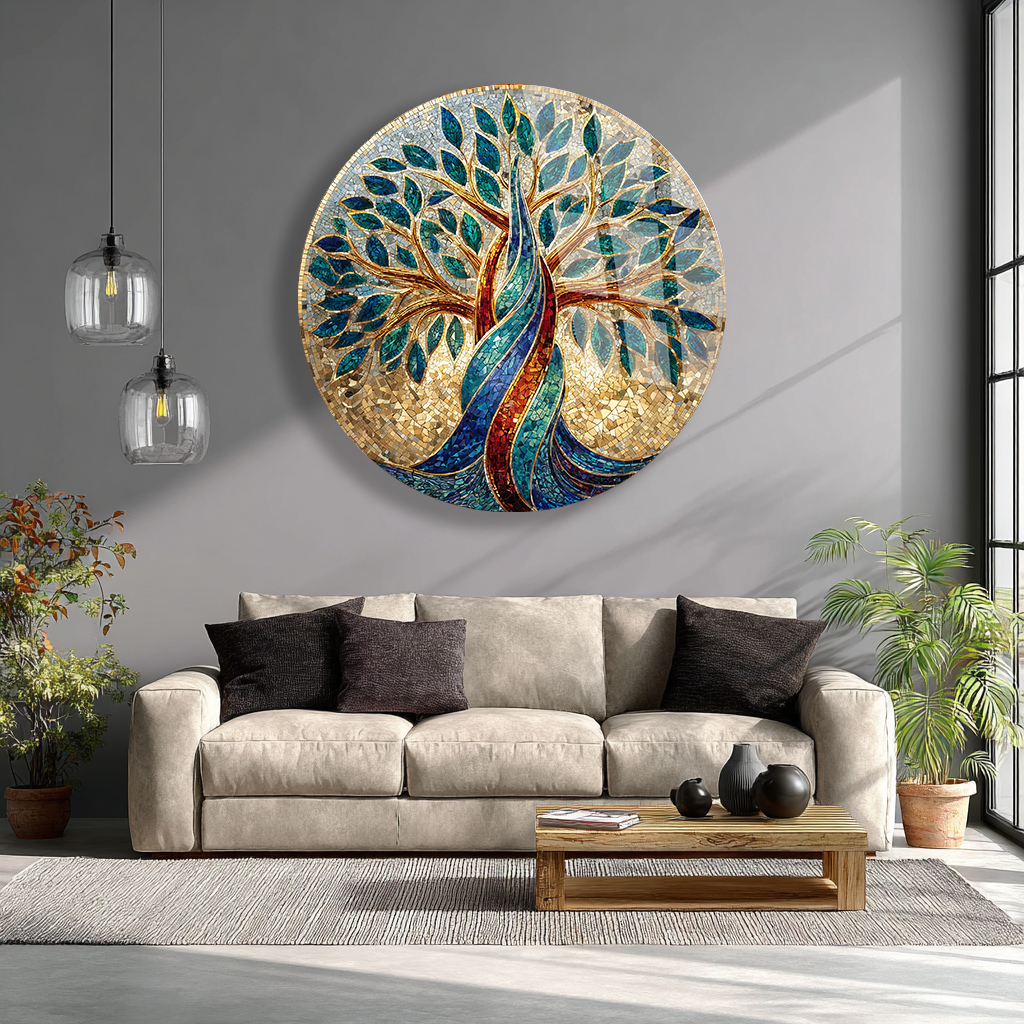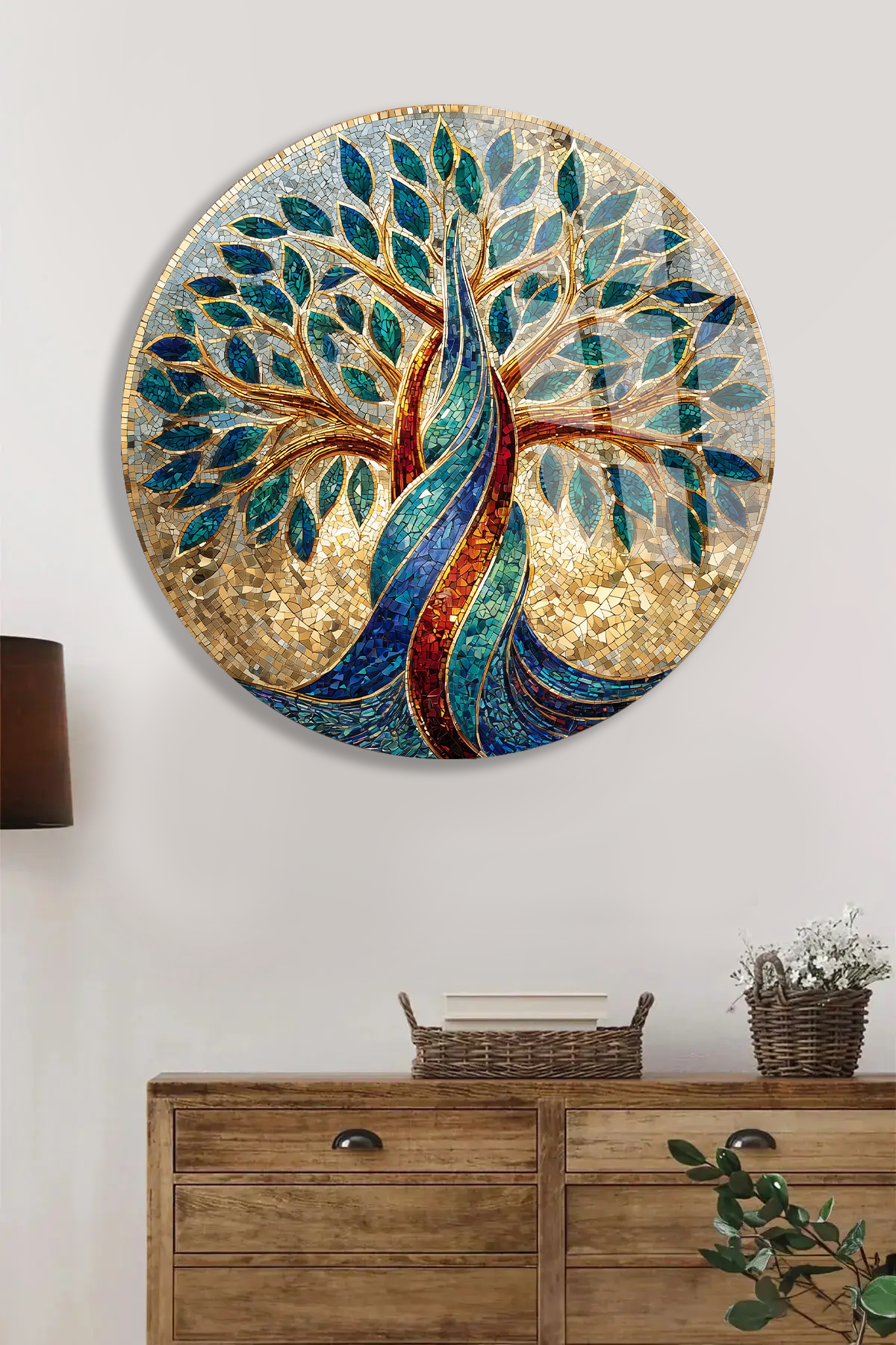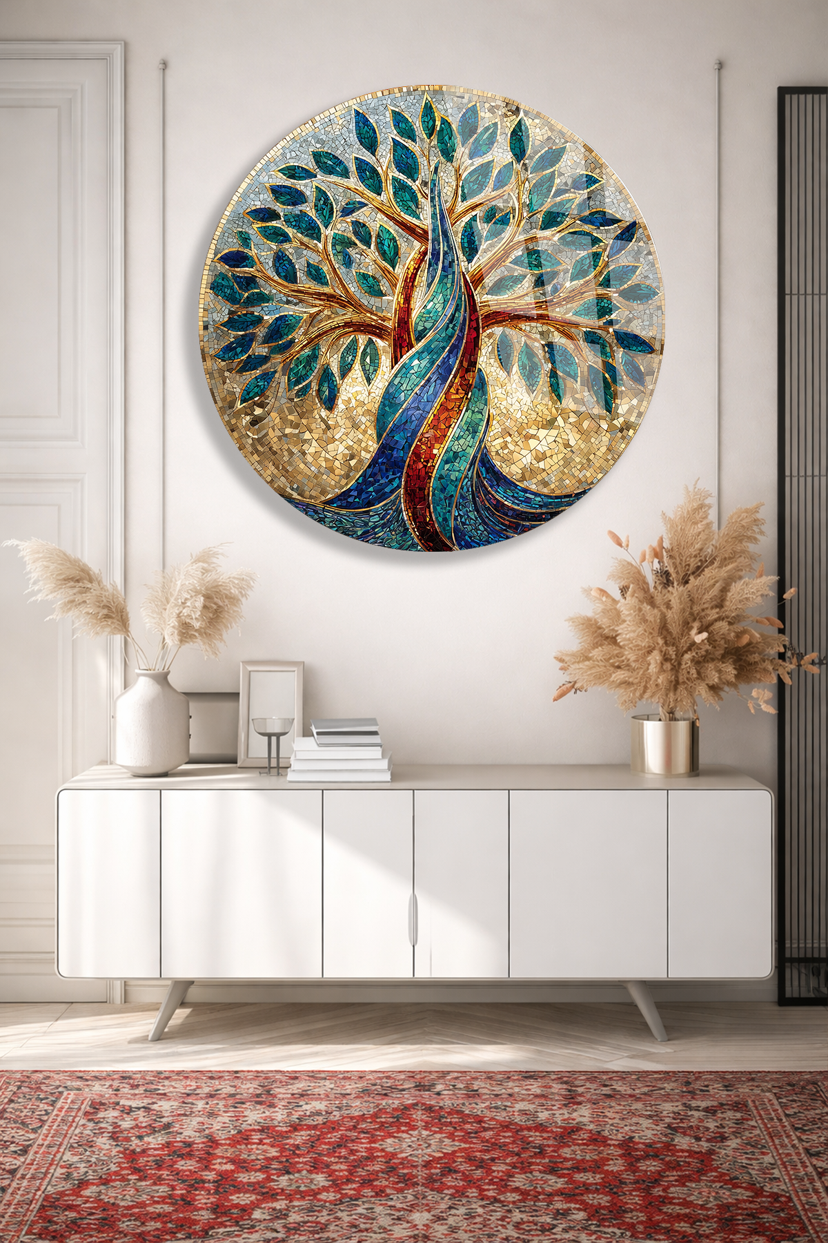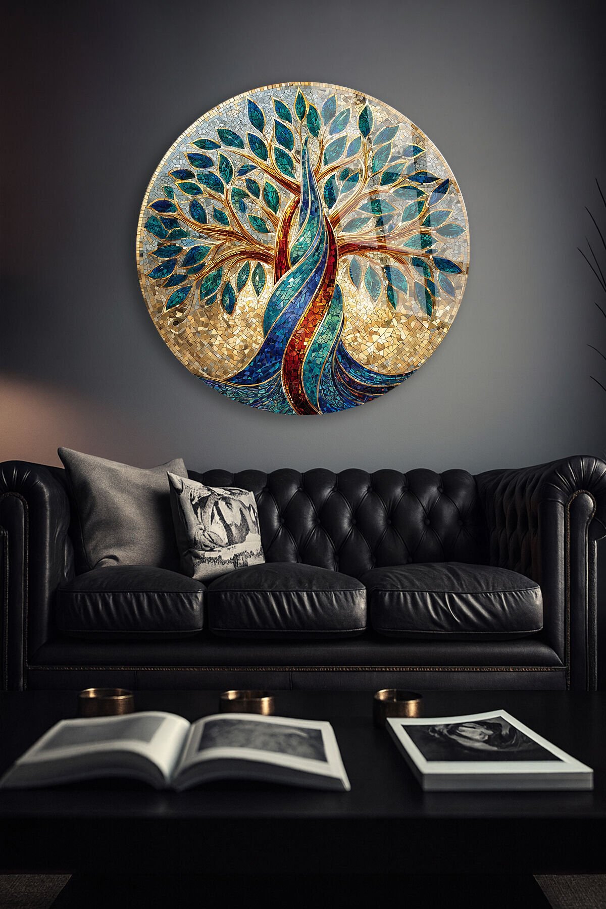 KIRILMAZ CAM TABLO – MAVİ VE ALTIN HAYAT AĞACI SOYUT SANAT TASARIMI